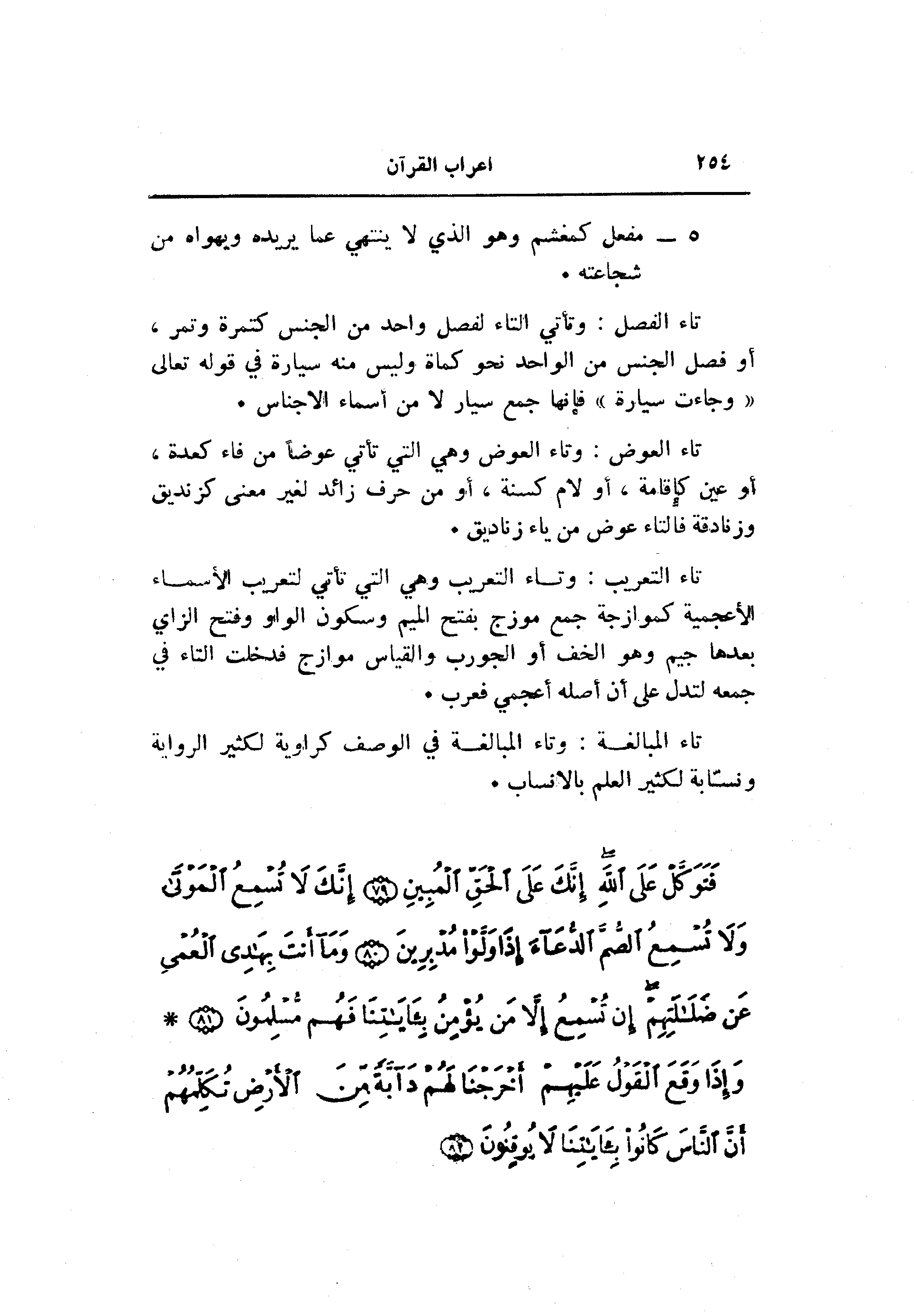 تاء الفصل: وتأتي التاء لفصل واحد من الجنس كتمرة وتمر، أو فصل الجنس من الواحد نحو كماة وليس منه سيارة في قوله تعالى «وجاءت سيارة» فإنها جمع سيار لا من أسماء الأجناس.