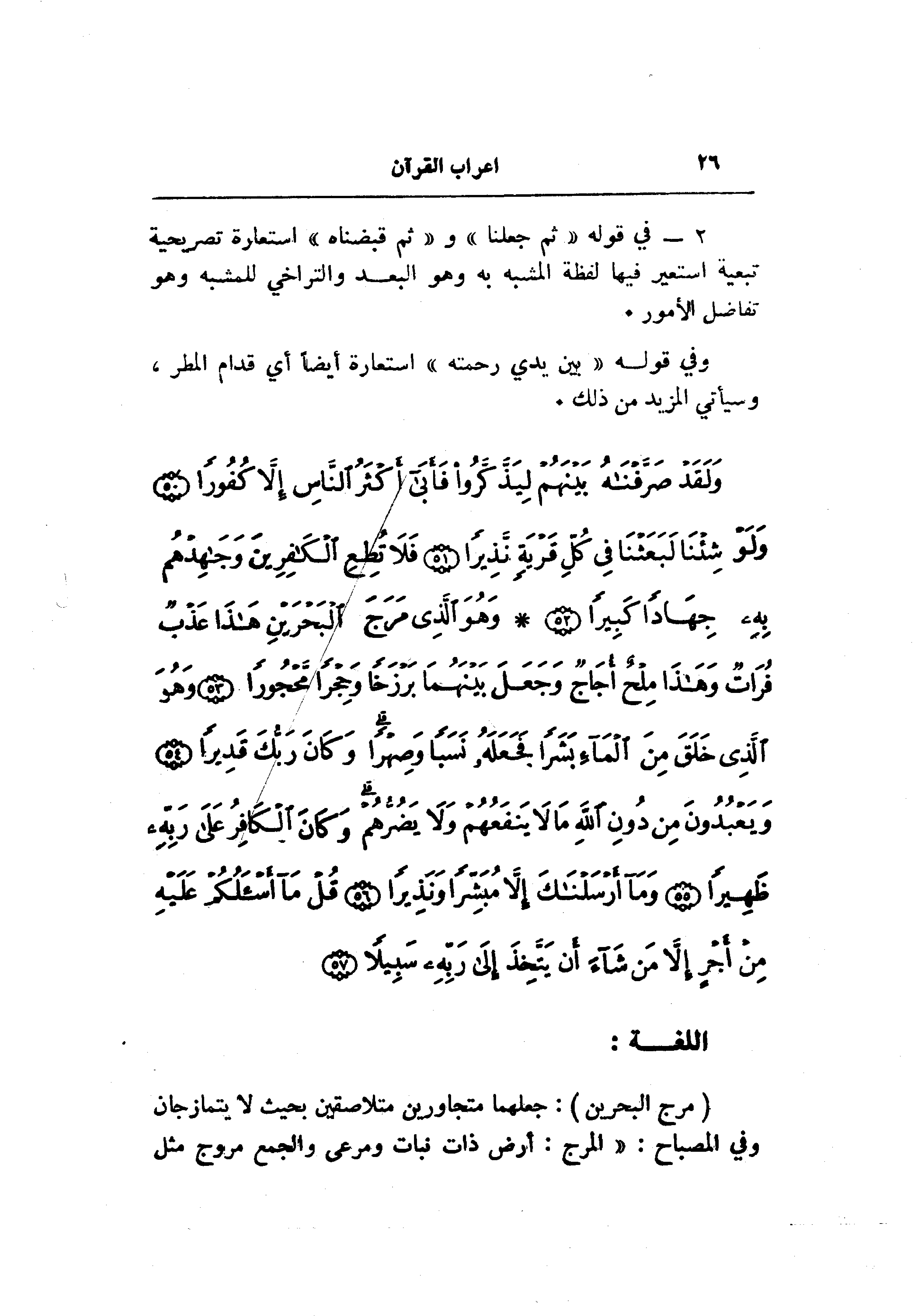 وَلَقَدْ صَرَّفْناهُ بَيْنَهُمْ لِيَذَّكَّرُوا فَأَبى أَكْثَرُ النَّاسِ إِلاَّ كُفُوراً (50) وَلَوْ شِئْنا لَبَعَثْنا فِي كُلِّ قَرْيَةٍ نَذِيراً (51) فَلا تُطِعِ الْكافِرِينَ وَجاهِدْهُمْ بِهِ جِهاداً كَبِيراً (52) وَهُوَ الَّذِي مَرَجَ الْبَحْرَيْنِ هذا عَذْبٌ فُراتٌ وَهذا مِلْحٌ أُجاجٌ وَجَعَلَ بَيْنَهُما بَرْزَخاً وَحِجْراً مَحْجُوراً (53) وَهُوَ الَّذِي خَلَقَ مِنَ الْماءِ بَشَراً فَجَعَلَهُ نَسَباً وَصِهْراً وَكانَ رَبُّكَ قَدِيراً (54)