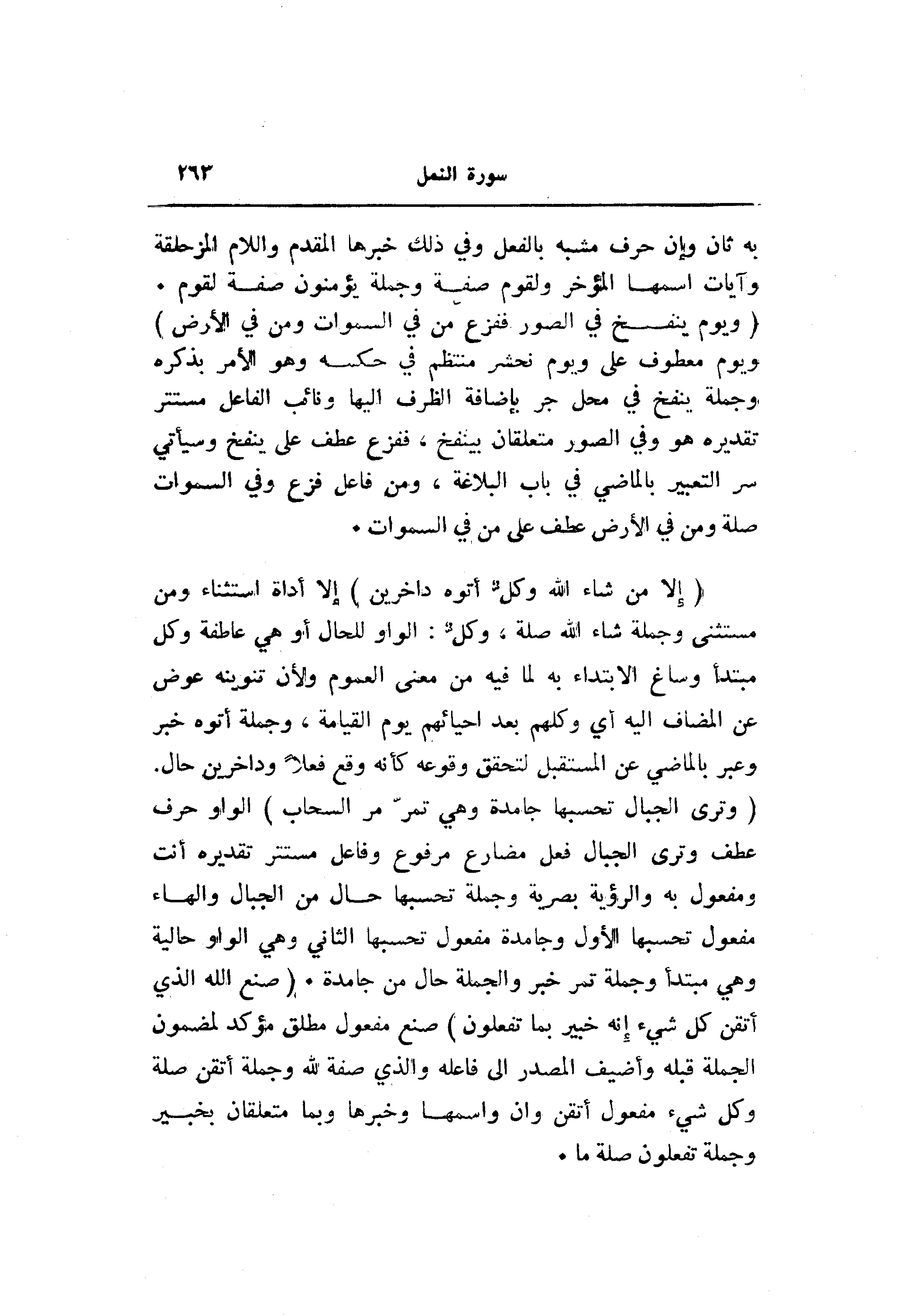 (وَتَرَى الْجِبالَ تَحْسَبُها جامِدَةً وَهِيَ تَمُرُّ مَرَّ السَّحابِ) الواو حرف عطف وترى الجبال فعل مضارع مرفوع وفاعل مستتر تقديره أنت ومفعول به والرؤية بصرية وجملة تحسبها حال من الجبال والهاء مفعول تحسبها الأول وجامدة مفعول تحسبها الثاني وهي الواو حالية وهي مبتدأ وجملة تمر خبر والجملة حال من جامدة. (صُنْعَ اللَّهِ الَّذِي أَتْقَنَ كُلَّ شَيْءٍ إِنَّهُ خَبِيرٌ بِما تَفْعَلُونَ) صنع مفعول مطلق مؤكد لمضمون الجملة قبله وأضيف المصدر الى فاعله والذي صفة لله وجملة أتقن صلة وكل شيء مفعول أتقن وان واسمها وخبرها وبما متعلقان بخبير وجملة تفعلون صلة ما.