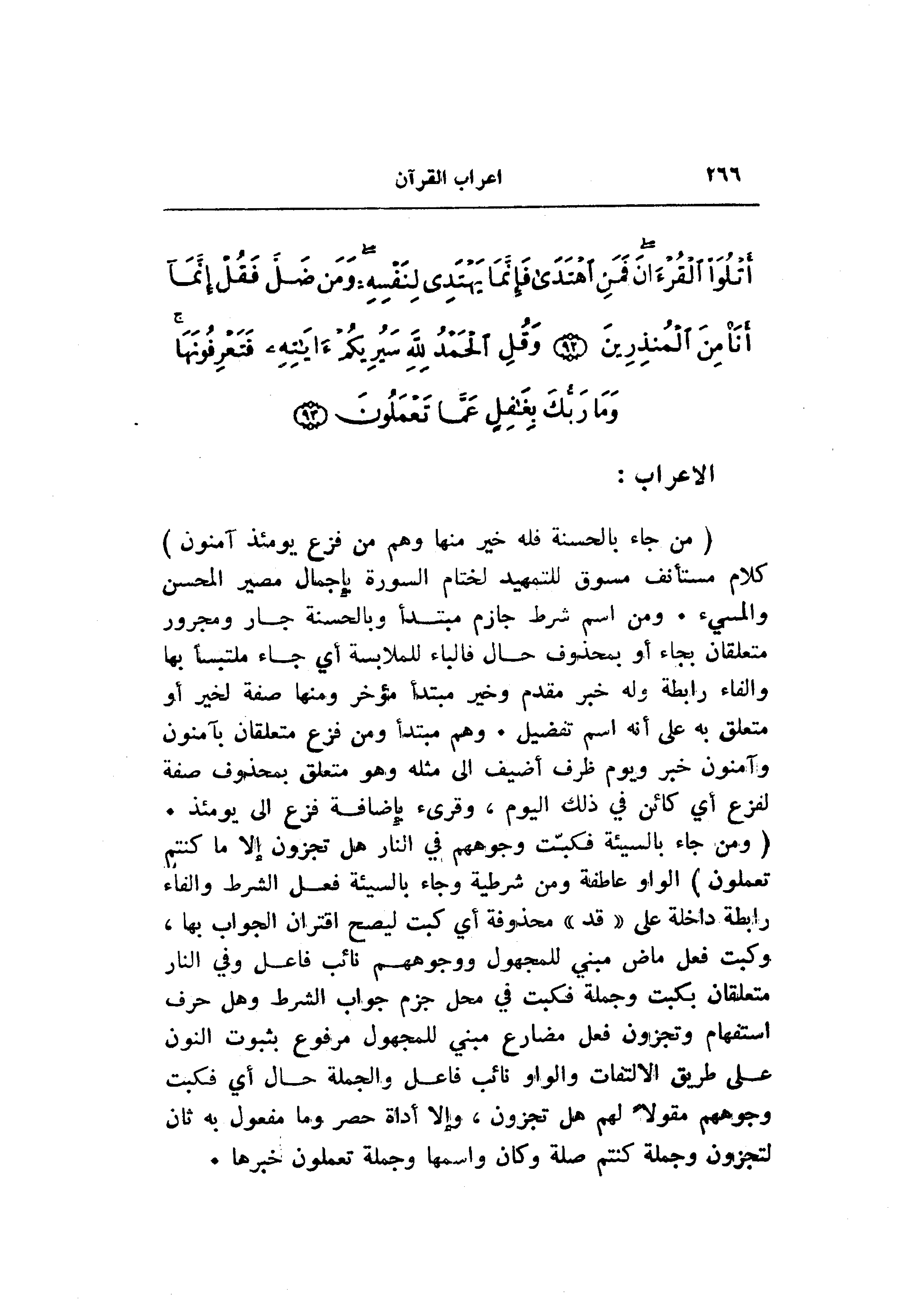 (وَمَنْ جاءَ بِالسَّيِّئَةِ فَكُبَّتْ وُجُوهُهُمْ فِي النَّارِ هَلْ تُجْزَوْنَ إِلَّا ما كُنْتُمْ تَعْمَلُونَ) الواو عاطفة ومن شرطية وجاء بالسيئة فعل الشرط والفاء رابطة داخلة على «قد» محذوفة أي كبت ليصح اقتران الجواب بها، وكبت فعل ماض مبني للمجهول ووجوههم نائب فاعل وفي النار متعلقان بكبت وجملة فكبت في محل جزم جواب الشرط وهل حرف استفهام وتجزون فعل مضارع مبني للمجهول مرفوع بثبوت النون على طريق الالتفات والواو نائب فاعل والجملة حال أي فكبت وجوههم مقولا لهم هل تجزون، وإلا أداة حصر وما مفعول به ثان لتجزون وجملة كنتم صلة وكان واسمها وجملة تعملون خبرها.