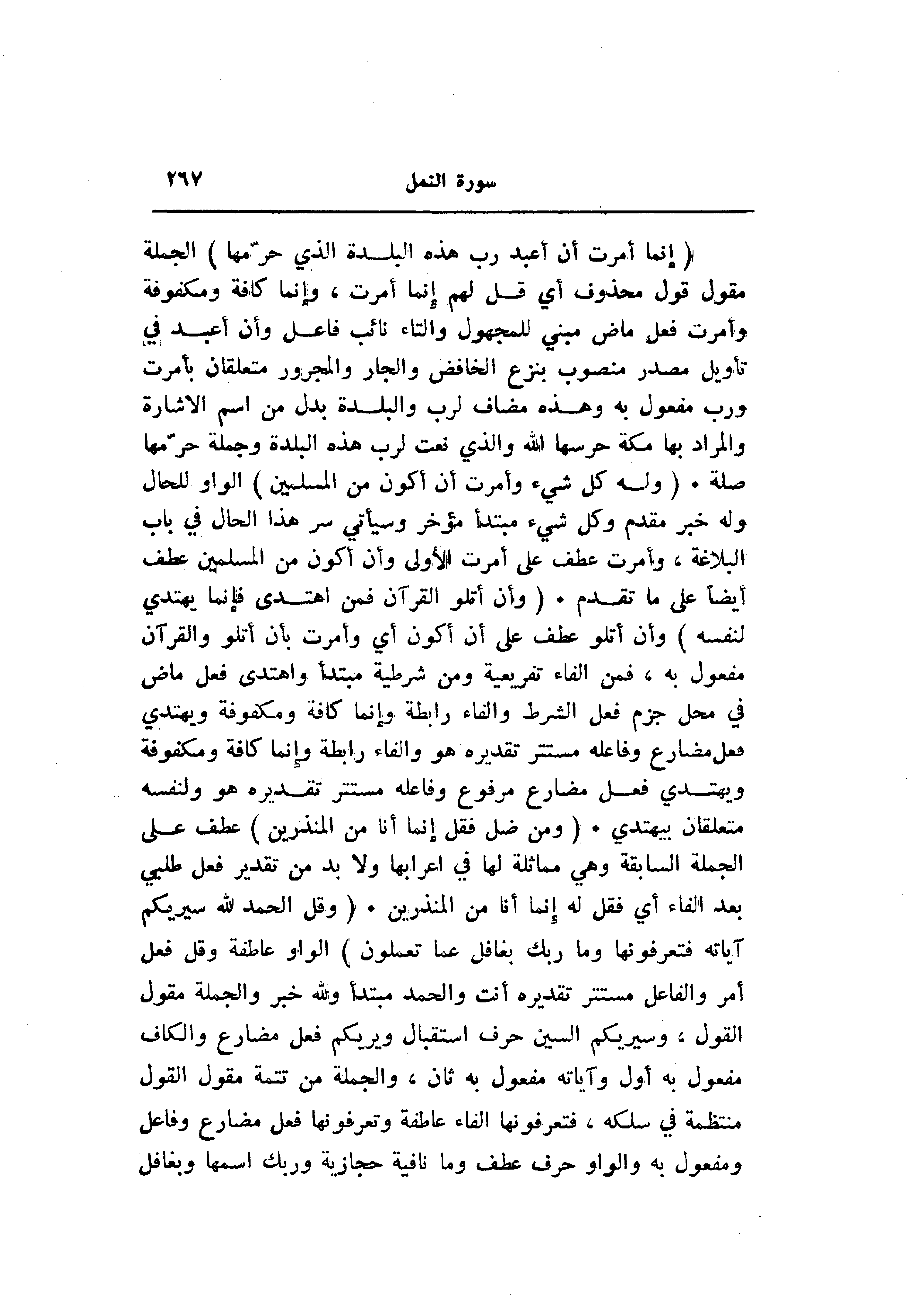 (إِنَّما أُمِرْتُ أَنْ أَعْبُدَ رَبَّ هذِهِ الْبَلْدَةِ الَّذِي حَرَّمَها) الجملة مقول قول محذوف أي قل لهم إنما أمرت، وإنما كافة ومكفوفة وأمرت فعل ماض مبني للمجهول والتاء نائب فاعل وأن أعبد في تأويل مصدر منصوب بنزع الخافض والجار والمجرور متعلقان بأمرت ورب مفعول به وهذه مضاف لرب والبلدة بدل من اسم الاشارة والمراد بها مكة حرسها الله والذي نعت لرب هذه البلدة وجملة حرّمها صلة. (وَلَهُ كُلُّ شَيْءٍ وَأُمِرْتُ أَنْ أَكُونَ مِنَ الْمُسْلِمِينَ) الواو للحال وله خبر مقدم وكل شيء مبتدأ مؤخر وسيأتي سر هذا الحال في باب البلاغة، وأمرت عطف على أمرت الأولى وأن أكون من المسلمين عطف أيضا على ما تقدم. (وَأَنْ أَتْلُوَا الْقُرْآنَ فَمَنِ اهْتَدى فَإِنَّما يَهْتَدِي لِنَفْسِهِ) وأن أتلو عطف على أن أكون أي وأمرت بأن أتلو والقرآن مفعول به، فمن الفاء تفريعية ومن شرطية مبتدأ واهتدى فعل ماض في محل جزم فعل الشرط والفاء رابطة وإنما كافة ومكفوفة ويهتدي فعل مضارع وفاعله مستتر تقديره هو والفاء رابطة وإنما كافة ومكفوفة ويهتدي فعل مضارع مرفوع وفاعله مستتر تقديره هو ولنفسه متعلقان بيهتدي. (وَمَنْ ضَلَّ فَقُلْ إِنَّما أَنَا مِنَ الْمُنْذِرِينَ) عطف على الجملة السابقة وهي مماثلة لها في اعرابها ولا بد من تقدير فعل طلبي بعد الفاء أي فقل له إنما أنا من المنذرين. (وَقُلِ الْحَمْدُ لِلَّهِ سَيُرِيكُمْ آياتِهِ فَتَعْرِفُونَها وَما رَبُّكَ بِغافِلٍ عَمَّا تَعْمَلُونَ) الواو عاطفة وقل فعل أمر والفاعل مستتر تقديره أنت والحمد مبتدأ ولله خبر والجملة مقول القول، وسيريكم السين حرف استقبال ويريكم فعل مضارع والكاف مفعول به أول وآياته مفعول به ثان، والجملة من تتمة مقول القول منتظمة في سلكه، فتعرفونها الفاء عاطفة وتعرفونها فعل مضارع وفاعل ومفعول به والواو حرف عطف وما نافية حجازية وربك اسمها وبغافل