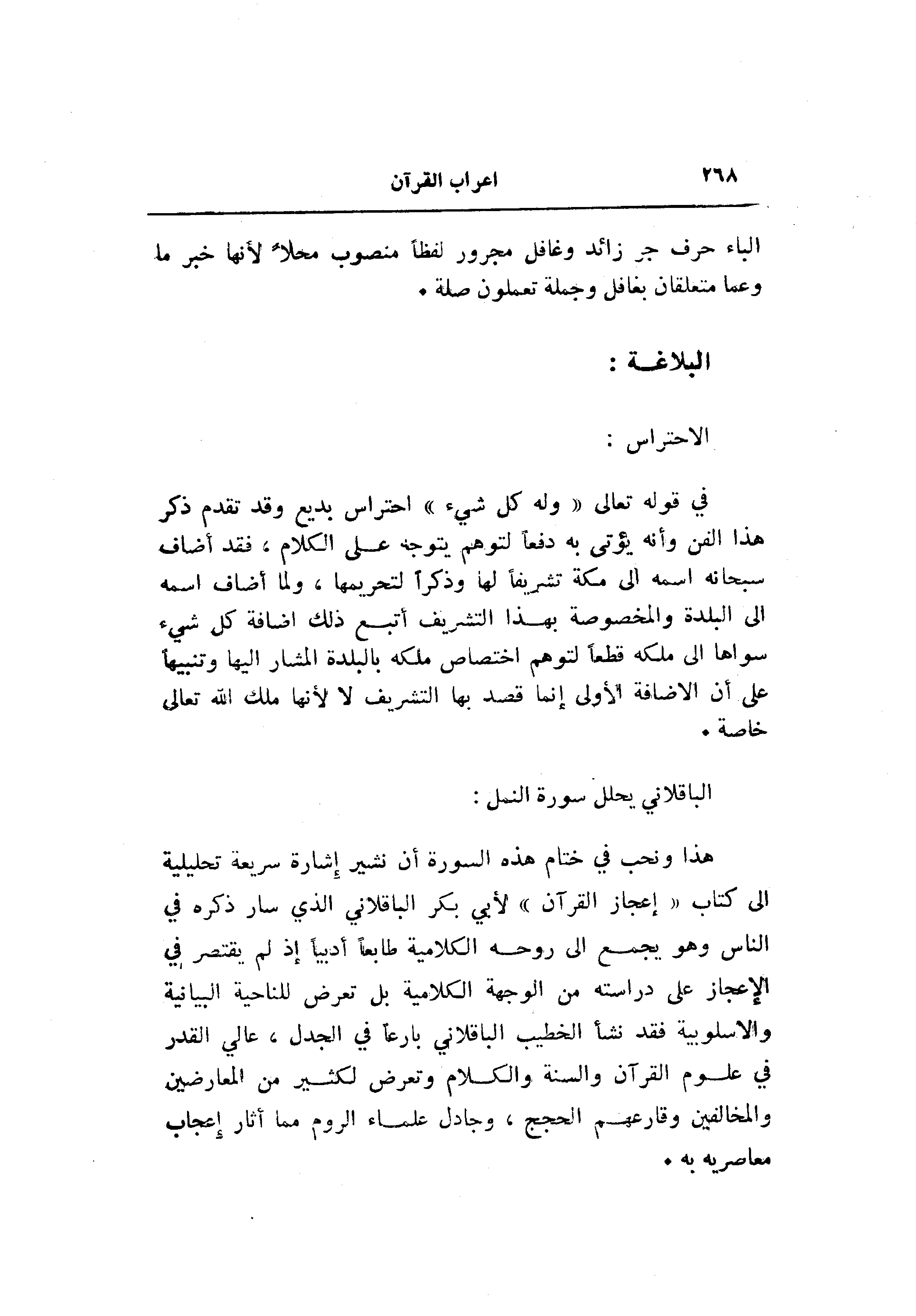هذا ونحب في ختام هذه السورة أن نشير إشارة سريعة تحليلية الى كتاب «إعجاز القرآن» لأبي بكر الباقلاني الذي سار ذكره في الناس وهو يجمع الى روحه الكلامية طابعا أديبا إذ لم يقتصر في الإعجاز على دراسته من الوجهة الكلامية بل تعرض للناحية البيانية والاسلوبية فقد نشأ الخطيب الباقلاني بارعا في الجدل، عالي القدر في علوم القرآن والسنة والكلام وتعرض لكثير من المعارضين والمخالفين وقارعهم الحجج، وجادل علماء الروم مما أثار إعجاب معاصريه به.