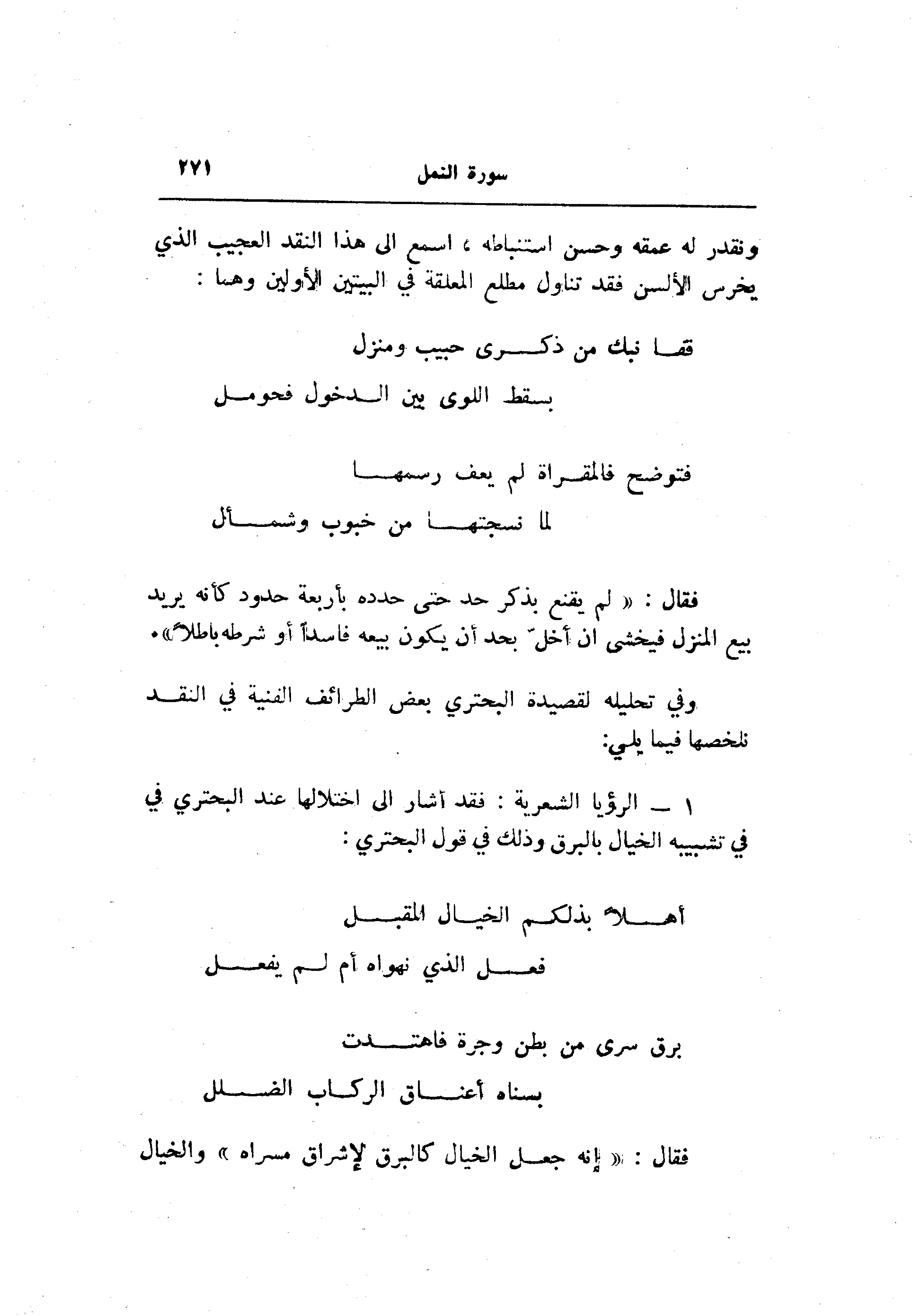 وفي تحليله لقصيدة البحتري بعض الطرائف الفنية في النقد نلخصها فيما يلي: