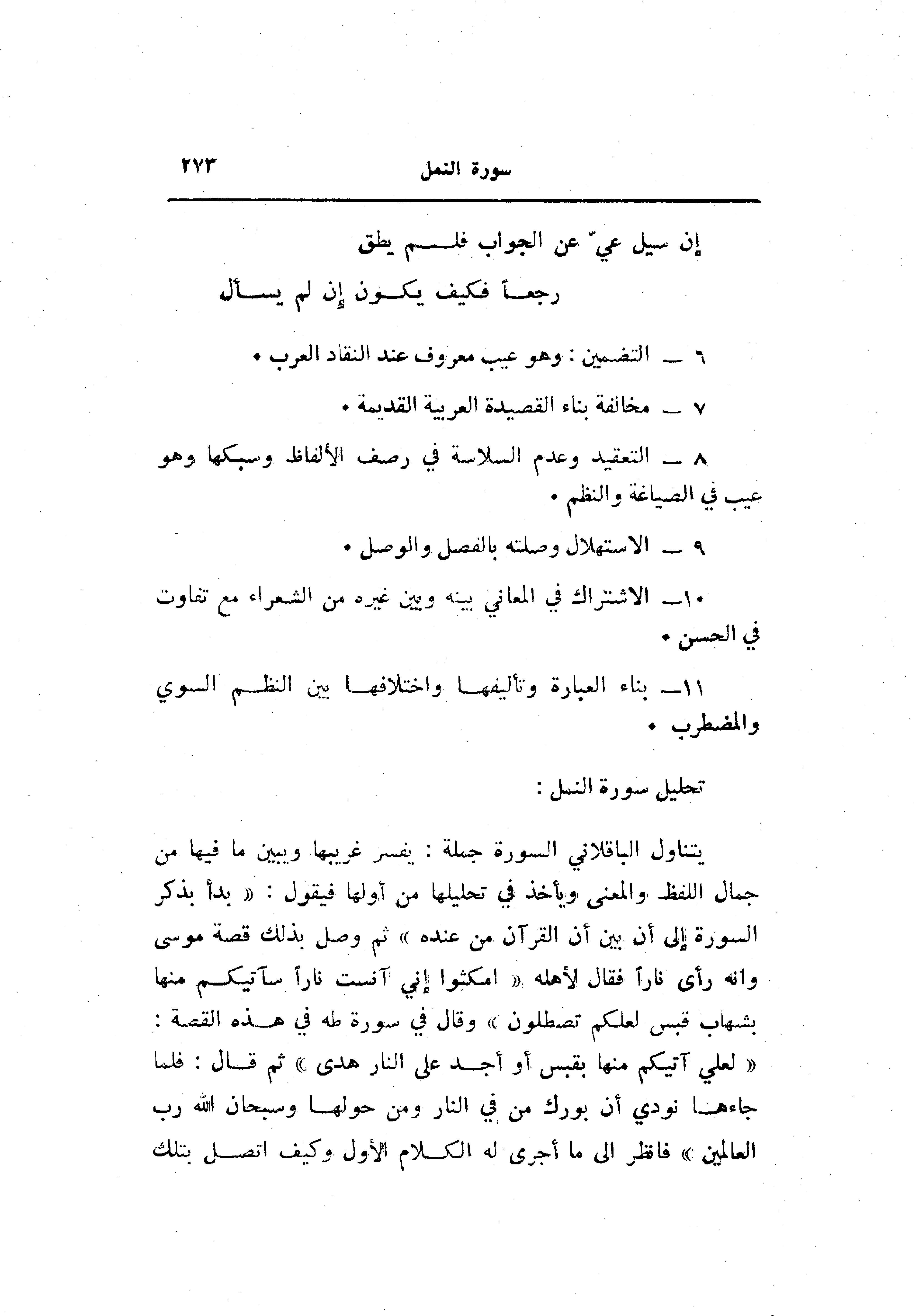 يتناول الباقلاني السورة جملة: يفسر غريبها ويبين ما فيها من جمال اللفظ والمعنى ويأخذ في تحليلها من أولها فيقول: «بدأ بذكر السورة إلى أن بين أن القرآن من عنده» ثم وصل بذلك قصة موسى وانه رأى نارا فقال لأهله «امكثوا إني آنست نارا سآتيكم منها بشهاب قبس لعلكم تصطلون» وقال في سورة طه في هذه القصة: