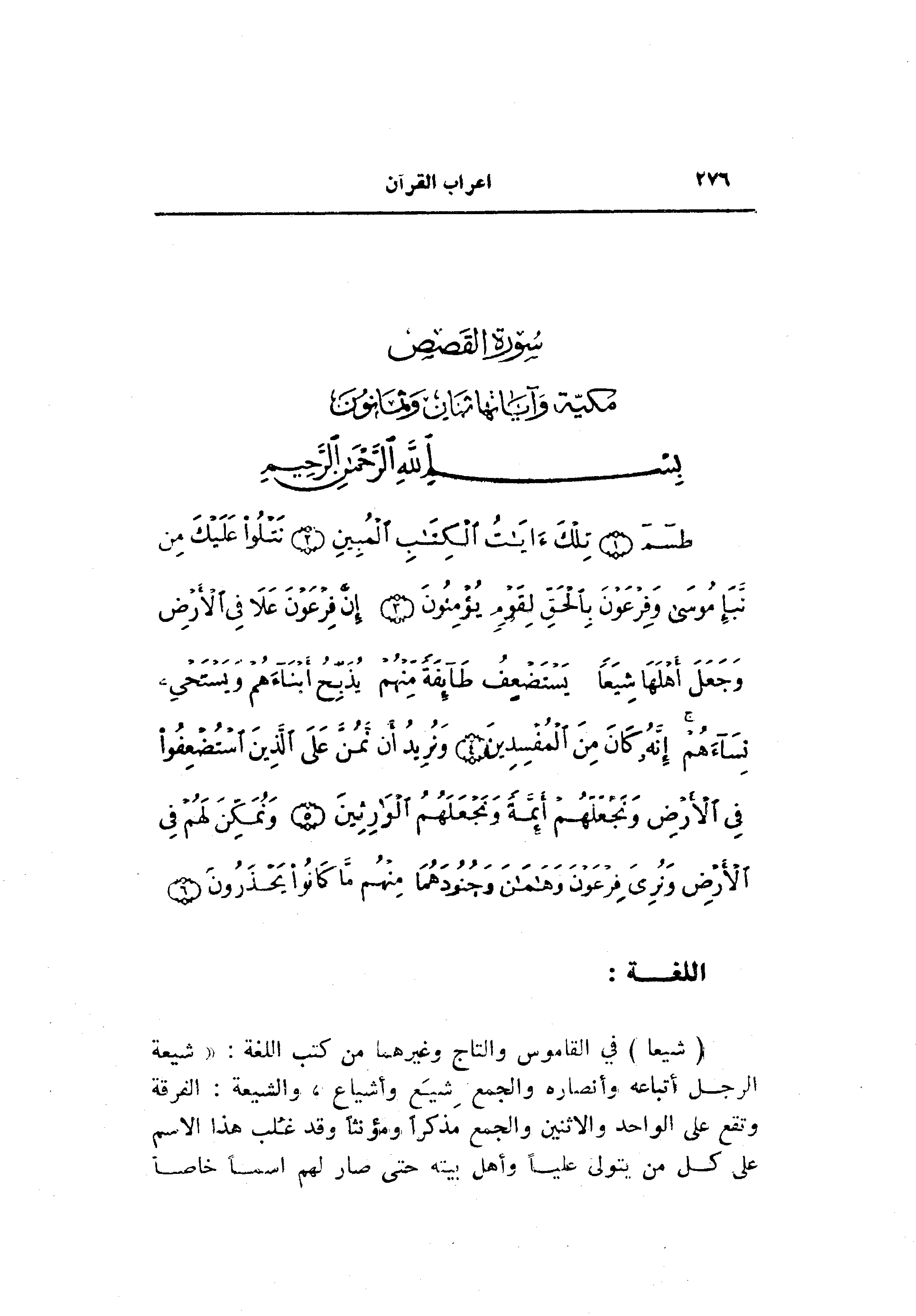 طسم (1) تِلْكَ آياتُ الْكِتابِ الْمُبِينِ (2) نَتْلُوا عَلَيْكَ مِنْ نَبَإِ مُوسى وَفِرْعَوْنَ بِالْحَقِّ لِقَوْمٍ يُؤْمِنُونَ (3) إِنَّ فِرْعَوْنَ عَلا فِي الْأَرْضِ وَجَعَلَ أَهْلَها شِيَعاً يَسْتَضْعِفُ طائِفَةً مِنْهُمْ يُذَبِّحُ أَبْناءَهُمْ وَيَسْتَحْيِي نِساءَهُمْ إِنَّهُ كانَ مِنَ الْمُفْسِدِينَ (4)