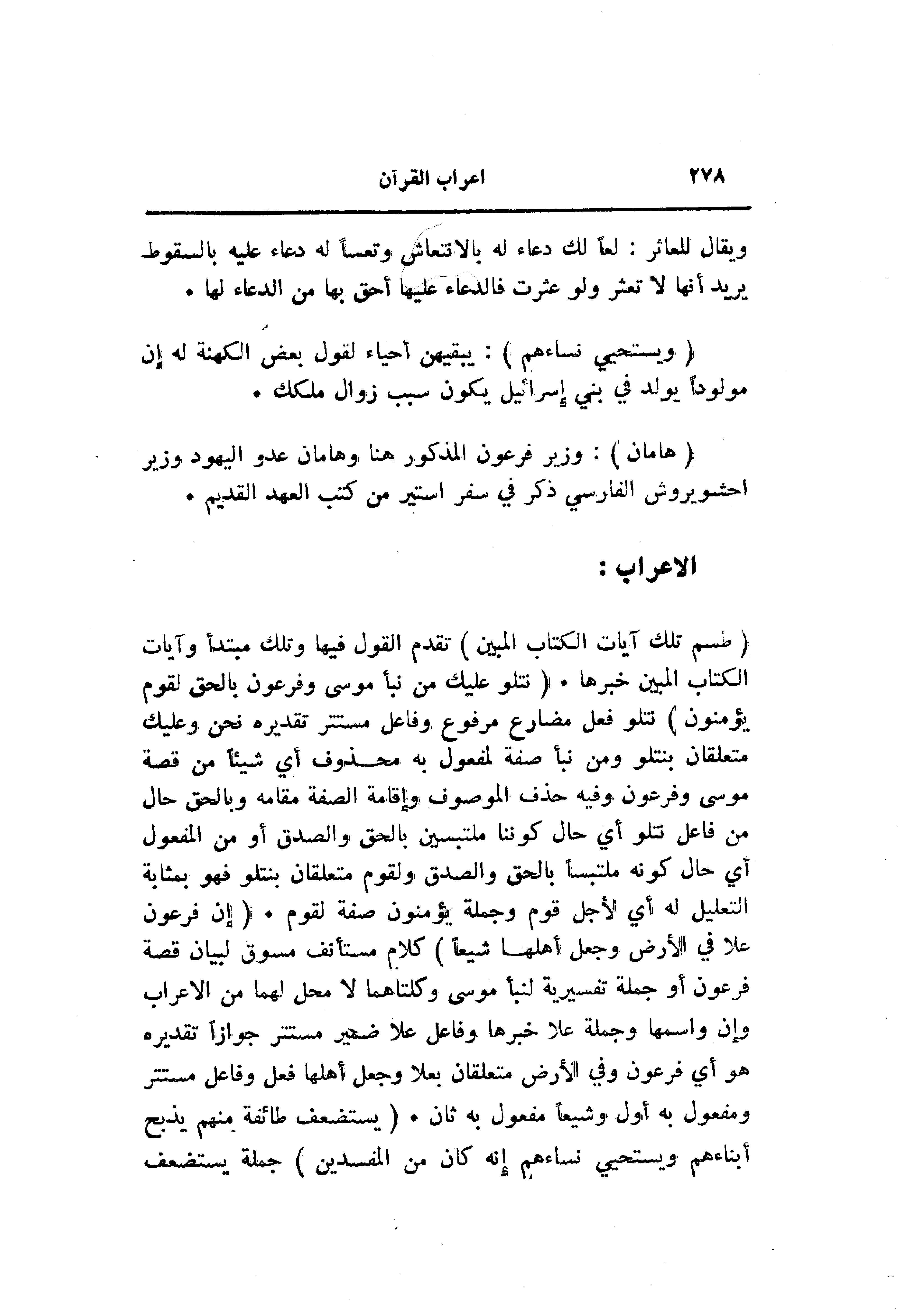 (طسم تِلْكَ آياتُ الْكِتابِ الْمُبِينِ) تقدم القول فيها وتلك مبتدأ وآيات الكتاب المبين خبرها. (نَتْلُوا عَلَيْكَ مِنْ نَبَإِ مُوسى وَفِرْعَوْنَ بِالْحَقِّ لِقَوْمٍ يُؤْمِنُونَ) نتلو فعل مضارع مرفوع وفاعل مستتر تقديره نحن وعليك متعلقان بنتلو ومن نبأ صفة لمفعول به محذوف أي شيئا من قصة موسى وفرعون وفيه حذف الموصوف وإقامة الصفة مقامه وبالحق حال من فاعل نتلو أي حال كوننا ملتبسين بالحق والصدق أو من المفعول أي حال كونه ملتبسا بالحق والصدق ولقوم متعلقان بنتلو فهو بمثابة التعليل له أي لأجل قوم وجملة يؤمنون صفة لقوم. (إِنَّ فِرْعَوْنَ عَلا فِي الْأَرْضِ وَجَعَلَ أَهْلَها شِيَعاً) كلام مستأنف مسوق لبيان قصة فرعون أو جملة تفسيرية لنبأ موسى وكلتاهما لا محل لهما من الاعراب وإن واسمها وجملة علا خبرها وفاعل علا ضمير مستتر جوازا تقديره هو أي فرعون وفي الأرض متعلقان بعلا وجعل أهلها فعل وفاعل مستتر ومفعول به أول وشيعا مفعول به ثان. (يَسْتَضْعِفُ طائِفَةً مِنْهُمْ يُذَبِّحُ أَبْناءَهُمْ وَيَسْتَحْيِي نِساءَهُمْ إِنَّهُ كانَ مِنَ الْمُفْسِدِينَ) جملة يستضعف