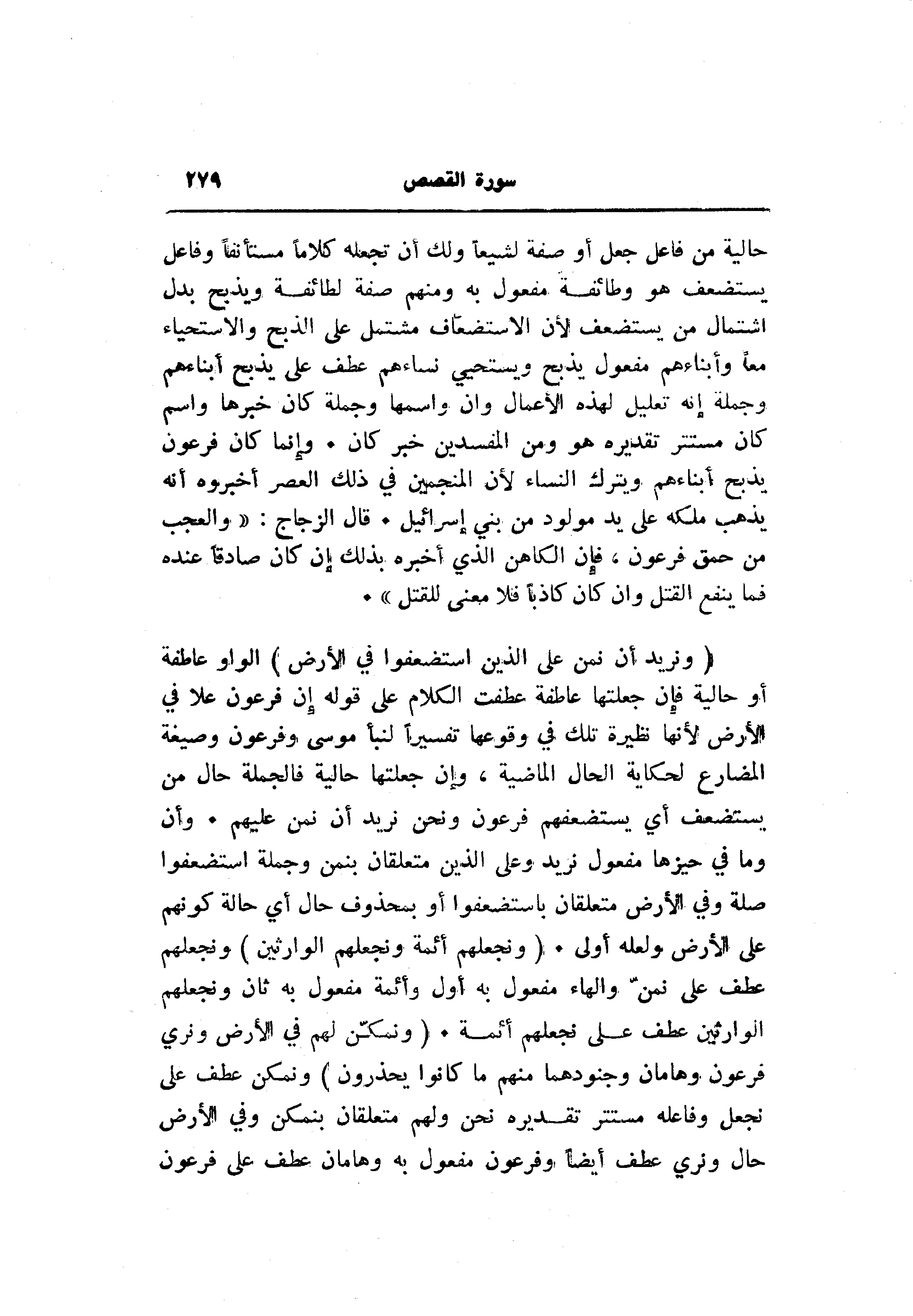 (وَنُرِيدُ أَنْ نَمُنَّ عَلَى الَّذِينَ اسْتُضْعِفُوا فِي الْأَرْضِ) الواو عاطفة أو حالية فإن جعلتها عاطفة عطفت الكلام على قوله إن فرعون علا في الأرض لأنها نظيرة تلك في وقوعها تفسيرا لنبأ موسى وفرعون وصيغة المضارع لحكاية الحال الماضية، وإن جعلتها حالية فالجملة حال من يستضعف أي يستضعفهم فرعون ونحن نريد أن نمن عليهم. وأن وما في حيزها مفعول نريد وعلى الذين متعلقان بنمن وجملة استضعفوا صلة وفي الأرض متعلقان باستضعفوا أو بمحذوف حال أي حالة كونهم على الأرض ولعله أولى. (وَنَجْعَلَهُمْ أَئِمَّةً وَنَجْعَلَهُمُ الْوارِثِينَ) ونجعلهم عطف على نمنّ والهاء مفعول به أول وأئمة مفعول به ثان ونجعلهم الوارثين عطف على نجعلهم أئمة. (وَنُمَكِّنَ لَهُمْ فِي الْأَرْضِ وَنُرِيَ فِرْعَوْنَ وَهامانَ وَجُنُودَهُما مِنْهُمْ ما كانُوا يَحْذَرُونَ) ونمكن عطف على نجعل وفاعله مستتر تقديره نحن ولهم متعلقان بنمكن وفي الأرض حال ونري عطف أيضا وفرعون مفعول به وهامان عطف على فرعون