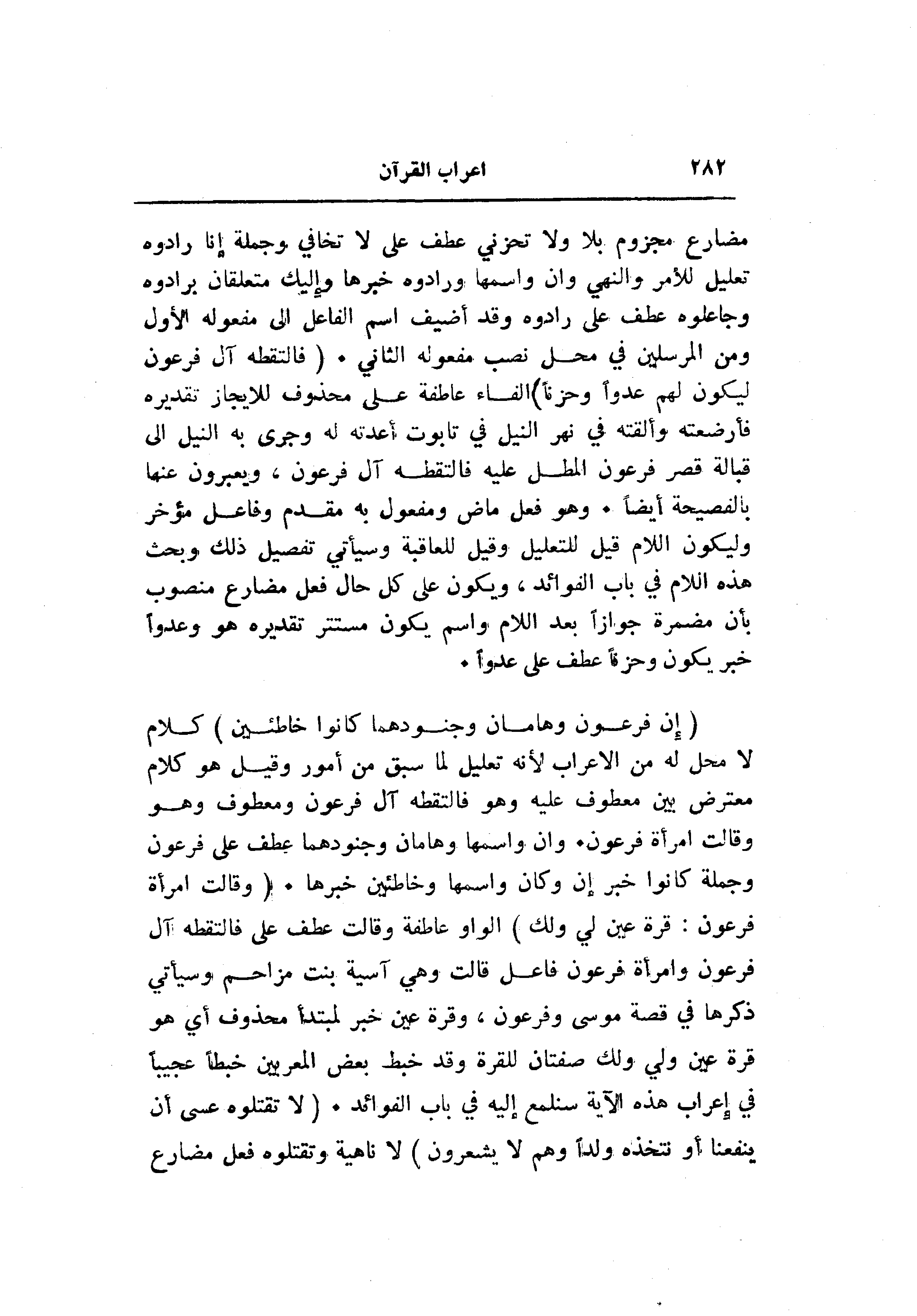 مضارع مجزوم بلا ولا تحزني عطف على لا تخافي وجملة إنا رادوه تعليل للأمر والنهي وان واسمها ورادوه خبرها وإليك متعلقان برادوه وجاعلوه عطف على رادوه وقد أضيف اسم الفاعل الى مفعوله الأول ومن المرسلين في محل نصب مفعوله الثاني. (فَالْتَقَطَهُ آلُ فِرْعَوْنَ لِيَكُونَ لَهُمْ عَدُوًّا وَحَزَناً) الفاء عاطفة على محذوف للايجاز تقديره فأرضعته وألقته في نهر النيل في تابوت أعدته له وجرى به النيل الى قبالة قصر فرعون المطل عليه فالتقطه آل فرعون، ويعبرون عنها بالفصيحة أيضا. وهو فعل ماض ومفعول به مقدم وفاعل مؤخر وليكون اللام قيل للتعليل وقيل للعاقبة وسيأتي تفصيل ذلك وبحث هذه اللام في باب الفوائد، ويكون على كل حال فعل مضارع منصوب بأن مضمرة جوازا بعد اللام واسم يكون مستتر تقديره هو وعدوا خبر يكون وحزنا عطف على عدوا.