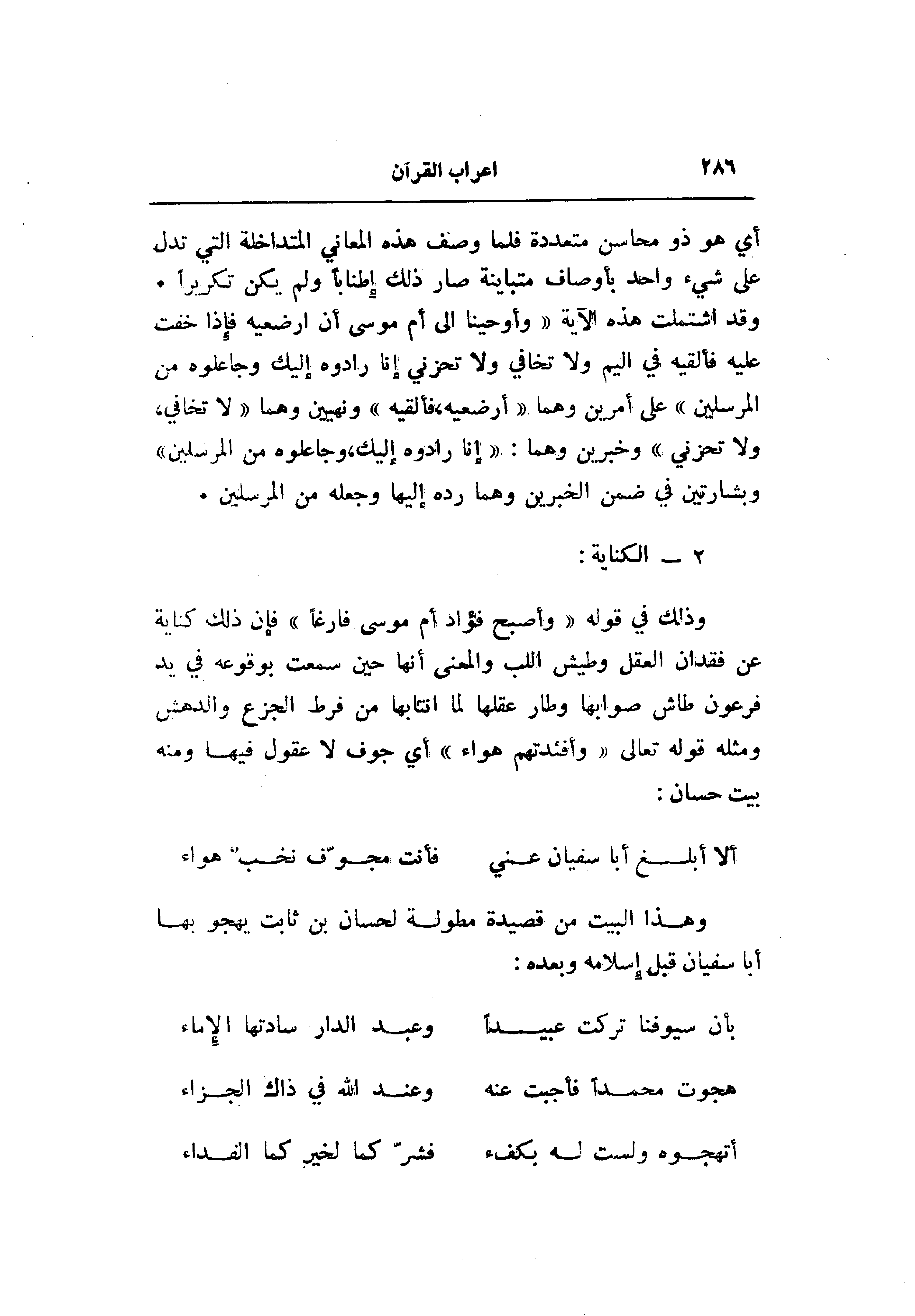 وذلك في قوله «وأصبح فؤاد أم موسى فارغا» فإن ذلك كناية عن فقدان العقل وطيش اللب والمعنى أنها حين سمعت بوقوعه في يد فرعون طاش صوابها وطار عقلها لما انتابها من فرط الجزع والدهش ومثله قوله تعالى «وأفئدتهم هواء» أي جوف لا عقول فيها ومنه بيت حسان: