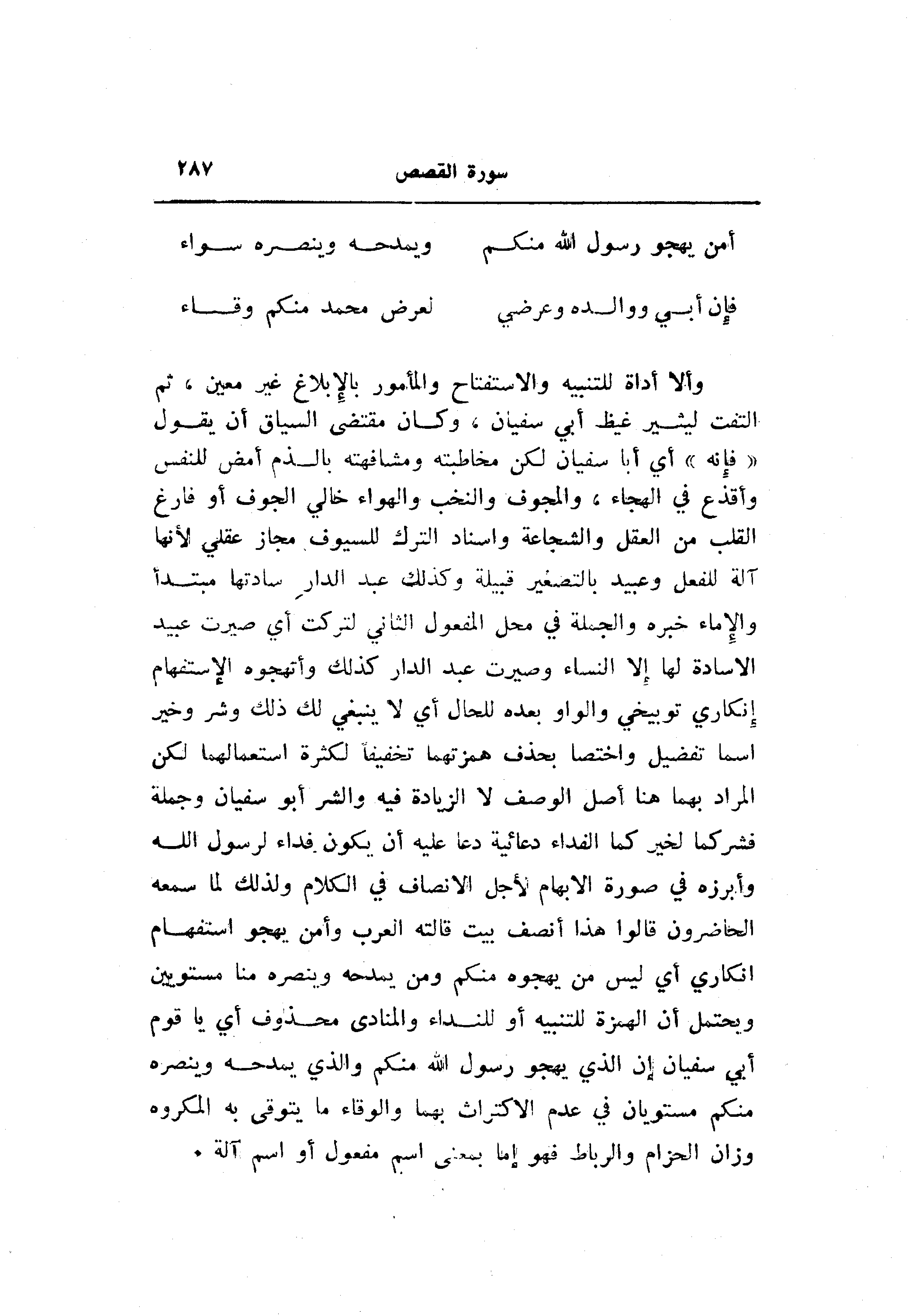 وألا أداة للتنبيه والاستفتاح والمأمور بالإبلاغ غير معين، ثم التفت ليثير غيظ أبي سفيان، وكان مقتضى السياق أن يقول «فإنه» أي أبا سفيان لكن مخاطبته ومشافهته بالذم أمض للنفس وأقذع في الهجاء، والمجوف والنخب والهواء خالي الجوف أو فارغ القلب من العقل والشجاعة واسناد الترك للسيوف مجاز عقلي لأنها آلة للفعل وعبيد بالتصغير قبيلة وكذلك عبد الدار سادتها مبتدأ والإماء خبره والجملة في محل المفعول الثاني لتركت أي صيرت عبيدا لا سادة لها إلا النساء وصيرت عبد الدار كذلك وأتهجوه الاستفهام إنكاري توبيخي والواو بعده للحال أي لا ينبغي لك ذلك وشر وخير اسما تفضيل واختصا بحذف همزتهما تخفيفا لكثرة استعمالهما لكن المراد بهما هنا أصل الوصف لا الزيادة فيه والشر أبو سفيان وجملة فشر كما لخير كما الفداء دعائية دعا عليه أن يكون فداء لرسول الله وأبرزه في صورة الإبهام لأجل الانصاف في الكلام ولذلك لما سمعه الحاضرون قالوا هذا أنصف بيت قالته العرب وأمن يهجو استفهام انكاري أي ليس من يهجوه منكم ومن يمدحه وينصره منا مستويين ويحتمل أن الهمزة للتنبيه أو للنداء والمنادى محذوف أي يا قوم أبي سفيان إن الذي يهجو رسول الله منكم والذي يمدحه وينصره منكم مستويان في عدم الاكتراث بهما والوقاء ما يتوقى به المكروه وزان الحزام والرباط فهو إما بمعنى اسم مفعول أو اسم آلة.