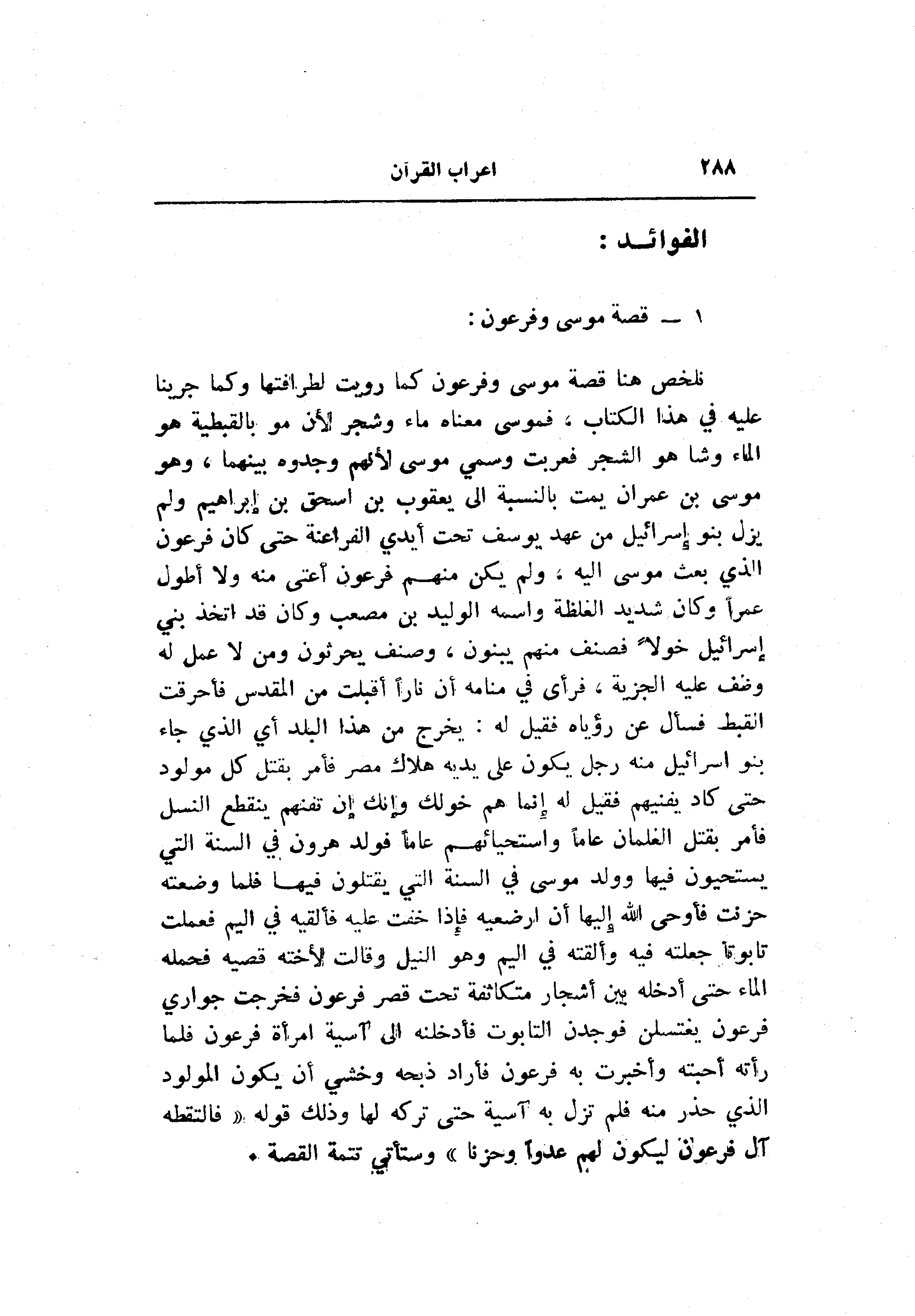 نلخص هنا قصة موسى وفرعون كما رويت لطرافتها وكما جرينا عليه في هذا الكتاب، فموسى معناه ماء وشجر لأن مو بالقبطية هو الماء وشا هو الشجر فعربت وسمي موسى لأنهم وجدوه بينهما، وهو موسى بن عمران يمت بالنسبة الى يعقوب بن اسحق بن إبراهيم ولم يزل بنو إسرائيل من عهد يوسف تحت أيدي الفراعنة حتى كان فرعون الذي بعث موسى اليه، ولم يكن منهم فرعون أعتى منه ولا أطول عمرا وكان شديد الغلظة واسمه الوليد بن مصعب وكان قد اتخذ بني إسرائيل خولا فصنف منهم يبنون، وصنف يحرثون ومن لا عمل له وظف عليه الجزية، فرأى في منامه أن نارا أقبلت من المقدس فأحرقت القبط فسأل عن رؤياه فقيل له: يخرج من هذا البلد أي الذي جاء بنو إسرائيل منه رجل يكون على يديه هلاك مصر فأمر بقتل كل مولود حتى كاد يفنيهم فقيل له إنما هم خولك وإنك إن تفنهم ينقطع النسل فأمر بقتل الغلمان عاما واستحيائهم عاما فولد هرون في السنة التي يستحيون فيها وولد موسى في السنة التي يقتلون فيها فلما وضعته حزنت فأوحى الله إليها أن أرضعيه فإذا خفت عليه فألقيه في اليم فعملت تابوتا جعلته فيه وألقته في اليم وهو النيل وقالت لأخته قصيه فحمله الماء حتى أدخله بين أشجار متكاثفة تحت قصر فرعون فخرجت جواري فرعون يغتسلن فوجدن التابوت فأدخلنه الى آسية امرأة فرعون فلما رأته أحبته وأخبرت به فرعون فأراد ذبحه وخشي أن يكون المولود الذي حذر منه فلم تزل به آسية حتى تركه لها وذلك قوله «فالتقطه آل فرعون ليكون لهم عدوا وحزنا» وستأتي تتمة القصة.