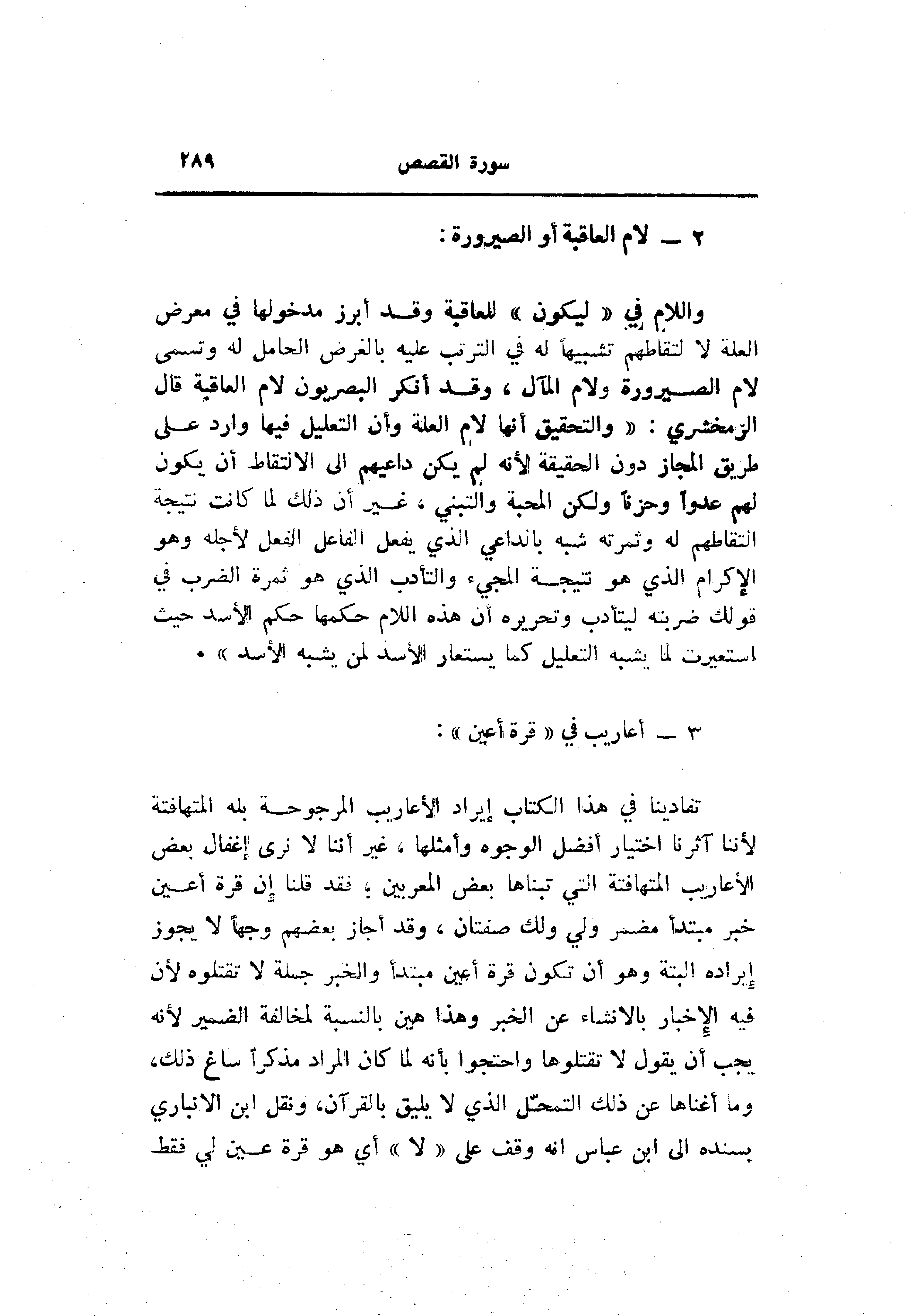 واللام في «ليكون» للعاقبة وقد أبرز مدخولها في معرض العلة لا لتقاطهم تشبيها له في الترتب عليه بالغرض الحامل له وتسمى لام الصيرورة ولام المآل، وقد أنكر البصريون لام العاقبة قال الزمخشري: «والتحقيق أنها لام العلة وأن التعليل فيها وارد على طريق المجاز دون الحقيقة لأنه لم يكن داعيهم الى الالتقاط أن يكون لهم عدوا وحزنا ولكن المحبة والتبني، غير أن ذلك لما كانت نتيجة التقاطهم له وثمرته شبه بالداعي الذي يفعل الفاعل الفعل لأجله وهو الإكرام الذي هو نتيجة المجيء والتأدب الذي هو ثمرة الضرب في قولك ضربته ليتأدب وتحريره أن هذه اللام حكمها حكم الأسد حيث استعيرت لما يشبه التعليل كما يستعار الأسد لمن يشبه الأسد» .