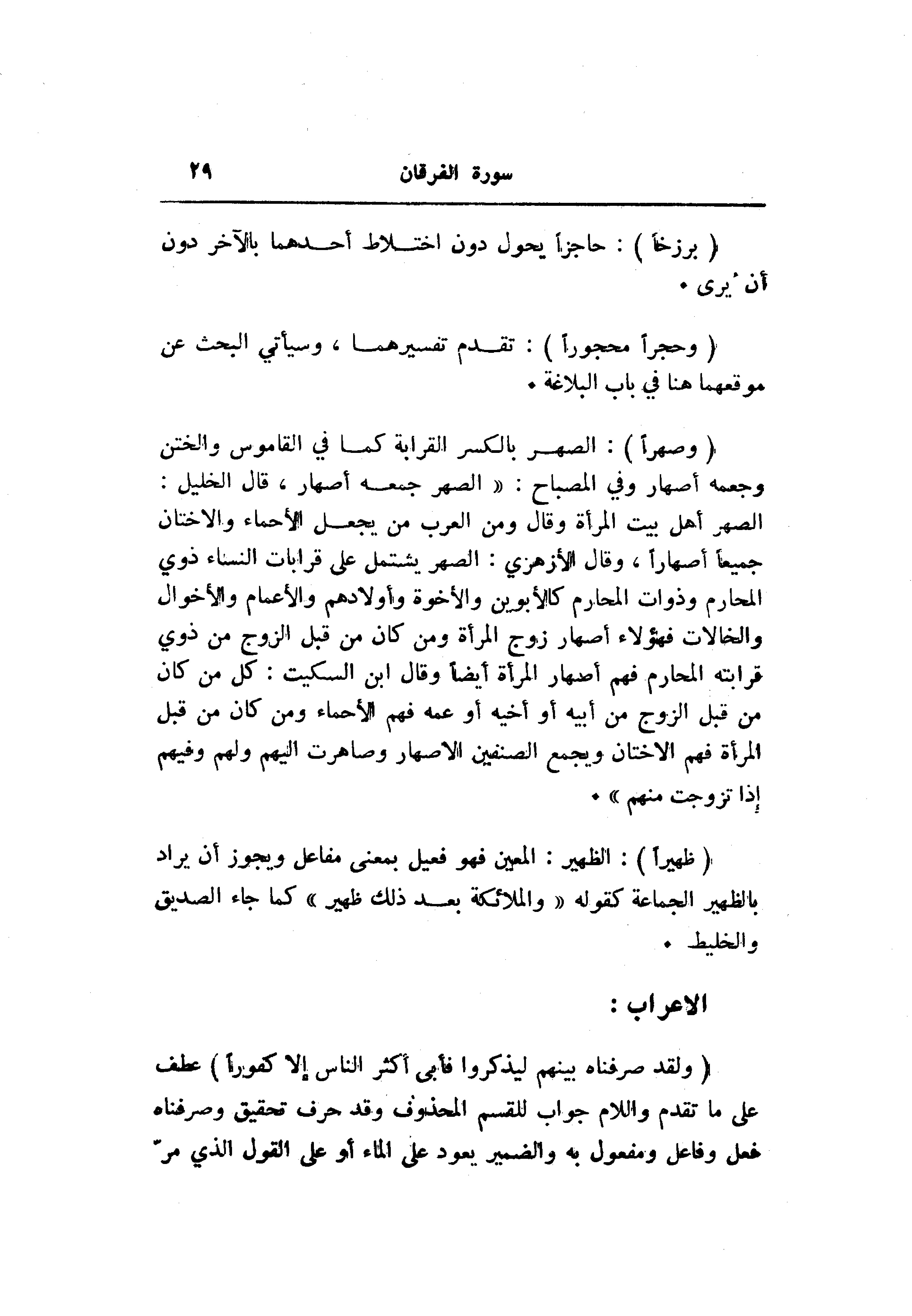 (وَصِهْراً) : الصهر بالكسر القرابة كما في القاموس والختن وجعمه أصهار وفي المصباح: «الصهر جمعه أصهار، قال الخليل: