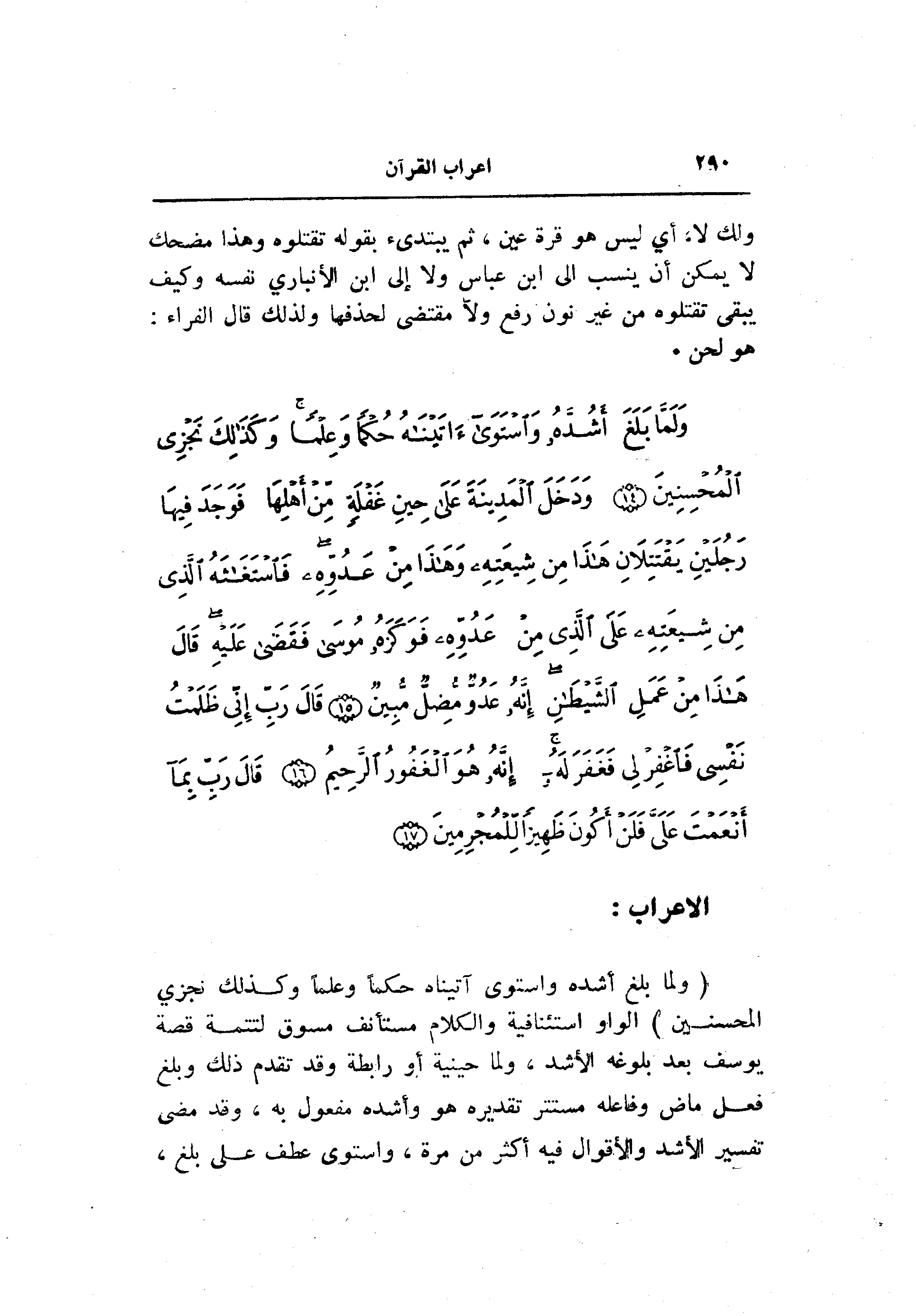 (وَلَمَّا بَلَغَ أَشُدَّهُ وَاسْتَوى آتَيْناهُ حُكْماً وَعِلْماً وَكَذلِكَ نَجْزِي الْمُحْسِنِينَ) الواو استئنافية والكلام مستأنف مسوق لتتمة قصة يوسف بعد بلوغه الأشد، ولما حينية أو رابطة وقد تقدم ذلك وبلغ فعل ماض وفاعله مستتر تقديره وهو وأشده مفعول به، وقد مضى تفسير الأشد والأقوال فيه أكثر من مرة، واستوى عطف على بلغ،