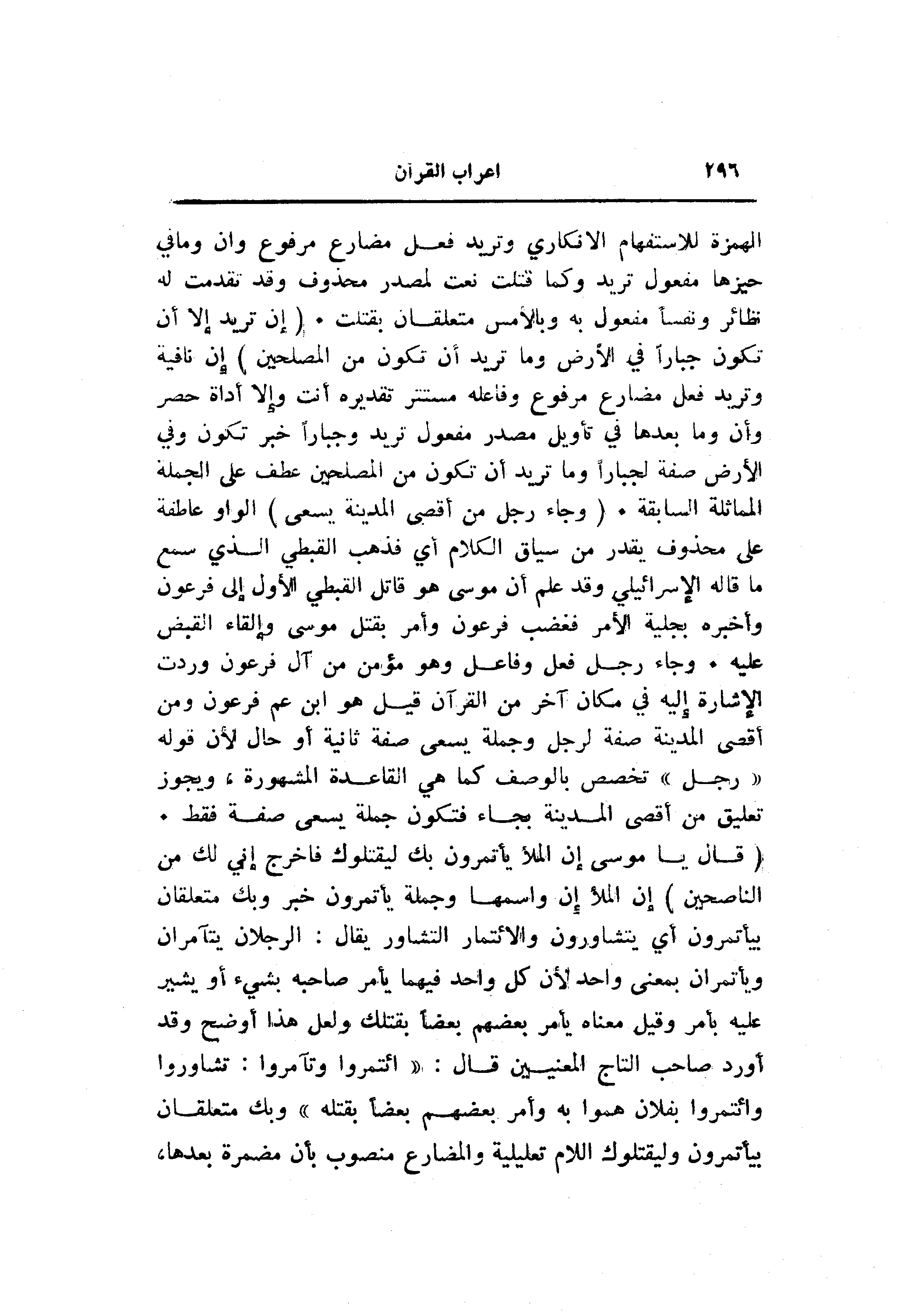 الهمزة للاستفهام الانكاري وتريد فعل مضارع مرفوع وان وما في حيزها مفعول تريد وكما قتلت نعت لمصدر محذوف وقد تقدمت له نظائر ونفسا مفعول به وبالأمس متعلقان بقتلت. (إِنْ تُرِيدُ إِلَّا أَنْ تَكُونَ جَبَّاراً فِي الْأَرْضِ وَما تُرِيدُ أَنْ تَكُونَ مِنَ الْمُصْلِحِينَ) إن نافية وتريد فعل مضارع مرفوع وفاعله مستتر تقديره أنت وإلا أداة حصر وأن وما بعدها في تأويل مصدر مفعول تريد وجبارا خبر تكون وفي الأرض صفة لجبارا وما تريد أن تكون من المصلحين عطف على الجملة المماثلة السابقة. (وَجاءَ رَجُلٌ مِنْ أَقْصَى الْمَدِينَةِ يَسْعى) الواو عاطفة على محذوف يقدر من سياق الكلام أي فذهب القبطي الذي سمع ما قاله الإسرائيلي وقد علم أن موسى هو قاتل القبطي الأول إلى فرعون وأخبره بجلية الأمر فغضب فرعون وأمر بقتل موسى وإلقاء القبض عليه. وجاء رجل فعل وفاعل وهو مؤمن من آل فرعون وردت الإشارة إليه في مكان آخر من القرآن قيل هو ابن عم فرعون ومن أقصى المدينة صفة لرجل وجملة يسعى صفة ثانية أو حال لأن قوله «رجل» تخصص بالوصف كما هي القاعدة المشهورة، ويجوز تعليق من أقصى المدينة بجاء فتكون جملة يسعى صفة فقط.
