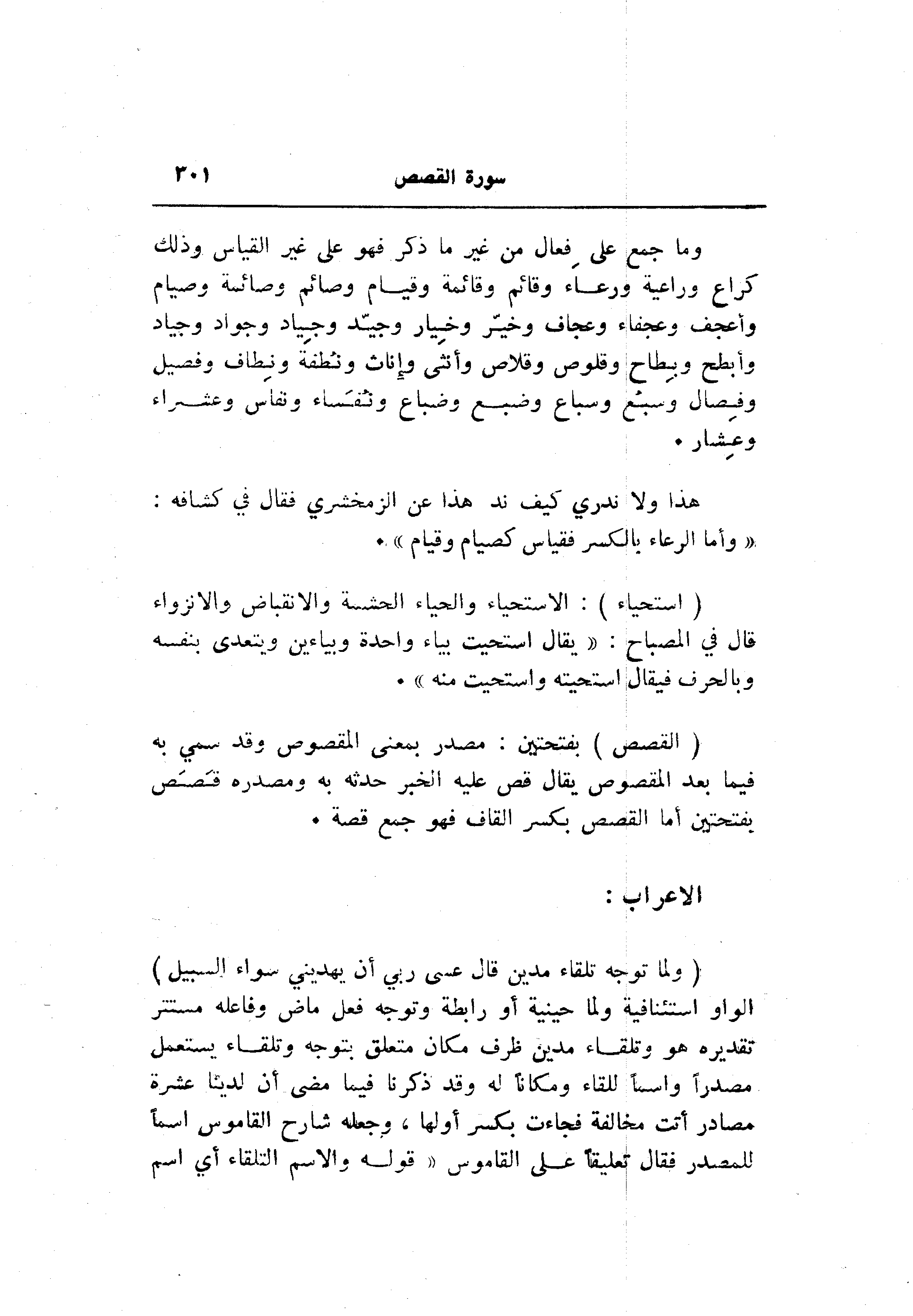 (وَلَمَّا تَوَجَّهَ تِلْقاءَ مَدْيَنَ قالَ عَسى رَبِّي أَنْ يَهْدِيَنِي سَواءَ السَّبِيلِ) الواو استئنافية ولما حينية أو رابطة وتوجه فعل ماض وفاعله مستتر تقديره هو وتلقاء مدين ظرف مكان متعلق بتوجه وتلقاء يستعمل مصدرا واسما للقاء ومكانا له وقد ذكرنا فيما مضى أن لدينا عشرة مصادر أتت مخالفة فجاءت بكسر أولها، وجعله شارح القاموس اسما للمصدر فقال تعليقا على القاموس «قوله والاسم التلقاء أي اسم