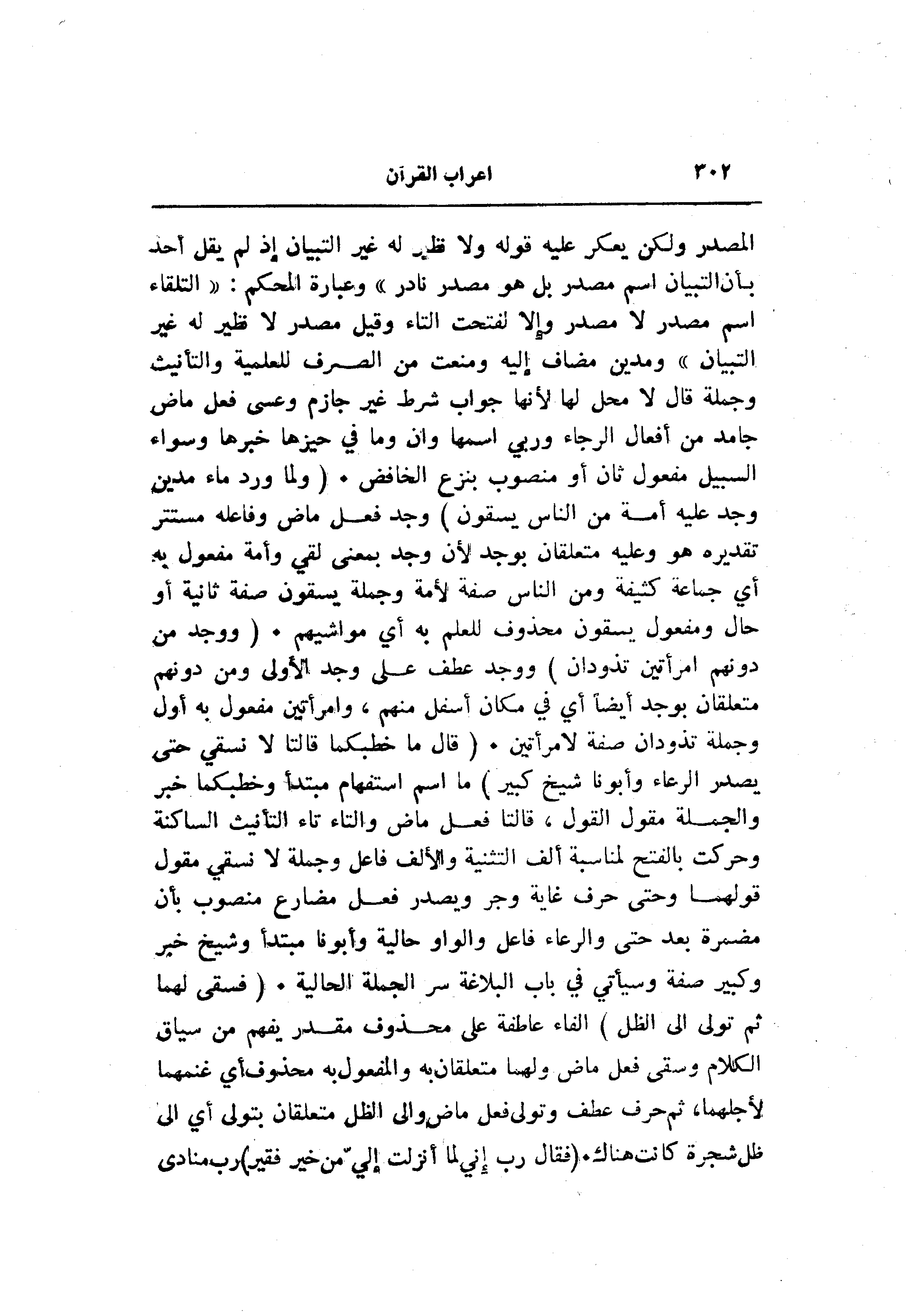 المصدر ولكن يعكر عليه قوله ولا نظير له غير التبيان إذ لم يقل أحد بأن التبيان اسم مصدر بل هو مصدر نادر» وعبارة المحكم: «التلقاء اسم مصدر لا مصدر وإلا لفتحت التاء وقيل مصدر لا نظير له غير التبيان» ومدين مضاف إليه ومنعت من الصرف للعلمية والتأنيث وجملة قال لا محل لها لأنها جواب شرط غير جازم وعسى فعل ماض جامد من أفعال الرجاء وربي اسمها وان وما في حيزها خبرها وسواء السبيل مفعول ثان أو منصوب بنزع الخافض. (وَلَمَّا وَرَدَ ماءَ مَدْيَنَ وَجَدَ عَلَيْهِ أُمَّةً مِنَ النَّاسِ يَسْقُونَ) وجد فعل ماض وفاعله مستتر تقديره هو وعليه متعلقان بوجد لأن وجد بمعنى لقي وأمة مفعول به أي جماعة كثيفة ومن الناس صفة لأمة وجملة يسقون صفة ثانية أو حال ومفعول يسقون محذوف للعلم به أي مواشيهم. (وَوَجَدَ مِنْ دُونِهِمُ امْرَأَتَيْنِ تَذُودانِ) ووجد عطف على وجد الأولى ومن دونهم متعلقان بوجد أيضا أي في مكان أسفل منهم، وامرأتين مفعول به أول وجملة تذودان صفة لامرأتين. (قالَ ما خَطْبُكُما قالَتا لا نَسْقِي حَتَّى يُصْدِرَ الرِّعاءُ وَأَبُونا شَيْخٌ كَبِيرٌ) ما اسم استفهام مبتدأ وخطبكما خبر والجملة مقول القول، قالتا فعل ماض والتاء تاء التأنيث الساكنة وحركت بالفتح لمناسبة ألف التثنية والألف فاعل وجملة لا نسقي مقول قولهما وحتى حرف غاية وجر ويصدر فعل مضارع منصوب بأن مضمرة بعد حتى والرعاء فاعل والواو حالية وأبونا مبتدأ وشيخ خبر وكبير صفة وسيأتي في باب البلاغة سر الجملة الحالية. (فَسَقى لَهُما ثُمَّ تَوَلَّى إِلَى الظِّلِّ) الفاء عاطفة على محذوف مقدر يفهم من سياق الكلام وسقى فعل ماض ولهما متعلقان به والمفعول به محذوف أي غنمهما لأجلهما، ثم حرف عطف وتولى فعل ماض والى الظل متعلقان بتولي أي الى ظل شجرة كانت هناك. (فَقالَ رَبِّ إِنِّي لِما أَنْزَلْتَ إِلَيَّ مِنْ خَيْرٍ فَقِيرٌ) رب منادى