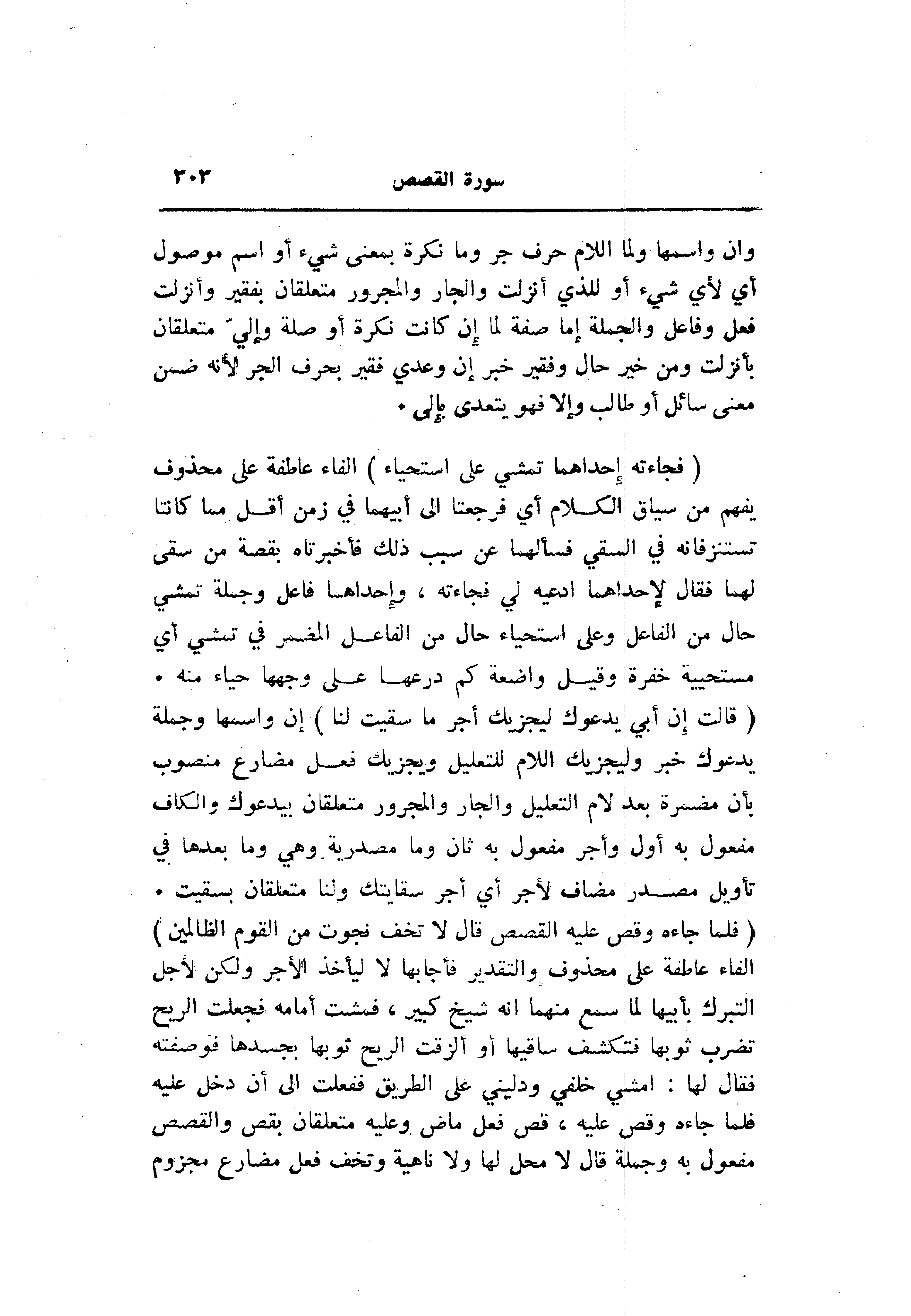 (فَلَمَّا جاءَهُ وَقَصَّ عَلَيْهِ الْقَصَصَ قالَ لا تَخَفْ نَجَوْتَ مِنَ الْقَوْمِ الظَّالِمِينَ) الفاء عاطفة على محذوف والتقدير فأجابها لا ليأخذ الأجر ولكن لأجل التبرك بأبيها لما سمع منهما انه شيخ كبير، فمشت أمامه فجعلت الريح تضرب ثوبها فتكشف ساقيها أو ألزقت الريح ثوبها بجسدها فوصفته فقال لها: امشي خلفي ودليني على الطريق ففعلت الى أن دخل عليه فلما جاءه وقص عليه، قص فعل ماض وعليه متعلقان بقص والقصص مفعول به وجملة قال لا محل لها ولا ناهية وتخف فعل مضارع مجزوم