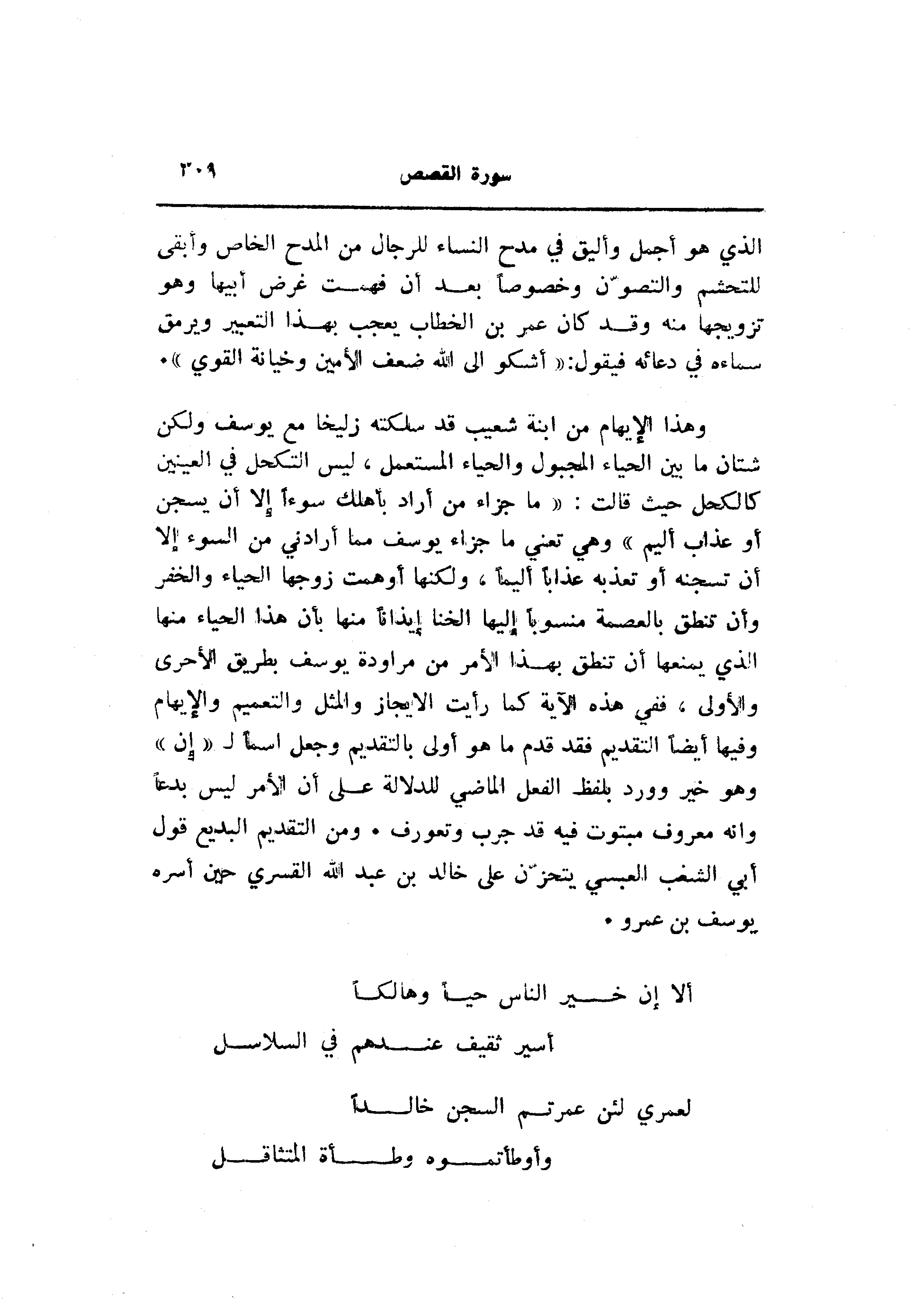 وهذا الإيهام من ابنة شعيب قد سلكته زليخا مع يوسف ولكن شتان ما بين الحياء المجبول والحياء المستعمل، ليس التكحل في العينين كالكحل حيث قالت: «ما جزاء من أراد بأهلك سوءا إلا أن يسجن أو عذاب أليم» وهي تعني ما جزاء يوسف مما أرادني من السوء إلا أن تسجنه أو تعذبه عذابا أليما، ولكنها أو همت زوجها الحياء والخفر وأن تنطق بالعصمة منسوبا إليها الخنا إيذانا منها بأن هذا الحياء منها الذي يمنعها أن تنطق بهذا الأمر من مراودة يوسف بطريق الأحرى والأولى، ففي هذه الآية كما رأيت الإيجاز والمثل والتعميم والإيهام وفيها أيضا التقديم فقد قدم ما هو أولى بالتقديم وجعل اسما ل «إن» وهو خير وورد بلفظ الفعل الماضي للدلالة على أن الأمر ليس بدعا وانه معروف مبتوت فيه قد جرب وتعورف. ومن التقديم البديع قول أبي الشغب العبسي يتحزّن على خالد بن عبد الله القسري حين أسره يوسف بن عمرو.
