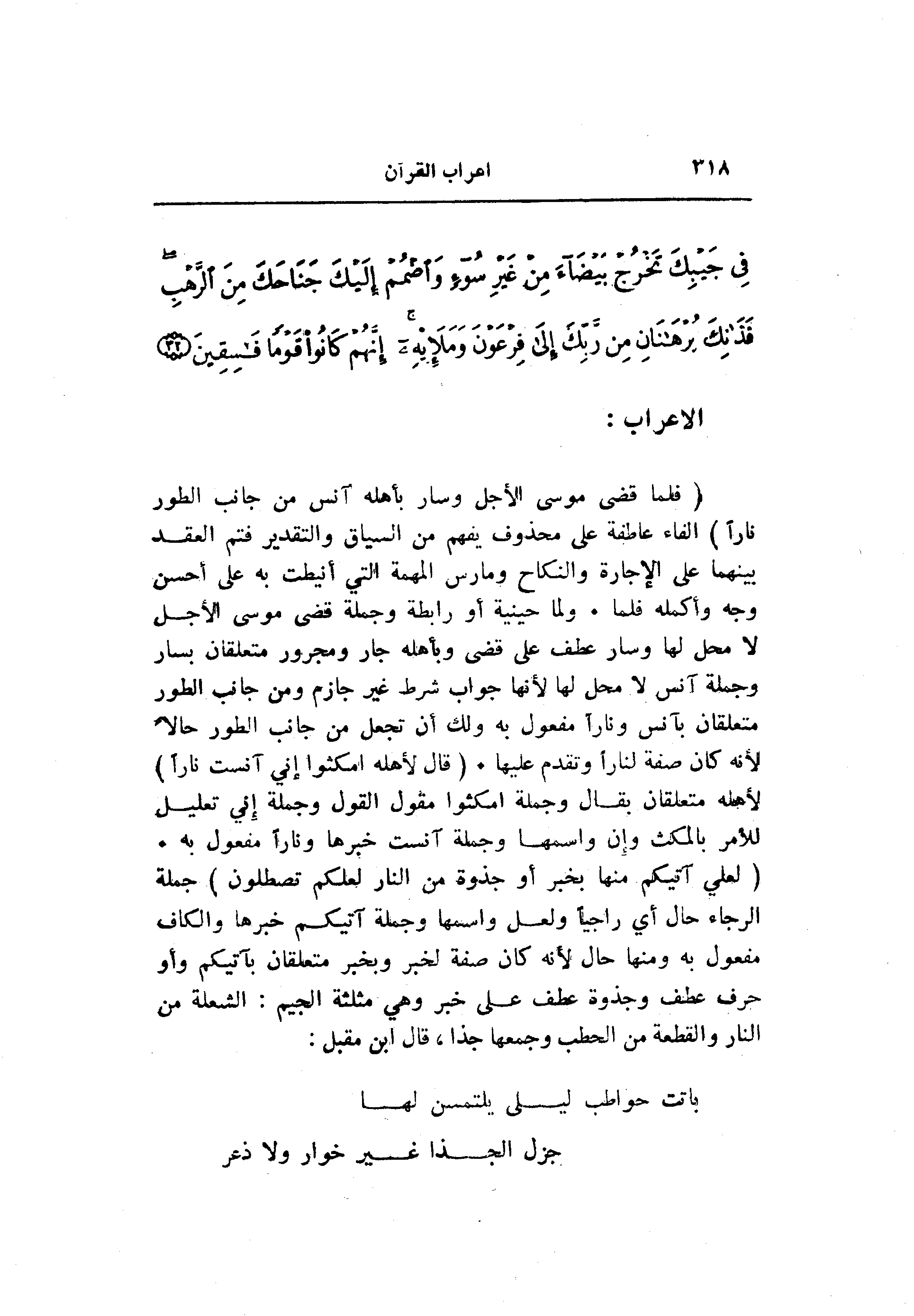 (لَعَلِّي آتِيكُمْ مِنْها بِخَبَرٍ أَوْ جَذْوَةٍ مِنَ النَّارِ لَعَلَّكُمْ تَصْطَلُونَ) جملة الرجاء حال أي راجيا ولعل واسمها وجملة آتيكم خبرها والكاف مفعول به ومنها حال لأنه كان صفة لخبر وبخبر متعلقان بآتيكم وأو حرف عطف وجذوة عطف على خبر وهي مثلثة الجيم: الشعلة من النار والقطعة من الحطب وجمعها جذا، قال ابن مقبل: