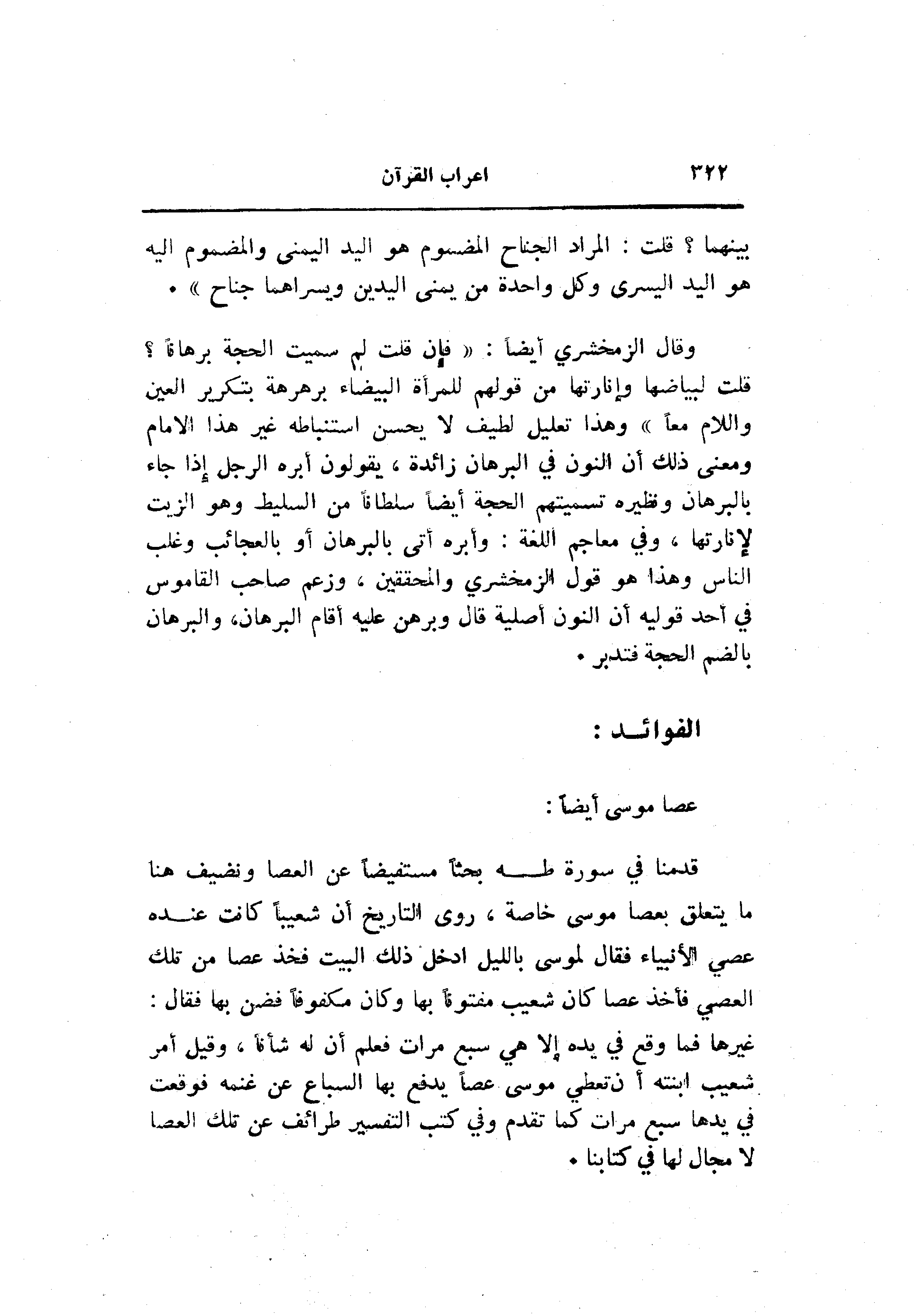 قلت لبياضها وإنارتها من قولهم للمرأة البيضاء برهرهة بتكرير العين واللام معا» وهذا تعليل لطيف لا يحسن استنباطه غير هذا الامام ومعنى ذلك أن النون في البرهان زائدة، يقولون أبره الرجل إذا جاء بالبرهان ونظيره تسميتهم الحجة أيضا سلطانا من السليط وهو الزيت لإنارتها، وفي معاجم اللغة: وأبره أتى بالبرهان أو بالعجائب وغلب الناس وهذا هو قول الزمخشري والمحققين، وزعم صاحب القاموس في أحد قوليه أن النون أصلية قال وبرهن عليه أقام البرهان، والبرهان بالضم الحجة فتدبر.