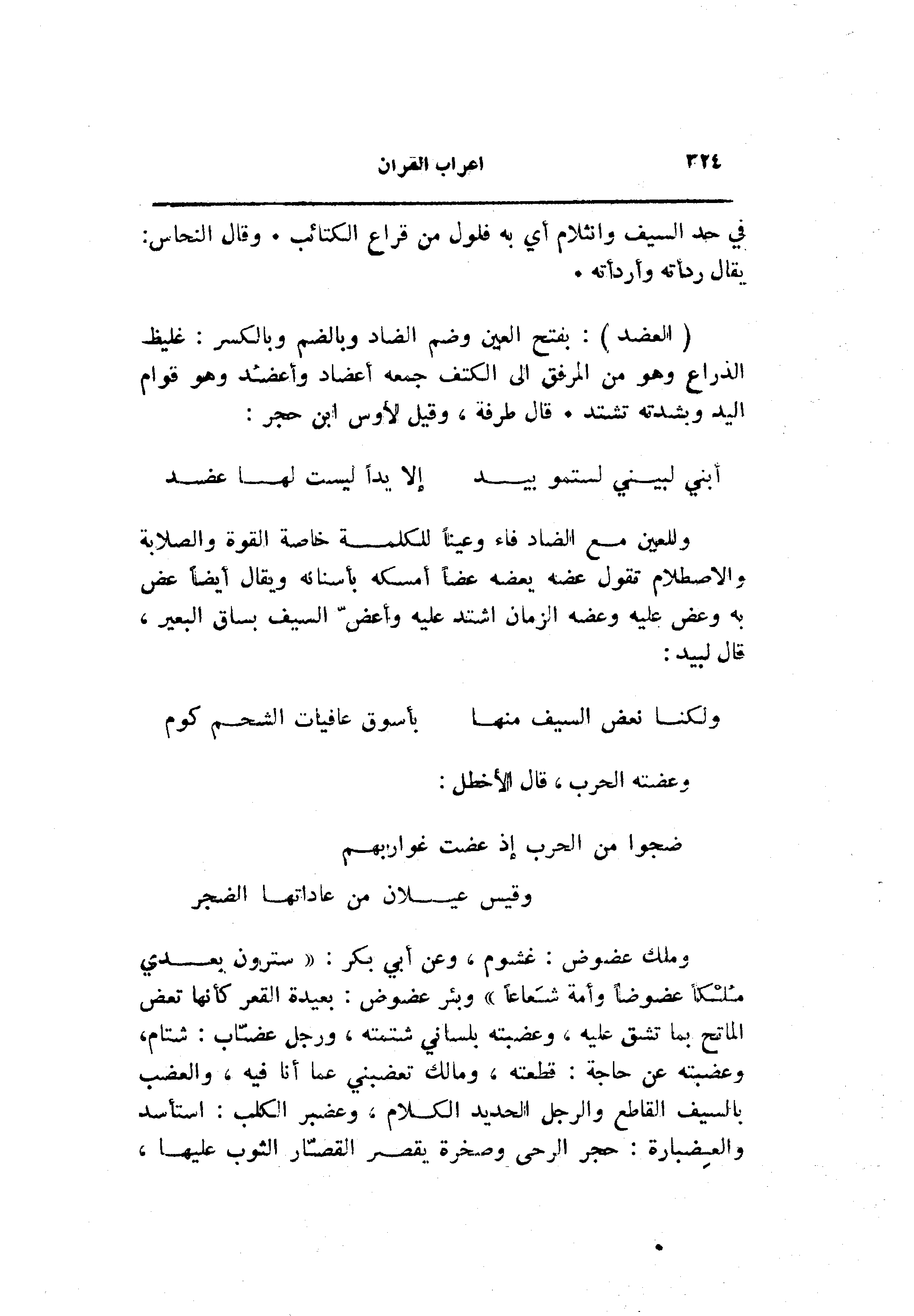 وللعين مع الضاد فاء وعينا للكلمة خاصة القوة والصلابة والاصطلام تقول عضه يعضه عضا أمسكه بأسنانه ويقال أيضا عض به وعض عليه وعضه الزمان اشتد عليه وأعضّ السيف بساق البعير، قال لبيد: