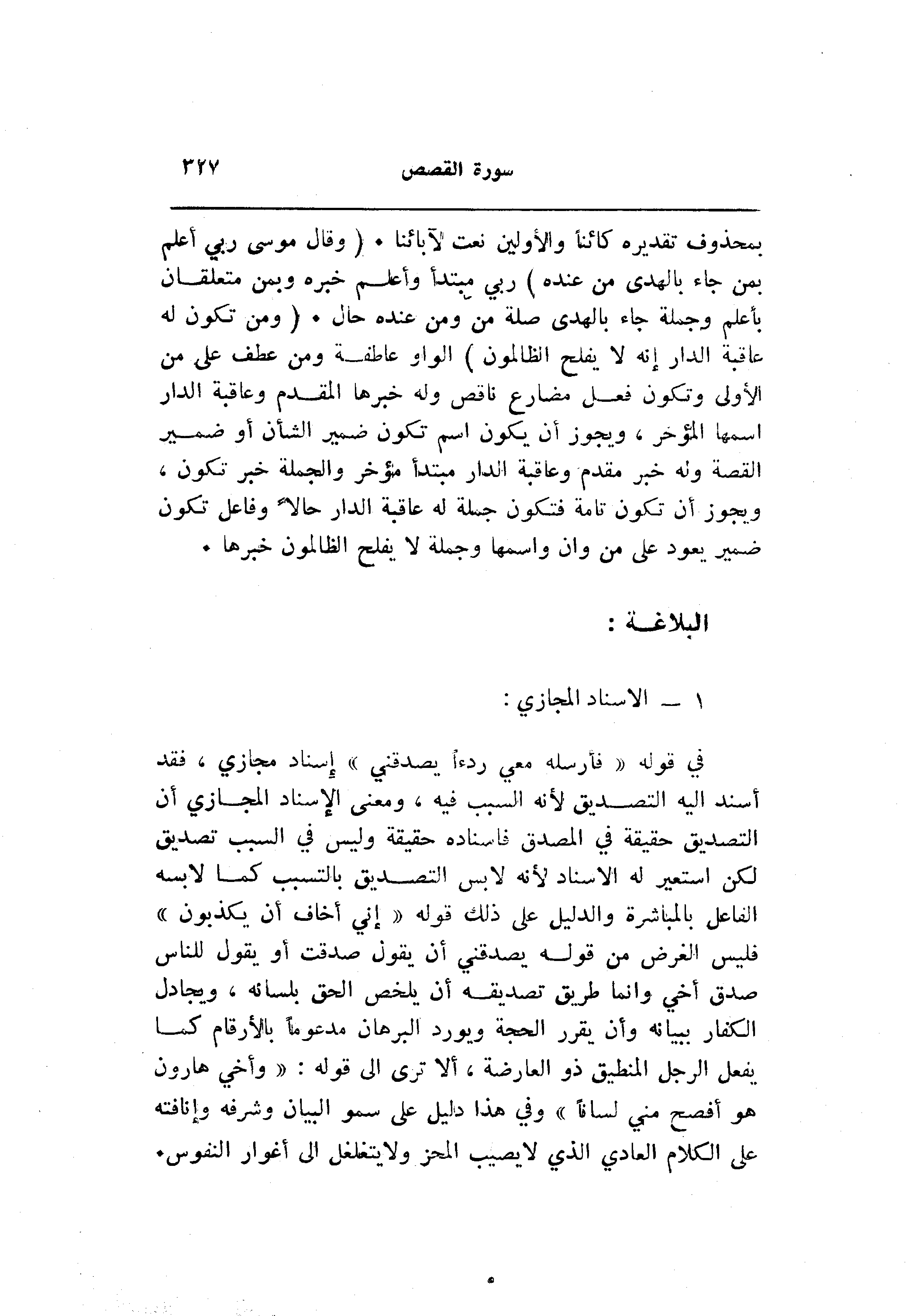في قوله «فأرسله معي ردءا يصدقني» إسناد مجازي، فقد أسند اليه التصديق لأنه السبب فيه، ومعنى الإسناد المجازي أن التصديق حقيقة في المصدق فاسناده حقيقة وليس في السبب تصديق لكن استعير له الاسناد لأنه لابس التصديق بالتسبب كما لابسه الفاعل بالمباشرة والدليل على ذلك قوله «إني أخاف أن يكذبون» فليس الغرض من قوله يصدقني أن يقول صدقت أو يقول للناس صدق أخي وانما طريق تصديقه أن يلخص الحق بلسانه، ويجادل الكفار ببيانه وأن يقرر الحجة ويورد البرهان مدعوما بالأرقام كما يفعل الرجل المنطيق ذو العارضة، ألا ترى الى قوله: «وأخي هارون هو أفصح مني لسانا» وفي هذا دليل على سمو البيان وشرفه وإنافته على الكلام العادي الذي لا يصيب المحز ولا يتغلغل الى أغوار النفوس.