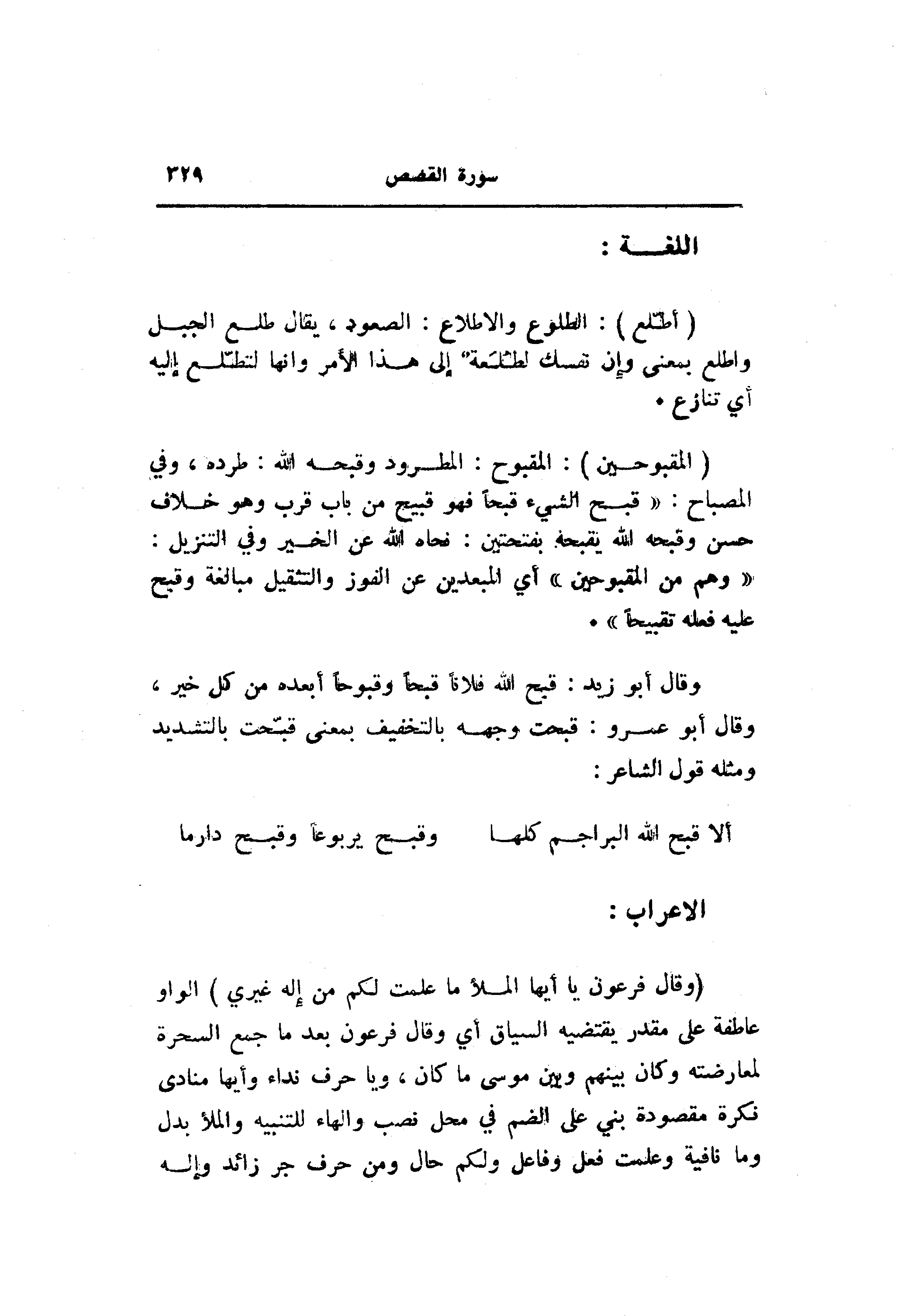 وقال أبو زيد: قبح الله فلانا قبحا وقبوحا أبعده من كل خير، وقال أبو عمرو: قبحت وجهه بالتخفيف بمعنى قبّحت بالتشديد ومثله قول الشاعر: