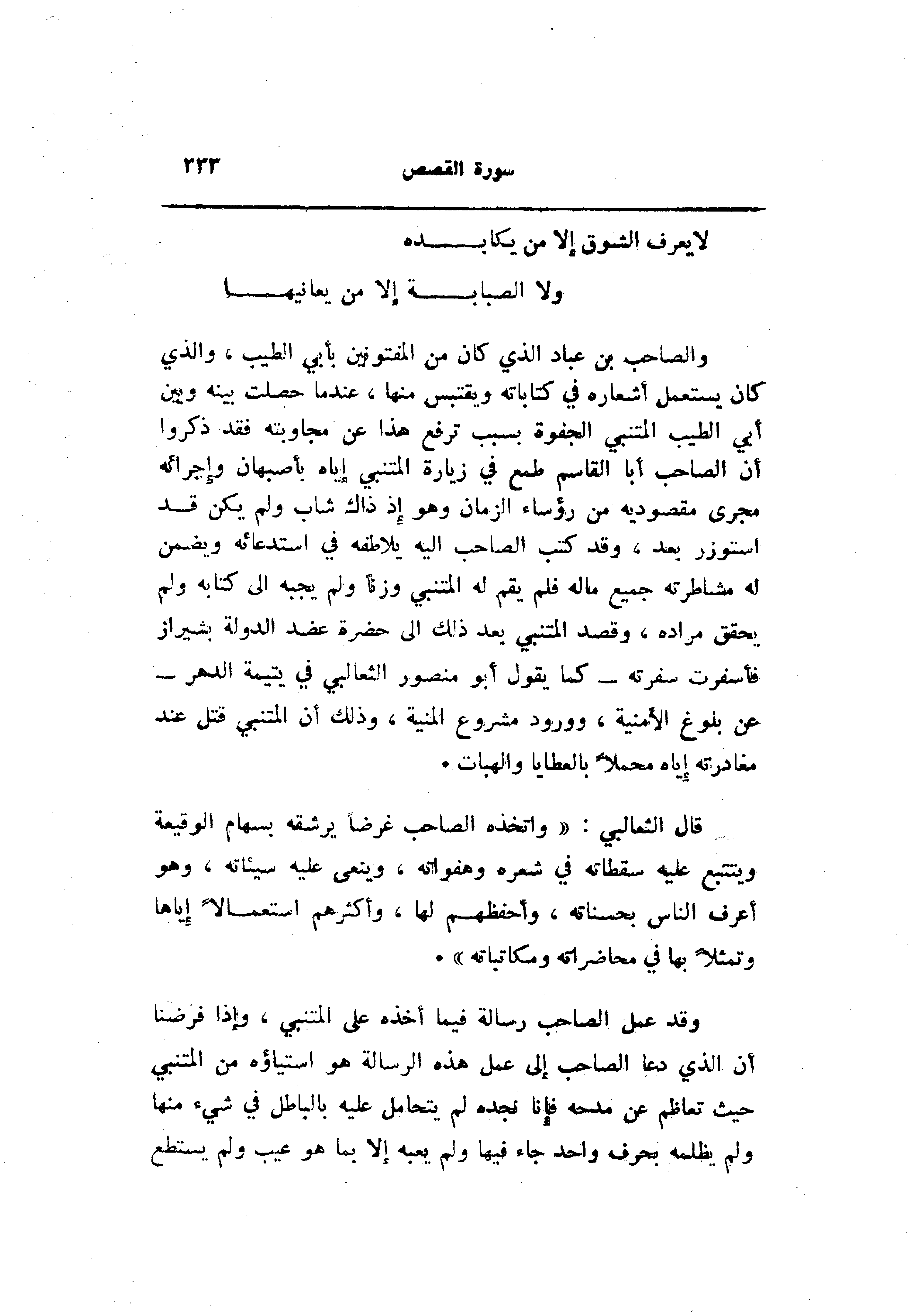 والصاحب بن عباد الذي كان من المفتونين بأبي الطيب، والذي كان يستعمل أشعاره في كتاباته ويقتبس منها، عند ما حصلت بينه وبين أبي الطيب المتنبي الجفوة بسبب ترفع هذا عن مجاوبته فقد ذكروا أن الصاحب أبا القاسم طمع في زيارة المتنبي إياه بأصبهان وإجرائه مجرى مقصوديه من رؤساء الزمان وهو إذ ذاك شاب ولم يكن قد استوزر بعد، وقد كتب الصاحب اليه يلاطفه في استدعائه ويضمن له مشاطرته جميع ماله فلم يقم له المتنبي وزنا ولم يجبه الى كتابه ولم يحقق مراده، وقصد المتنبي بعد ذلك الى حضرة عضد الدولة بشيراز فأسفرت سفرته- كما يقول أبو منصور الثعالبي في يتيمة الدهر- عن بلوغ الأمنية، وورود مشروع المنية، وذلك أن المتنبي قتل عند مغادرته إياه محملا بالعطايا والهبات.