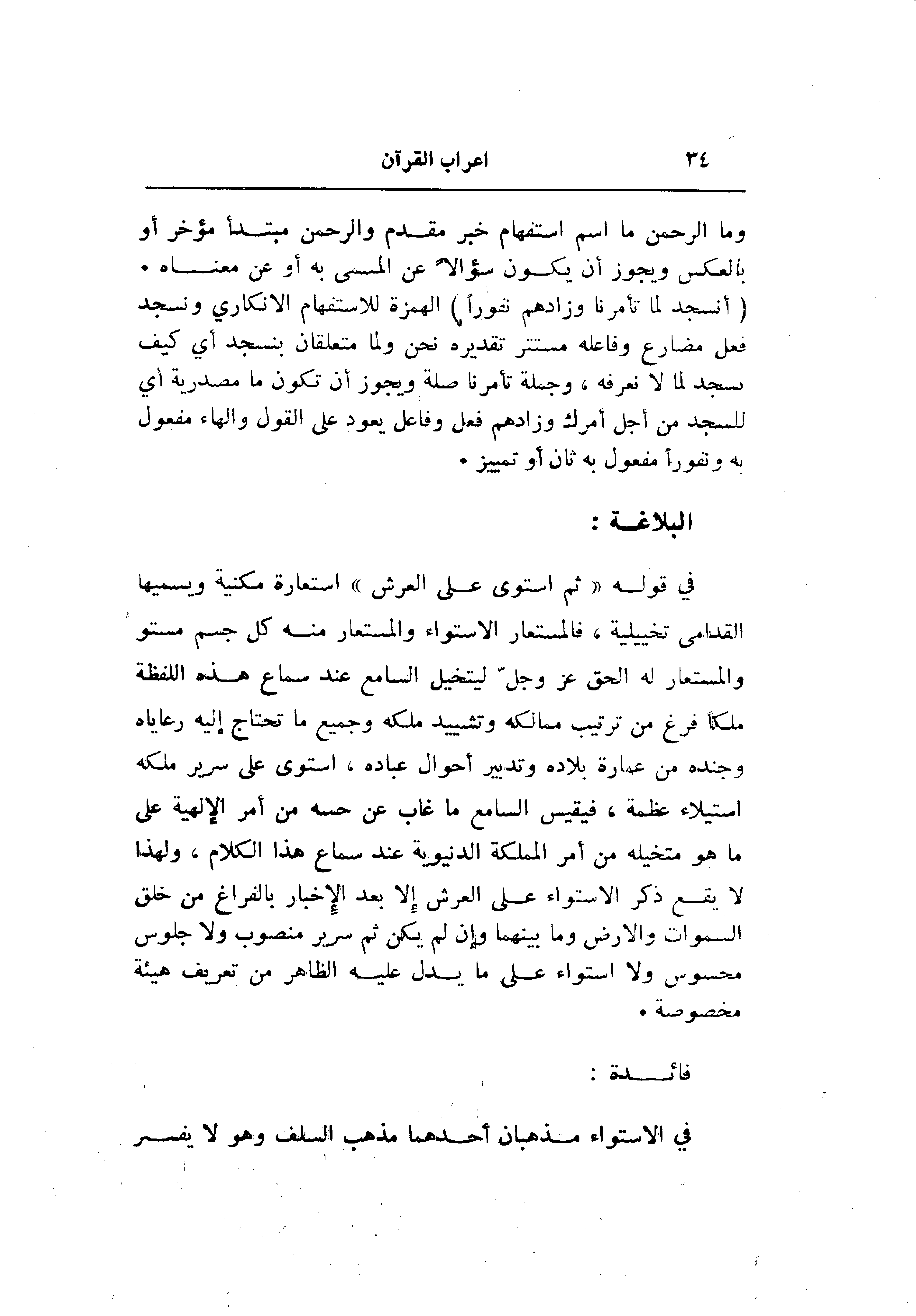 في قوله «ثم استوى على العرش» استعارة مكنية ويسميها القدامى تخييلية، فالمستعار الاستواء والمستعار منه كل جسم مستو والمستعار له الحق عز وجلّ ليتخيل السامع عند سماع هذه اللفظة ملكا فرغ من ترتيب ممالكه وتشييد ملكه وجميع ما تحتاج إليه رعاياه وجنده من عمارة بلاده وتدبير أحوال عباده، استوى على سرير ملكه استيلاء عظمة، فيقيس السامع ما غاب عن حسه من أمر الإلهية على ما هو متخيله من أمر المملكة الدنيوية عند سماع هذا الكلام، ولهذا لا يقع ذكر الاستواء على العرش إلا بعد الإخبار بالفراغ من خلق السموات والأرض وما بينهما وإن لم يكن ثم سرير منصوب ولا جلوس محسوس ولا استواء على ما يدل عليه الظاهر من تعريف هيئة مخصوصة.