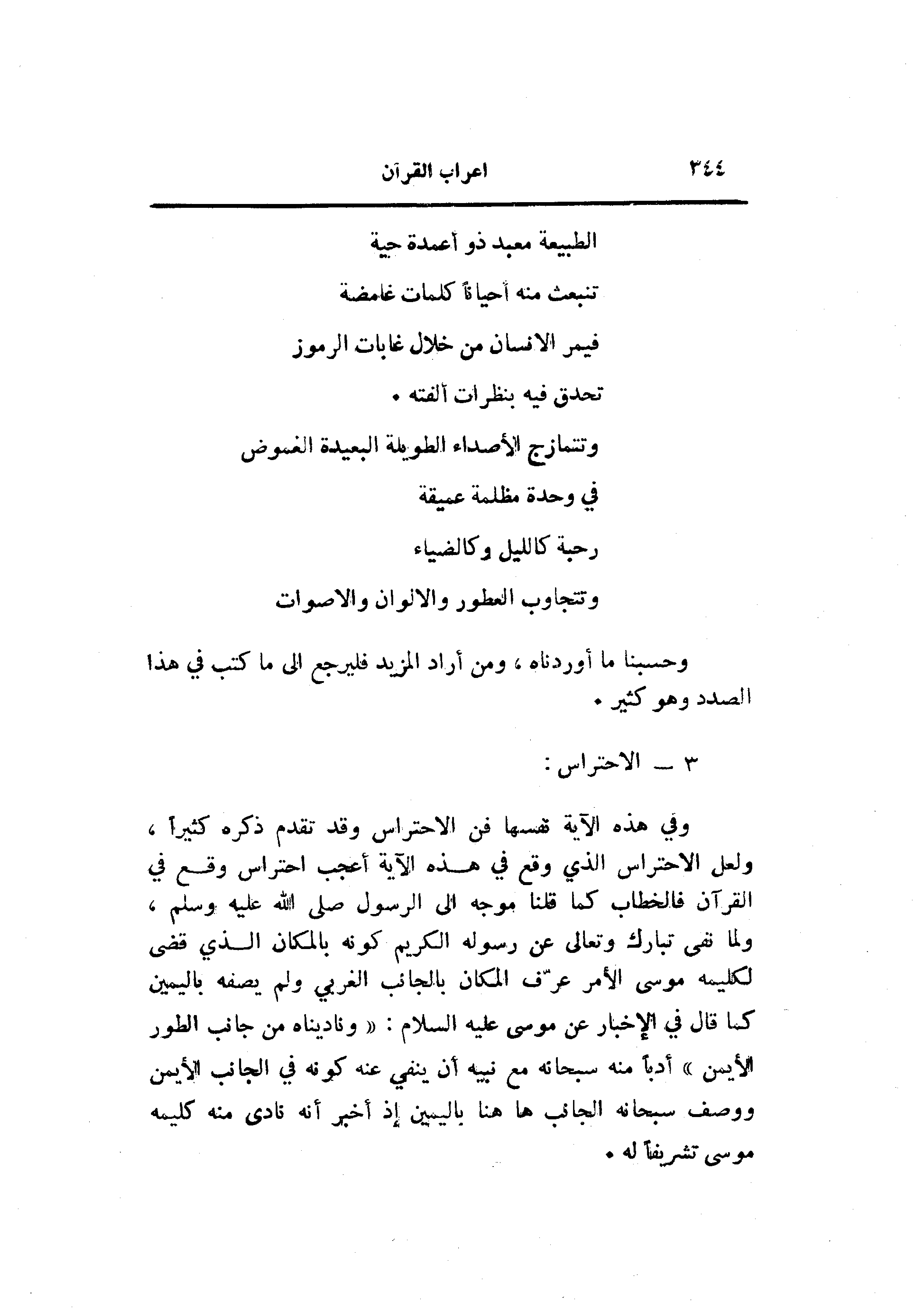 وفي هذه الآية نفسها فن الاحتراس وقد تقدم ذكره كثيرا، ولعل الاحتراس الذي وقع في هذه الآية أعجب احتراس وقع في القرآن فالخطاب كما قلنا موجه الى الرسول صلى الله عليه وسلم، ولما نفى تبارك وتعالى عن رسوله الكريم كونه بالمكان الذي قضى لكليمه موسى الأمر عرّف المكان بالجانب الغربي ولم يصفه باليمين كما قال في الإخبار عن موسى عليه السلام: «وناديناه من جانب الطور الأيمن» أدبا منه سبحانه مع نبيه أن ينفي عنه كونه في الجانب الأيمن ووصف سبحانه الجانب هاهنا باليمين إذ أخبر أنه نادى منه كليمه موسى تشريفا له.