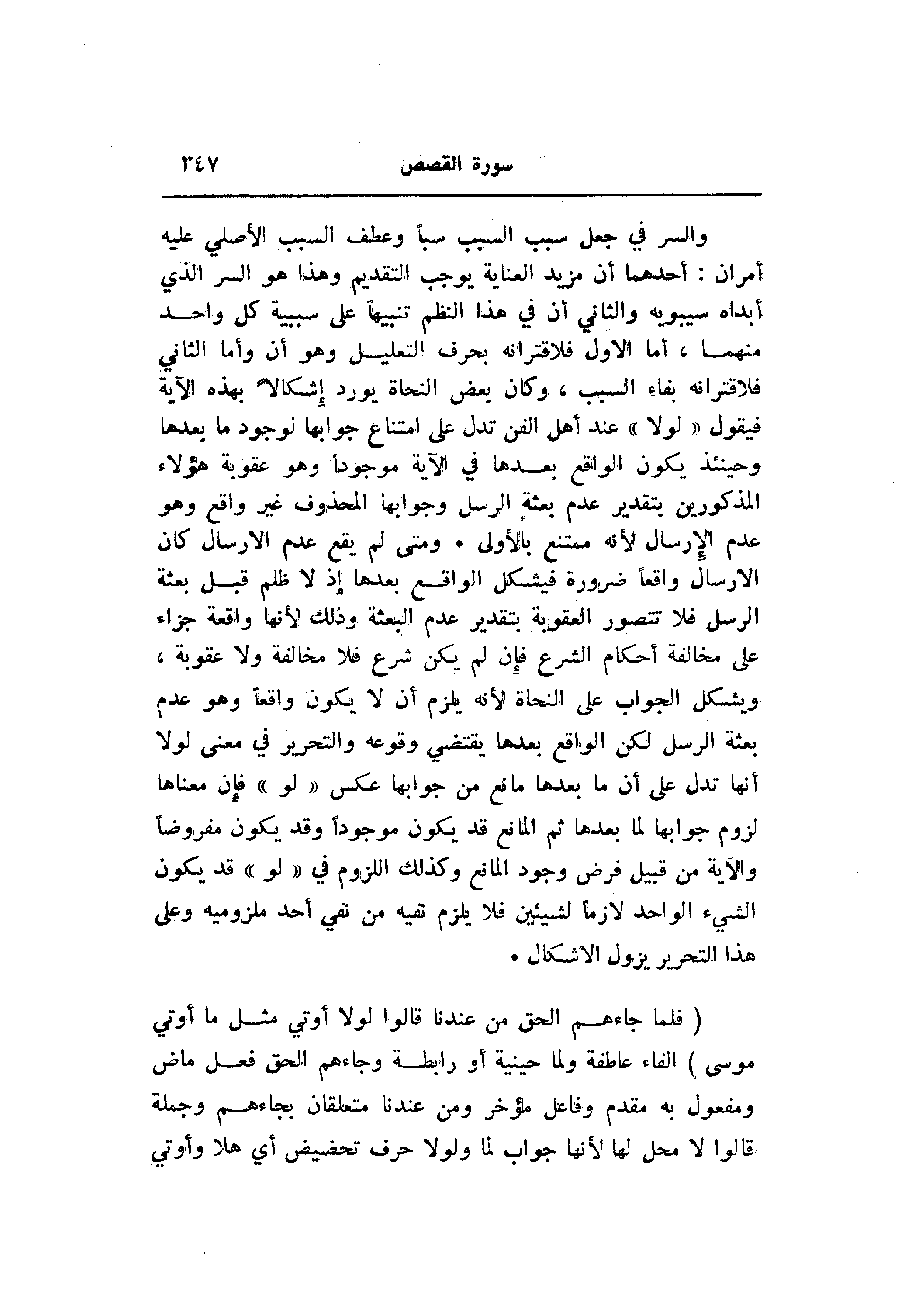 والسر في جعل سبب السبب سبا وعطف السبب الأصلي عليه أمران: أحدهما أن مزيد العناية يوجب التقديم وهذا هو السر الذي أبداه سيبويه والثاني أن في هذا النظم تنبيها على سببية كل واحد منهما، أما الاول فلاقترانه بحرف التعليل وهو أن وأما الثاني فلاقترانه بفاء السبب، وكان بعض النحاة يورد إشكالا بهذه الآية فيقول «لولا» عند أهل الفن تدل على امتناع جوابها لوجو ما بعدها وحينئذ يكون الواقع بعدها في الآية موجودا وهو عقوبة هؤلاء المذكورين بتقدير عدم بعثة الرسل وجوابها المحذوف غير واقع وهو عدم الإرسال لأنه ممتنع بالأولى. ومتى لم يقع عدم الإرسال كان الإرسال واقعا ضرورة فيشكل الواقع بعدها إذ لا ظلم قبل بعثة الرسل فلا تتصور العقوبة بتقدير عدم البعثة وذلك لأنها واقعة جزاء على مخالفة أحكام الشرع فإن لم يكن شرع فلا مخالفة ولا عقوبة، ويشكل الجواب على النحاة لأنه يلزم أن لا يكون واقعا وهو عدم بعثة الرسل لكن الواقع بعدها يقتضي وقوعه والتحرير في معنى لولا أنها تدل على أن ما بعدها مانع من جوابها عكس «لو» فإن معناها لزوم جوابها لما بعدها ثم المانع قد يكون موجودا وقد يكون مفروضا والآية من قبيل فرض وجود المانع وكذلك اللزوم في «لو» قد يكون الشيء الواحد لازما لشيئين فلا يلزم نفيه من نفي أحد ملزوميه وعلى هذا التحرير يزول الاشكال.