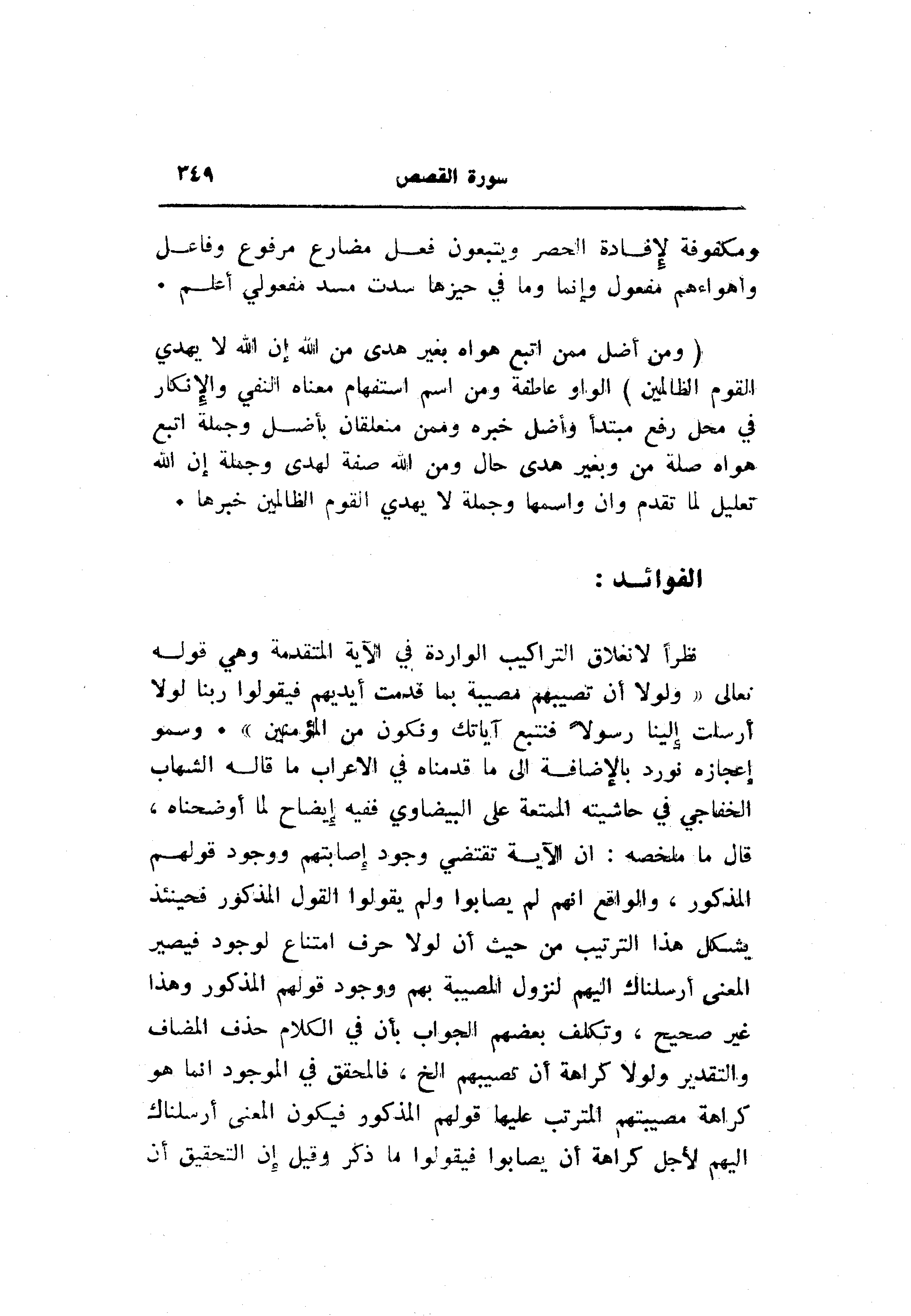 نظرا لانغلاق التراكيب الواردة في الآية المتقدمة وهي قوله تعالى «ولولا أن تصيبهم مصيبة بما قدمت أيديهم فيقولوا ربنا لولا أرسلت إلينا رسولا فنتبع آياتك ونكون من المؤمنين» . وسمو إعجازه نورد بالإضافة الى ما قدمناه في الاعراب ما قاله الشهاب الخفاجي في حاشيته الممتعة على البيضاوي ففيه إيضاح لما أوضحناه، قال ما ملخصه: ان الآية تقتضي وجود إصابتهم ووجود قولهم المذكور، والواقع انهم لم يصابوا ولم يقولوا القول المذكور فحينئذ يشكل هذا الترتيب من حيث أن لولا حرف امتناع لوجود فيصير المعنى أرسلناك إليهم لنزول المصيبة بهم ووجود قولهم المذكور وهذا غير صحيح، وتكلف بعضهم الجواب بأن في الكلام حذف المضاف والتقدير ولولا كراهة أن تصيبهم إلخ، فالمحقق في الموجود انما هو كراهة مصيبتهم المترتب عليها قولهم المذكور فيكون المعنى أرسلناك إليهم لأجل كراهة أن يصابوا فيقولوا ما ذكر وقيل إن التحقيق أن