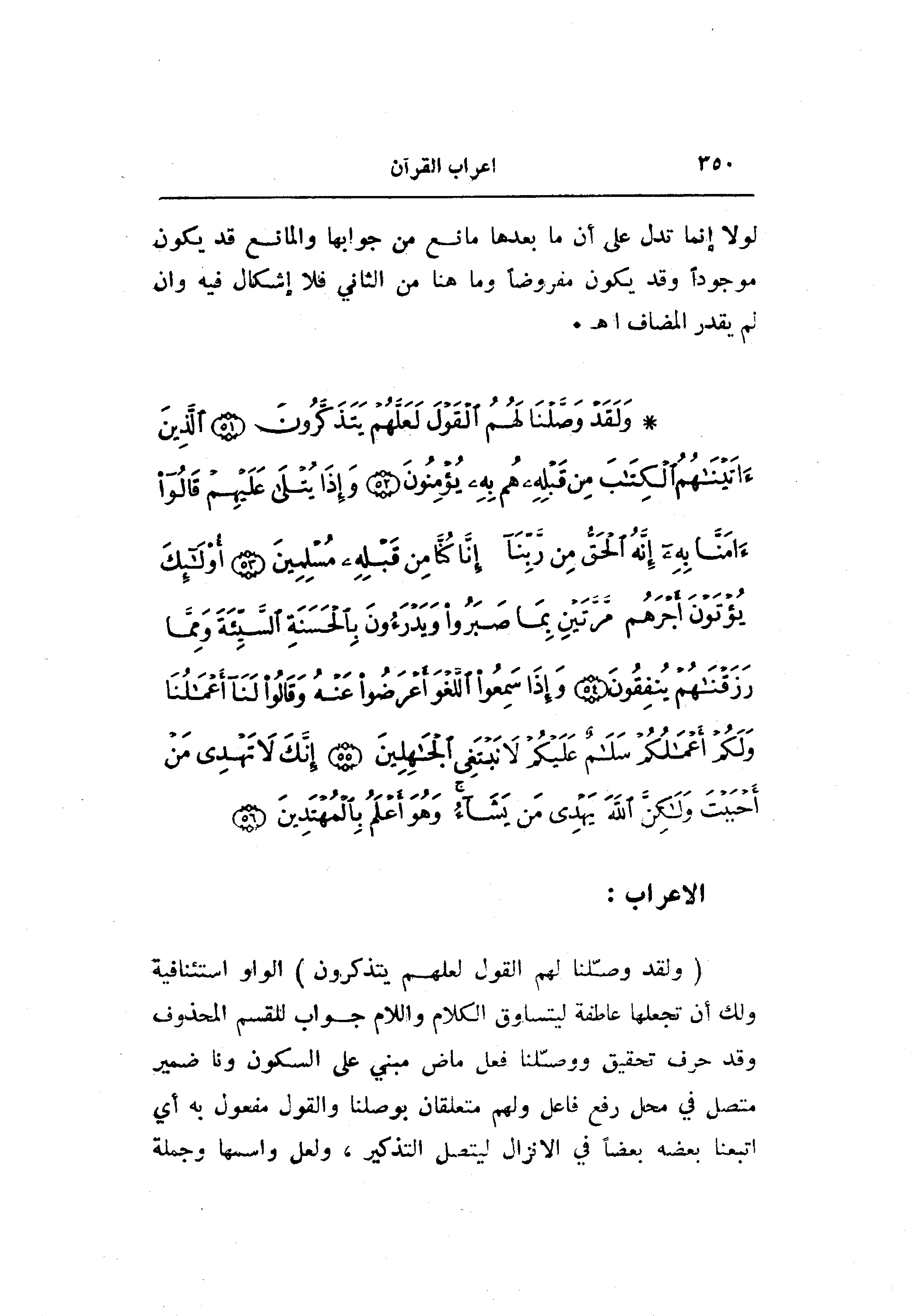 (وَلَقَدْ وَصَّلْنا لَهُمُ الْقَوْلَ لَعَلَّهُمْ يَتَذَكَّرُونَ) الواو استئنافية ولك أن تجعلها عاطفة ليتساوق الكلام واللام جواب للقسم المحذوف وقد حرف تحقيق ووصّلنا فعل ماض مبني على السكون ونا ضمير متصل في محل رفع فاعل ولهم متعلقان بوصلنا والقول مفعول به أي اتبعنا بعضه بعضا في الانزال ليتصل التذكير، ولعل واسمها وجملة