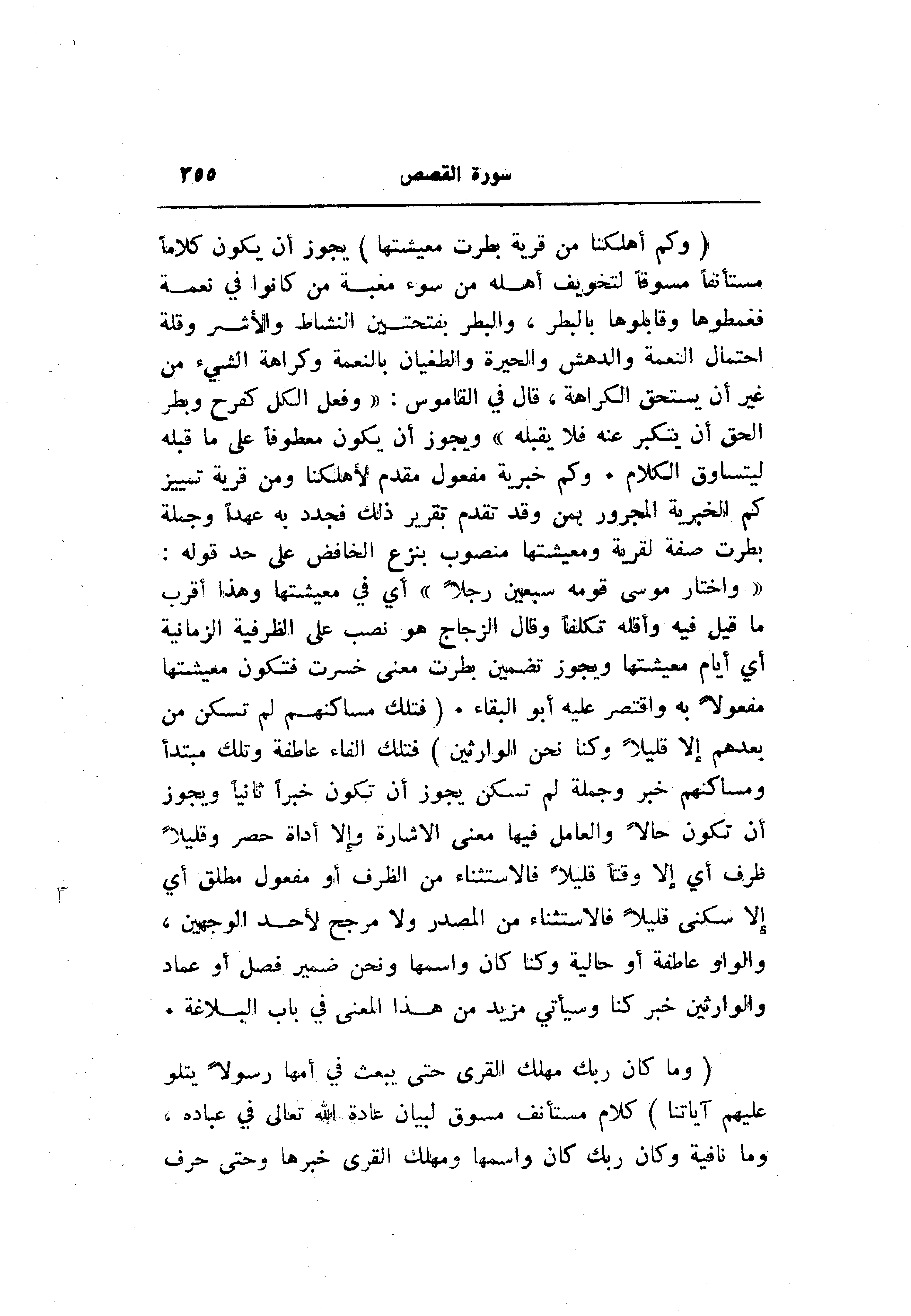 «واختار موسى قومه سبعين رجلا» أي في معيشتها وهذا أقرب ما قيل فيه وأقله تكلفا وقال الزجاج هو نصب على الظرفية الزمانية أي أيام معيشتها ويجوز تضمين بطرت معنى خسرت فتكون معيشتها مفعولا به واقتصر عليه أبو البقاء. (فَتِلْكَ مَساكِنُهُمْ لَمْ تُسْكَنْ مِنْ بَعْدِهِمْ إِلَّا قَلِيلًا وَكُنَّا نَحْنُ الْوارِثِينَ) فتلك الفاء عاطفة وتلك مبتدأ ومساكنهم خبر وجملة لم تسكن يجوز أن تكون خبرا ثانيا ويجوز أن تكون حالا والعامل فيها معنى الاشارة وإلا أداة حصر وقليلا ظرف أي إلا وقتا قليلا فالاستثناء من الظرف أو مفعول مطلق أي إلا سكنى قليلا فالاستثناء من المصدر ولا مرجح لأحد الوجهين، والواو عاطفة أو حالية وكنا كان واسمها ونحن ضمير فصل أو عماد والوارثين خبر كنا وسيأتي مزيد من هذا المعنى في باب البلاغة.