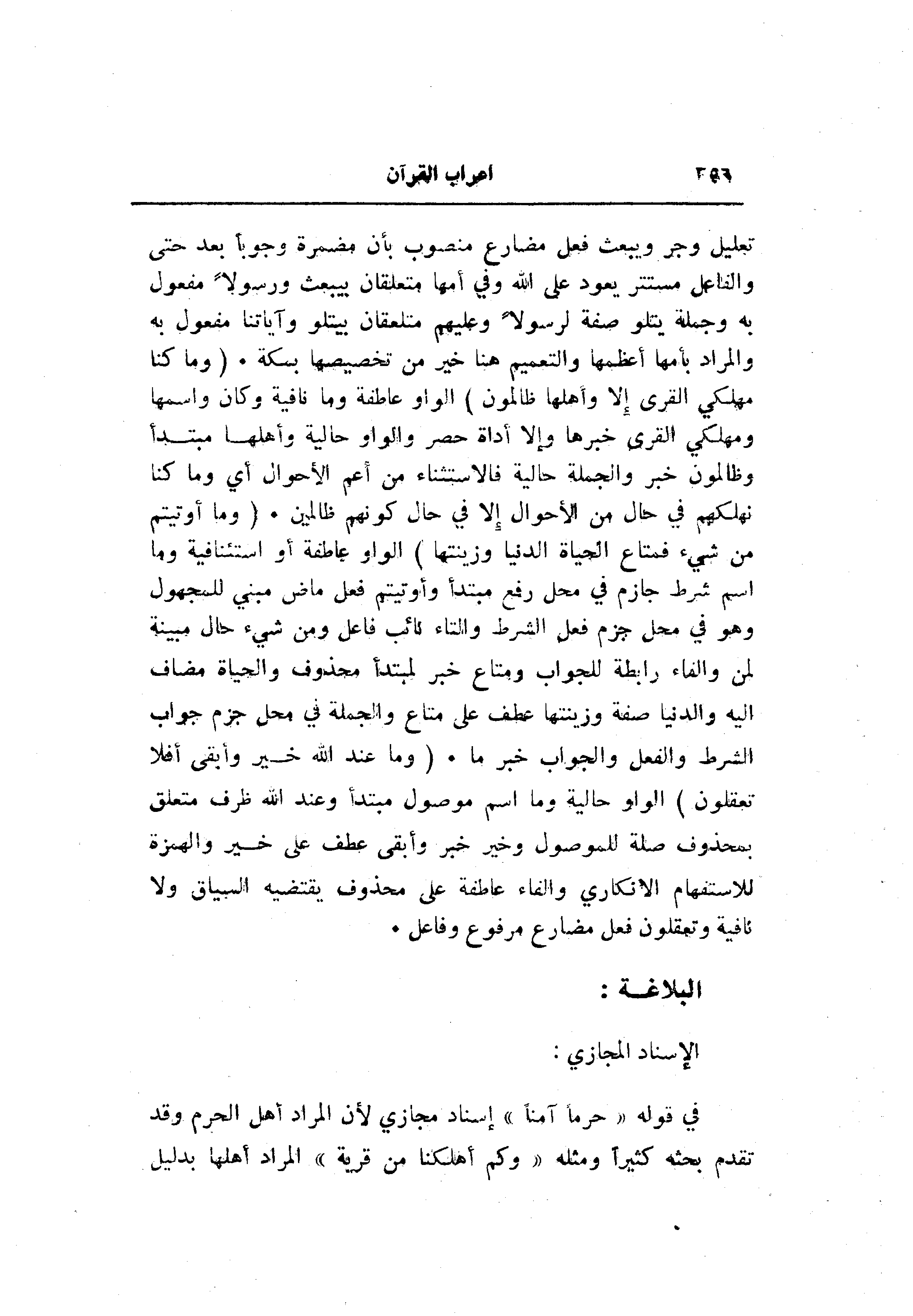 تعليل وجر ويبعث فعل مضارع منصوب بأن مضمرة وجوبا بعد حتى والفاعل مستتر يعود على الله وفي أمها متعلقان بيبعث ورسولا مفعول به وجملة يتلو صفة لرسولا وعليهم متعلقان بيتلو وآياتنا مفعول به والمراد بأمها أعظمها والتعميم هنا خير من تخصيصها بمكة. (وَما كُنَّا مُهْلِكِي الْقُرى إِلَّا وَأَهْلُها ظالِمُونَ) الواو عاطفة وما نافية وكان واسمها ومهلكي القرى خبرها وإلا أداة حصر والواو حالية وأهلها مبتدأ وظالمون خبر والجملة حالية فالاستثناء من أعم الأحوال أي وما كنا نهلكهم في حال من الأحوال إلا في حال كونهم ظالمين. (وَما أُوتِيتُمْ مِنْ شَيْءٍ فَمَتاعُ الْحَياةِ الدُّنْيا وَزِينَتُها) الواو عاطفة أو استئنافية وما اسم شرط جازم في محل رفع مبتدأ وأوتيتم فعل ماض مبني للمجهول وهو في محل جزم فعل الشرط والتاء نائب فاعل ومن شيء حال مبينة لمن والفاء رابطة للجواب ومتاع خبر لمبتدأ محذوف والحياة مضاف اليه والدنيا صفة وزينتها عطف على متاع والجملة في محل جزم جواب الشرط والفعل والجواب خبر ما. (وَما عِنْدَ اللَّهِ خَيْرٌ وَأَبْقى أَفَلا تَعْقِلُونَ) الواو حالية وما اسم موصول مبتدأ وعند الله ظرف متعلق بمحذوف صلة للموصول وخير خبر وأبقى عطف على خير والهمزة للاستفهام الانكاري والفاء عاطفة على محذوف يقتضيه السياق ولا نافية وتعقلون فعل مضارع مرفوع وفاعل.