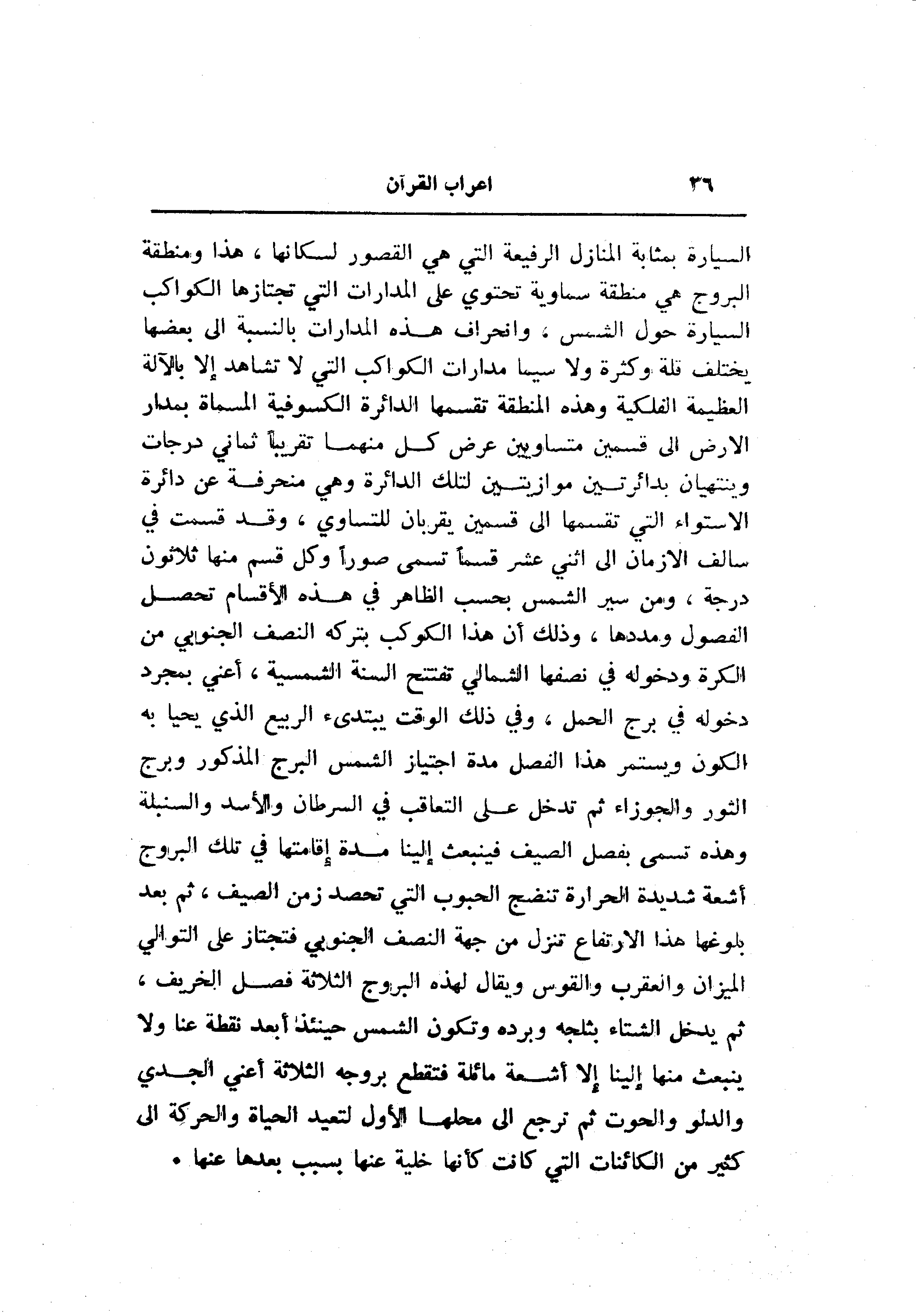 السيارة بمثابة المنازل الرفيعة التي هي القصور لسكانها، هذا ومنطقة البروج هي منطقة سماوية تحتوي على المدارات التي تجتازها الكواكب السيارة حول الشمس، وانحراف هذه المدارات بالنسبة الى بعضها يختلف قلة وكثرة ولا سيما مدارات الكواكب التي لا تشاهد إلا بالآلة العظيمة الفلكية وهذه المنطقة تقسمها الدائرة الكسوفية المسماة بمدار الأرض الى قسمين متساويين عرض كل منهما تقريبا ثماني درجات وينتهيان بدائرتين موازيتين لتلك الدائرة وهي منحرفة عن دائرة الاستواء التي تقسمها الى قسمين يقربان للتساوي، وقد قسمت في سالف الأزمان الى اثني عشر قسما تسمى صورا وكل قسم منها ثلاثون درجة، ومن سير الشمس بحسب الظاهر في هذه الأقسام تحصل الفصول ومددها، وذلك أن هذا الكوكب بتركه النصف الجنوبي من الكرة ودخوله في نصفها الشمالي تفتتح السنة الشمسية، أعني بمجرد دخوله في برج الحمل، وفي ذلك الوقت يبتدىء الربيع الذي يحيا به الكون ويستمر هذا الفصل مدة اجتياز الشمس البرج المذكور وبرج الثور والجوزاء ثم تدخل على التعاقب في السرطان والأسد والسنبلة وهذه تسمى بفصل الصيف فينبعث إلينا مدة إقامتها في تلك البروج أشعة شديدة الحرارة تنضج الحبوب التي تحصد زمن الصيف، ثم بعد بلوغها هذا الارتفاع تنزل من جهة النصف الجنوبي فتجتاز على التوالي الميزان والعقرب والقوس ويقال لهذه البروج الثلاثة فصل الخريف، ثم يدخل الشتاء بثلجه وبرده وتكون الشمس حينئذ أبعد نقطة عنا ولا ينبعث منها إلينا إلا أشعة مائلة فتقطع بروجه الثلاثة أعني الجدي والدلو والحوت ثم ترجع الى محلها الأول لتعيد الحياة والحركة الى كثير من الكائنات التي كانت كأنها خلية عنها بسبب بعدها عنها.