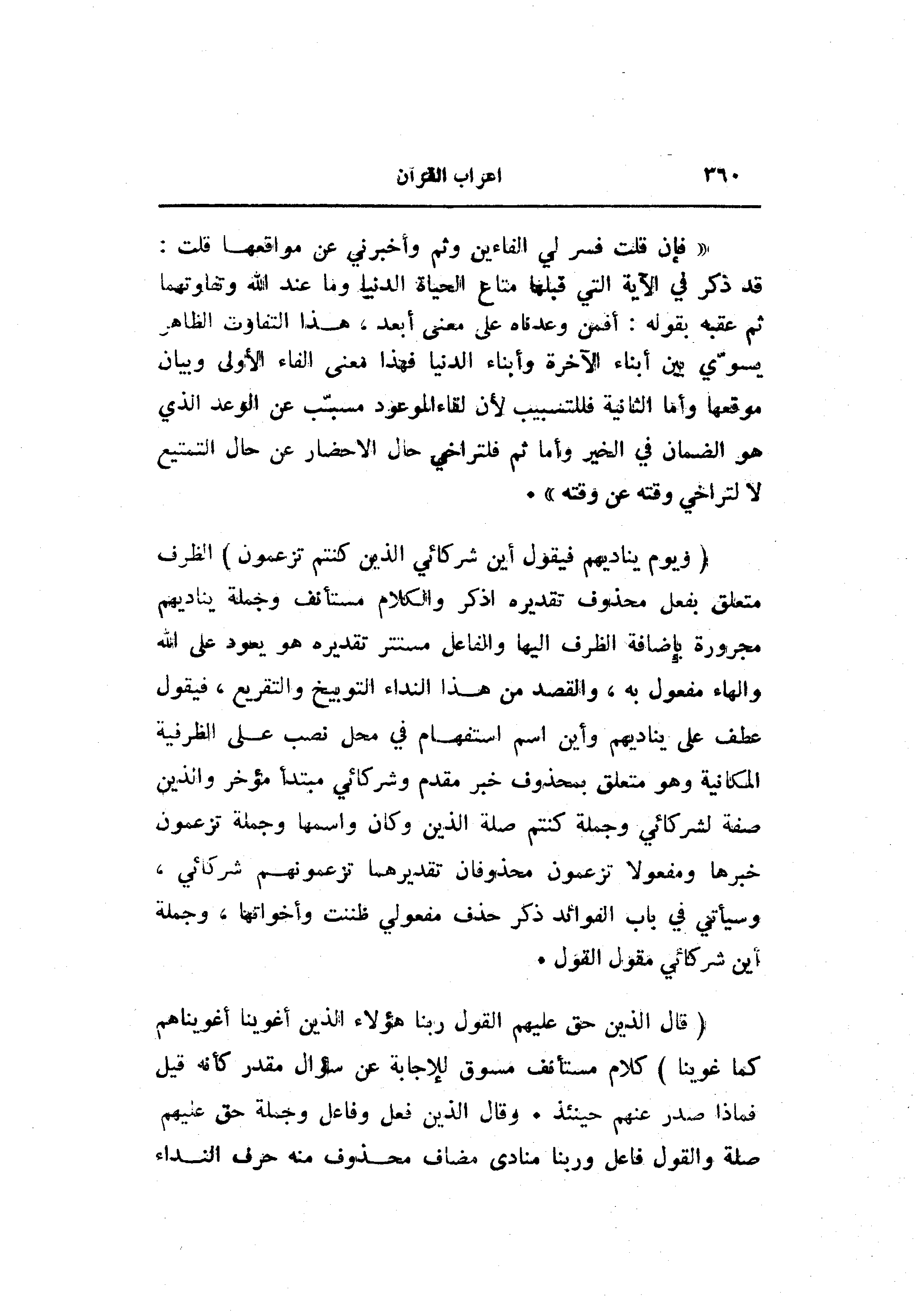 (وَيَوْمَ يُنادِيهِمْ فَيَقُولُ أَيْنَ شُرَكائِيَ الَّذِينَ كُنْتُمْ تَزْعُمُونَ) الظرف متعلق بفعل محذوف تقديره اذكر والكلام مستأنف وجملة يناديهم مجرورة بإضافة الظرف إليها والفاعل مستتر تقديره هو يعود على الله والهاء مفعول به، والقصد من هذا النداء التوبيخ والتقريع، فيقول عطف على يناديهم وأين اسم استفهام في محل نصب على الظرفية المكانية وهو متعلق بمحذوف خبر مقدم وشركائي مبتدأ مؤخر والذين صفة لشركائي وجملة كنتم صلة الذين وكان واسمها وجملة تزعمون خبرها ومفعولا تزعمون محذوفان تقديرهما تزعمونهم شركائي، وسيأتي في باب الفوائد ذكر حذف مفعولي ظننت وأخواتها، وجملة أين شركائي مقول القول.