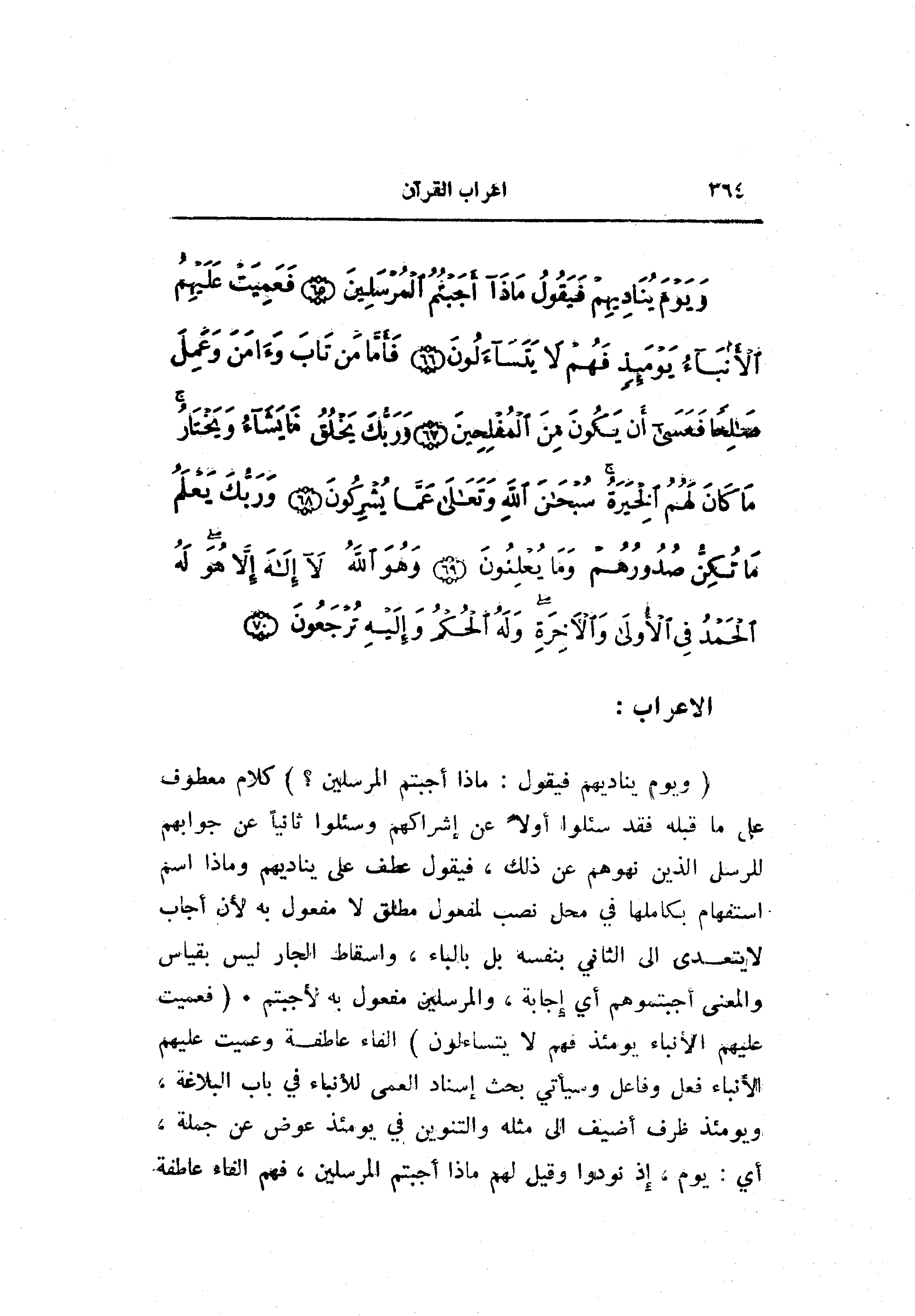 (وَيَوْمَ يُنادِيهِمْ فَيَقُولُ: ماذا أَجَبْتُمُ الْمُرْسَلِينَ؟) كلام معطوف على ما قبله فقد سئلوا أولا عن إشراكهم وسئلوا ثانيا عن جوابهم للرسل الذين نهوهم عن ذلك، فيقول عطف على يناديهم وماذا اسم استفهام بكاملها في محل نصب لمفعول مطلق لا مفعول به لأن أجاب لا يتعدى الى الثاني بنفسه بل بالباء، وإسقاط الجار ليس بقياس والمعنى أجبتموهم أي إجابة، والمرسلين مفعول به لأجبتم. (فَعَمِيَتْ عَلَيْهِمُ الْأَنْباءُ يَوْمَئِذٍ فَهُمْ لا يَتَساءَلُونَ) الفاء عاطفة وعميت عليهم الأنباء فعل وفاعل وسيأتي بحث إسناد العمى للأنباء في باب البلاغة، ويومئذ ظرف أضيف الى مثله والتنوين في يومئذ عوض عن جملة، أي: يوم، إذ نودوا وقيل لهم ماذا أجبتم المرسلين، فهم الفاء عاطفة