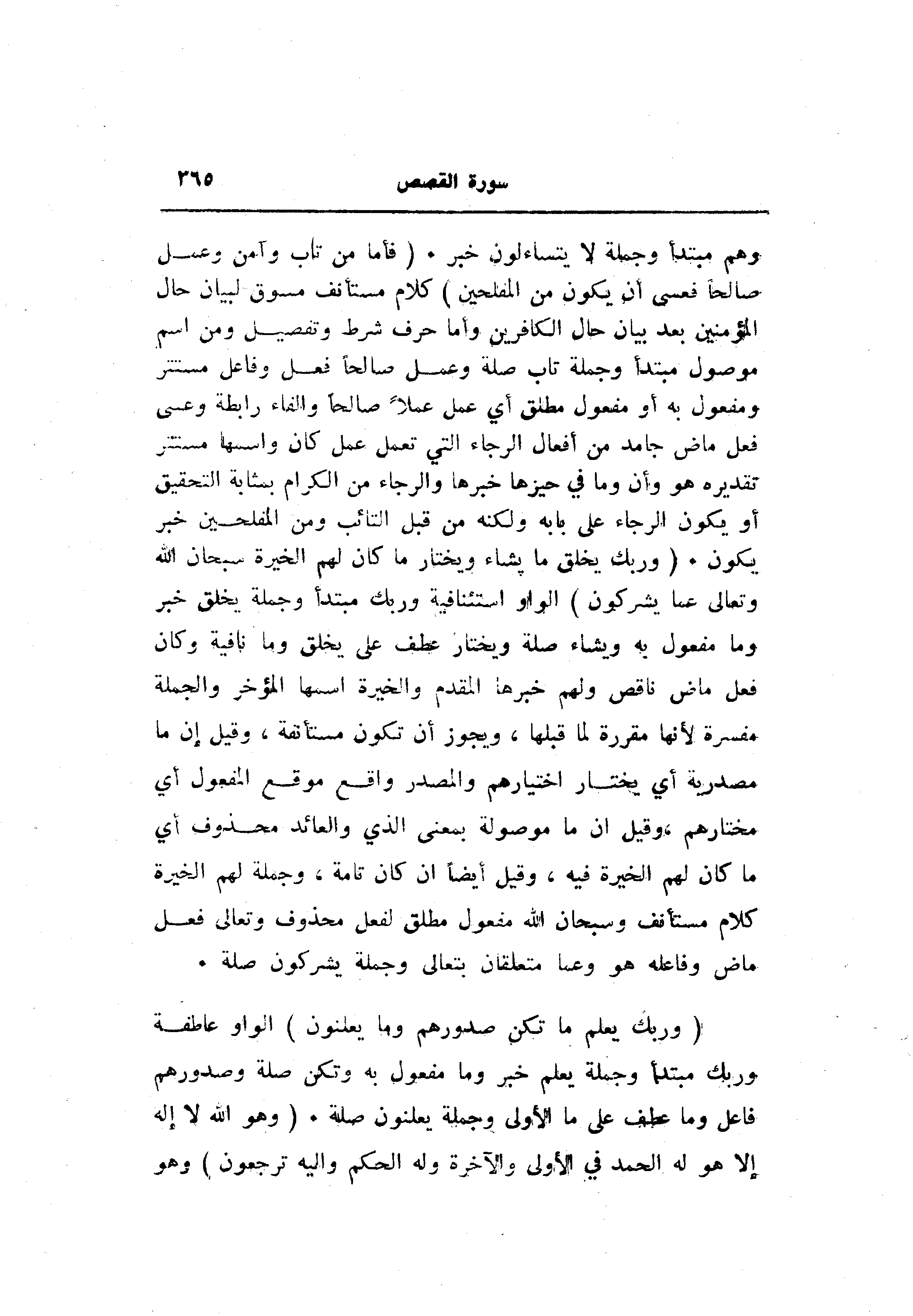 وهم مبتدأ وجملة لا يتساءلون خبر. (فَأَمَّا مَنْ تابَ وَآمَنَ وَعَمِلَ صالِحاً فَعَسى أَنْ يَكُونَ مِنَ الْمُفْلِحِينَ) كلام مستأنف مسوق لبيان حال المؤمنين بعد بيان حال الكافرين وأما حرف شرط وتفصيل ومن اسم موصول مبتدأ وجملة تاب صلة وعمل صالحا فعل وفاعل مستتر ومفعول به أو مفعول مطلق أي عمل عملا صالحا والفاء رابطة وعسى فعل ماض جامد من أفعال الرجاء التي تعمل عمل كان واسمها مستتر تقديره هو وأن وما في حيزها خبرها والرجاء من الكرام بمثابة التحقيق أو يكون الرجاء على بابه ولكنه من قبل التائب ومن المفلحين خبر يكون. (وَرَبُّكَ يَخْلُقُ ما يَشاءُ وَيَخْتارُ ما كانَ لَهُمُ الْخِيَرَةُ سُبْحانَ اللَّهِ وَتَعالى عَمَّا يُشْرِكُونَ) الواو استئنافية وربك مبتدأ وجملة يخلق خبر وما مفعول به ويشاء صلة ويختار عطف على يخلق وما نافية وكان فعل ماض ناقص ولهم خبرها المقدم والخيرة اسمها المؤخر والجملة مفسرة لأنها مقررة لما قبلها، ويجوز أن تكون مستأنفة، وقيل إن ما مصدرية أي يختار اختيارهم والمصدر واقع موقع المفعول أي مختارهم، وقيل ان ما موصولة بمعنى الذي والعائد محذوف أي ما كان لهم الخيرة فيه، وقيل أيضا ان كان تامة، وجملة لهم الخيرة كلام مستأنف وسبحان الله مفعول مطلق لفعل محذوف وتعالى فعل ماض وفاعله هو وعما متعلقان بتعالى وجملة يشركون صلة.