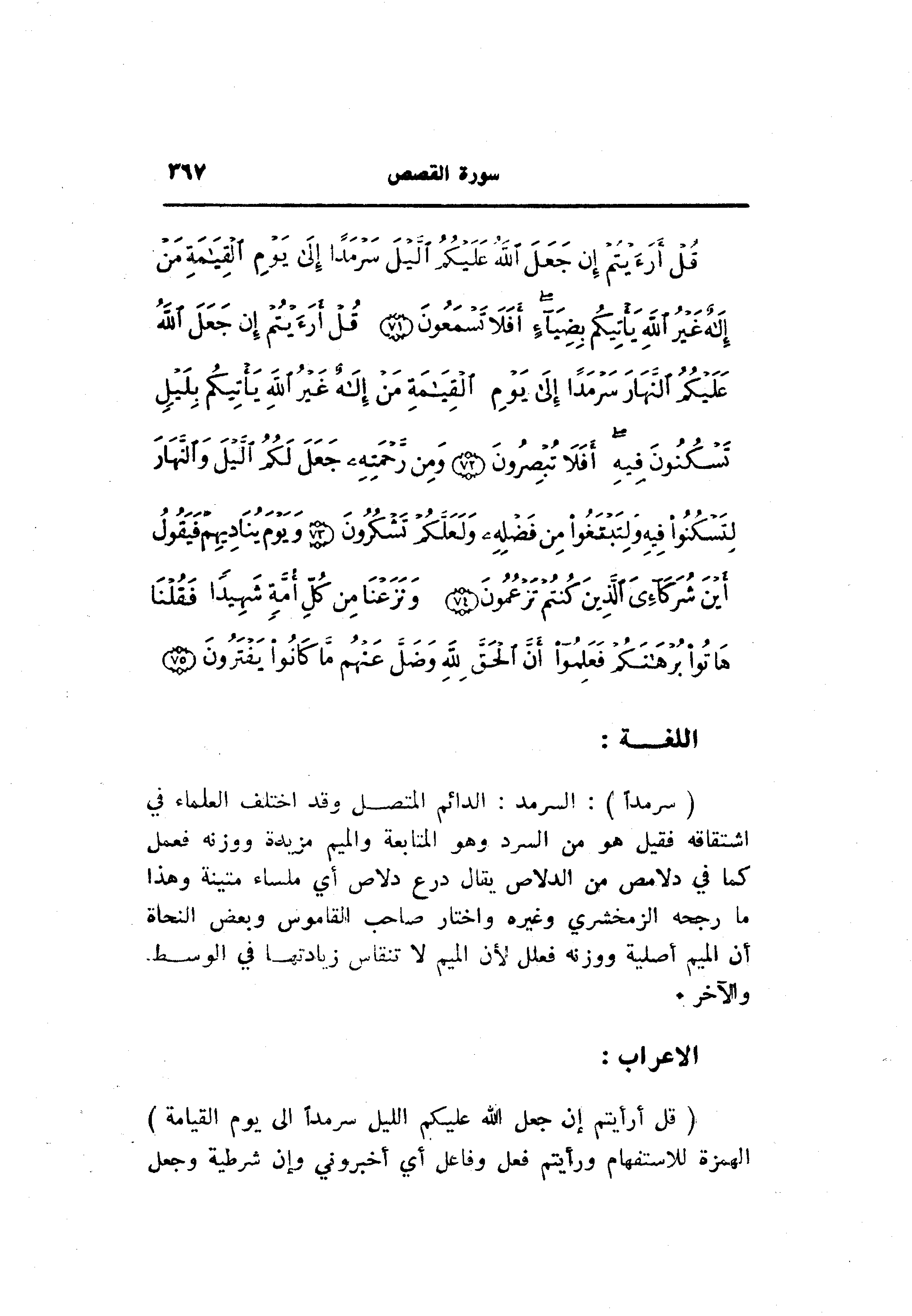 (سَرْمَداً) : السرمد: الدائم المتصل وقد اختلف العلماء في اشتقاقه فقيل هو من السرد وهو المتابعة والميم مزيدة ووزنه فعمل كما في دلامص من الدلاص يقال درع دلاص أي ملساء متينة وهذا ما رجحه الزمخشري وغيره واختار صاحب القاموس وبعض النحاة أن الميم أصلية ووزنه فعلل لأن الميم لا تنقاس زيادتها في الوسط والآخر.