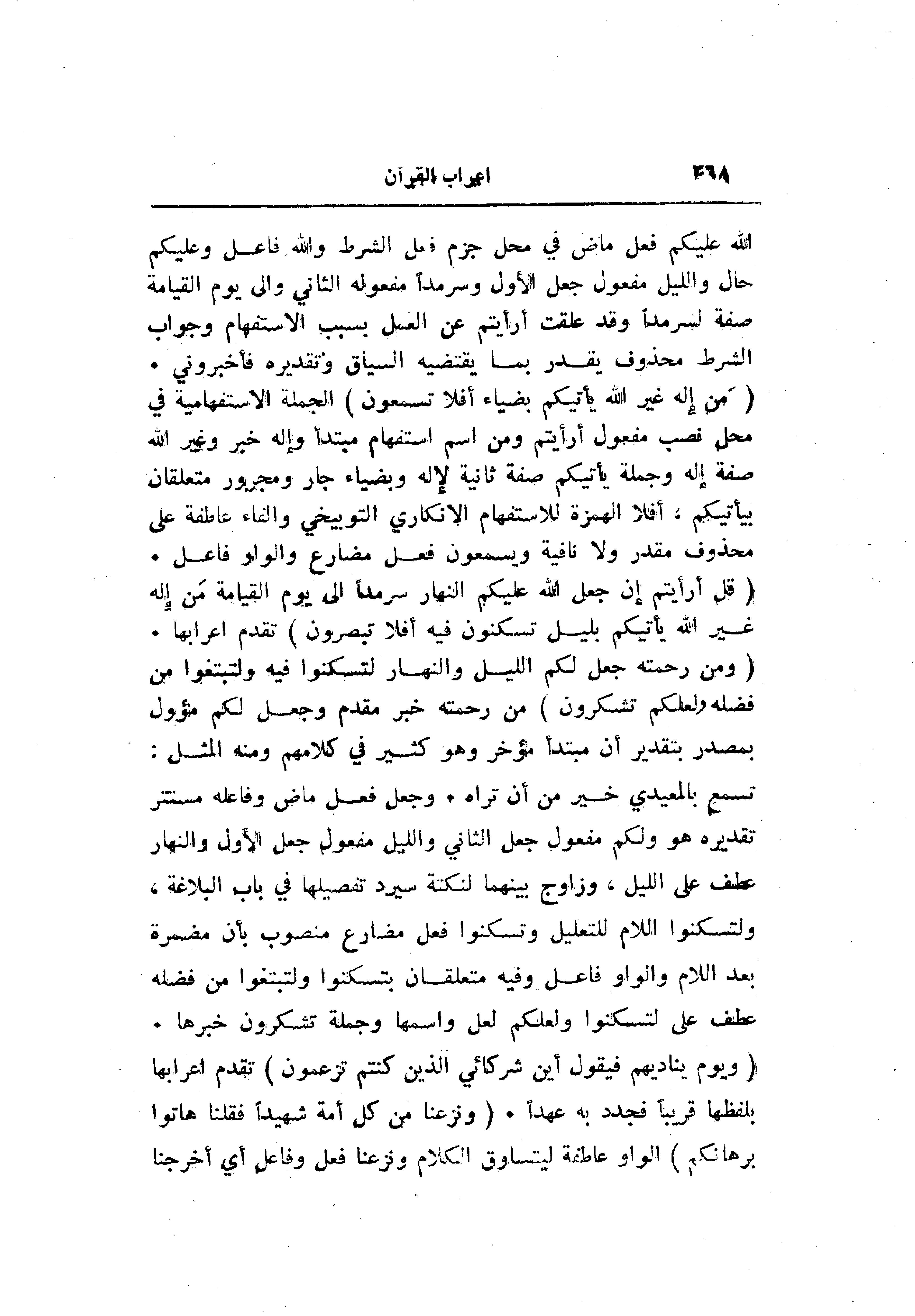 تسمع بالمعيدي خير من أن تراه. وجعل فعل ماض وفاعله مستتر تقديره هو ولكم مفعول جعل الثاني والليل مفعول جعل الأول والنهار عطف على الليل، وزواج بينهما لنكتة سيرد تفصيلها في باب البلاغة، ولتسكنوا اللام للتعليل وتسكنوا فعل مضارع منصوب بأن مضمرة بعد اللام والواو فاعل وفيه متعلقان بتسكنوا ولتبتغوا من فضله عطف على لتسكنوا ولعلكم لعل واسمها وجملة تشكرون خبرها.