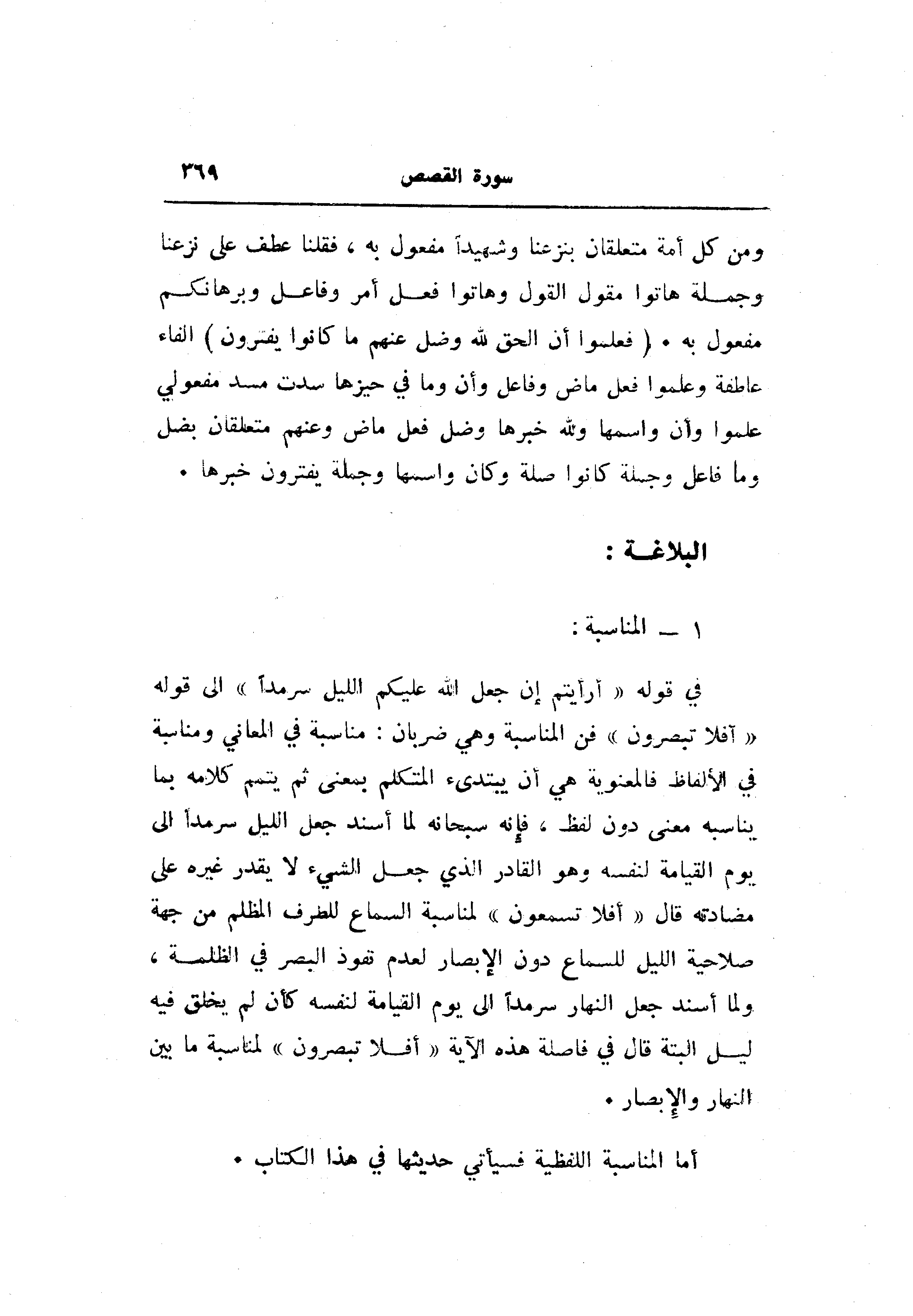 في قوله «أرأيتم إن جعل الله عليكم الليل سرمدا» الى قوله «أفلا تبصرون» فن المناسبة وهي ضربان: مناسبة في المعاني ومناسبة في الألفاظ فالمعنوية هي أن يبتدىء المتكلم بمعنى ثم يتمم كلامه بما يناسبه معنى دون لفظ، فإنه سبحانه لما أسند جعل الليل سرمدا الى يوم القيامة لنفسه وهو القادر الذي جعل الشيء لا يقدر غيره على مضادته قال «أفلا تسمعون» لمناسبة السماع للطرف المظلم من جهة صلاحية الليل للسماع دون الإبصار لعدم نفوذ البصر في الظلمة، ولما أسند جعل النهار سرمدا الى يوم القيامة لنفسه كأن لم يخلق فيه ليل البتة قال في فاصلة هذه الآية «أفلا تبصرون» لمناسبة ما بين النهار والإبصار.