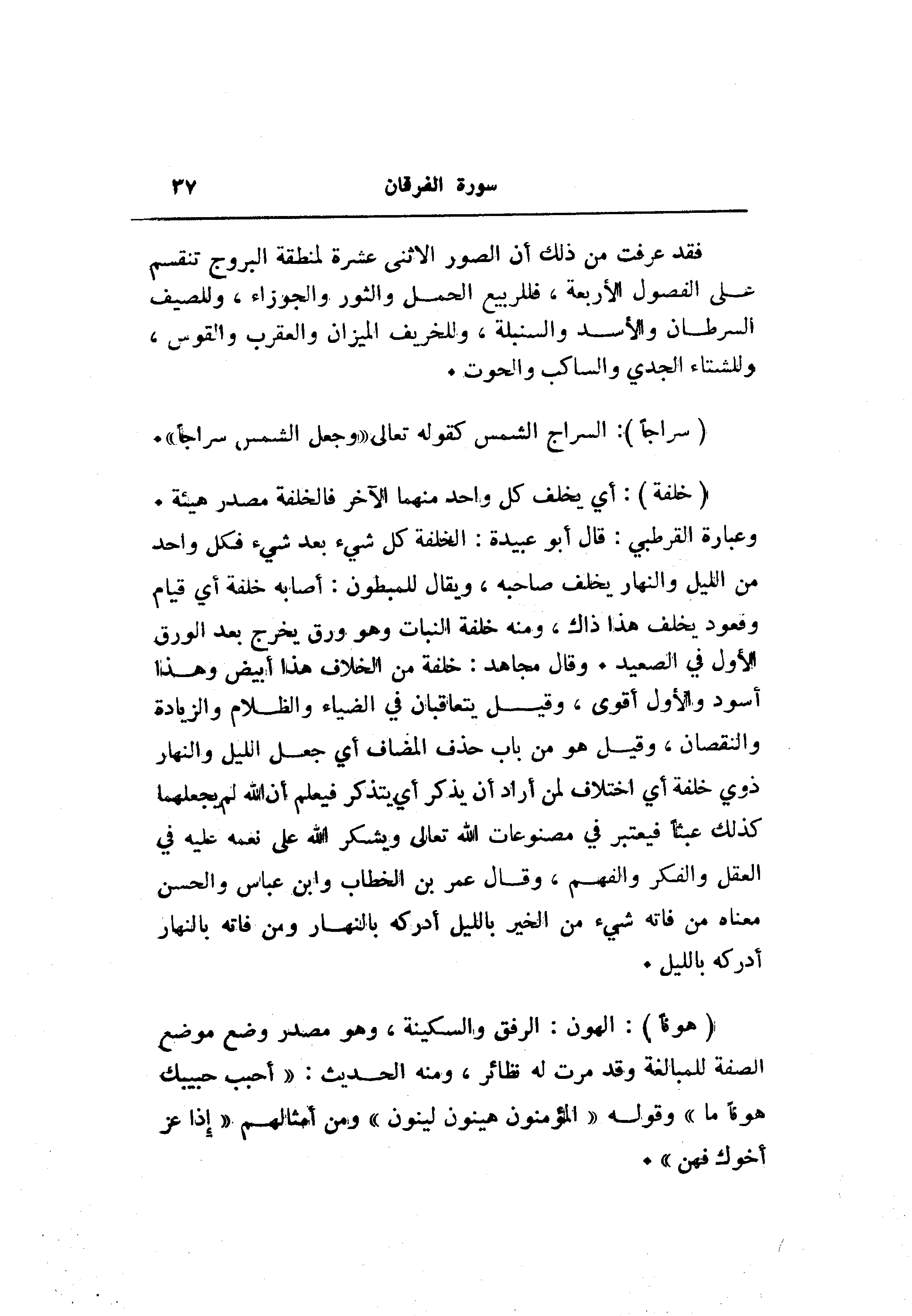 وعبارة القرطبي: قال أبو عبيدة: الخلفة كل شيء بعد شيء فكل واحد من الليل والنهار يخلف صاحبه، ويقال للمبطون: أصابه خلفة أي قيام وقعود يخلف هذا ذاك، ومنه خلفة النبات وهو ورق يخرج بعد الورق الأول في الصعيد. وقال مجاهد: خلفة من الخلاف هذا أبيض وهذا أسود والأول أقوى، وقيل يتعاقبان في الضياء والظلام والزيادة والنقصان، وقيل هو من باب حذف المضاف أي جعل الليل والنهار ذوي خلفة أي اختلاف لمن أراد أن يذكر أي يتذكر فيعلم أن الله لم يجعلهما كذلك عبثا فيعتبر في مصنوعات الله تعالى ويشكر الله على نعمه عليه في العقل والفكر والفهم، وقال عمر بن الخطاب وابن عباس والحسن معناه من فاته شيء من الخير بالليل أدركه بالنهار ومن فاته بالنهار أدركه بالليل.