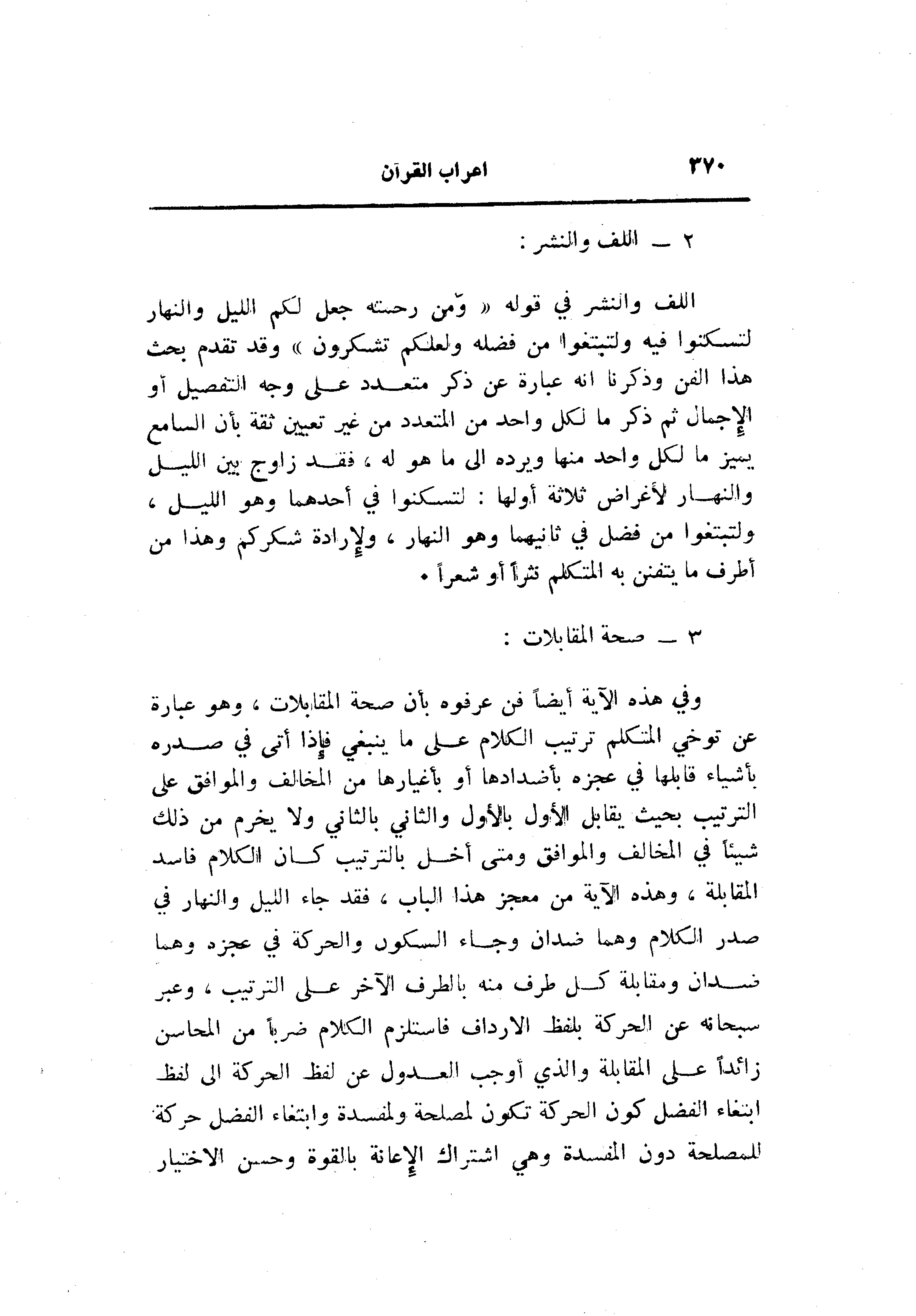 اللف والنشر في قوله «ومن رحمته جعل لكم الليل والنهار لتسكنوا فيه ولتبتغوا من فضله ولعلكم تشكرون» وقد تقدم بحث هذا الفن وذكرنا انه عبارة عن ذكر متعدد على وجه التفصيل أو الإجمال ثم ذكر ما لكل واحد من المتعدد من غير تعيين ثقة بأن السامع يميز ما لكل واحد منها ويرده الى ما هو له، فقد زاوج بين الليل والنهار لأغراض ثلاثة أولها: لتسكنوا في أحدهما وهو الليل، ولتبتغوا من فضل في ثانيهما وهو النهار، ولإرادة شكركم وهذا من أطرف ما يتفنن به المتكلم نثرا أو شعرا.