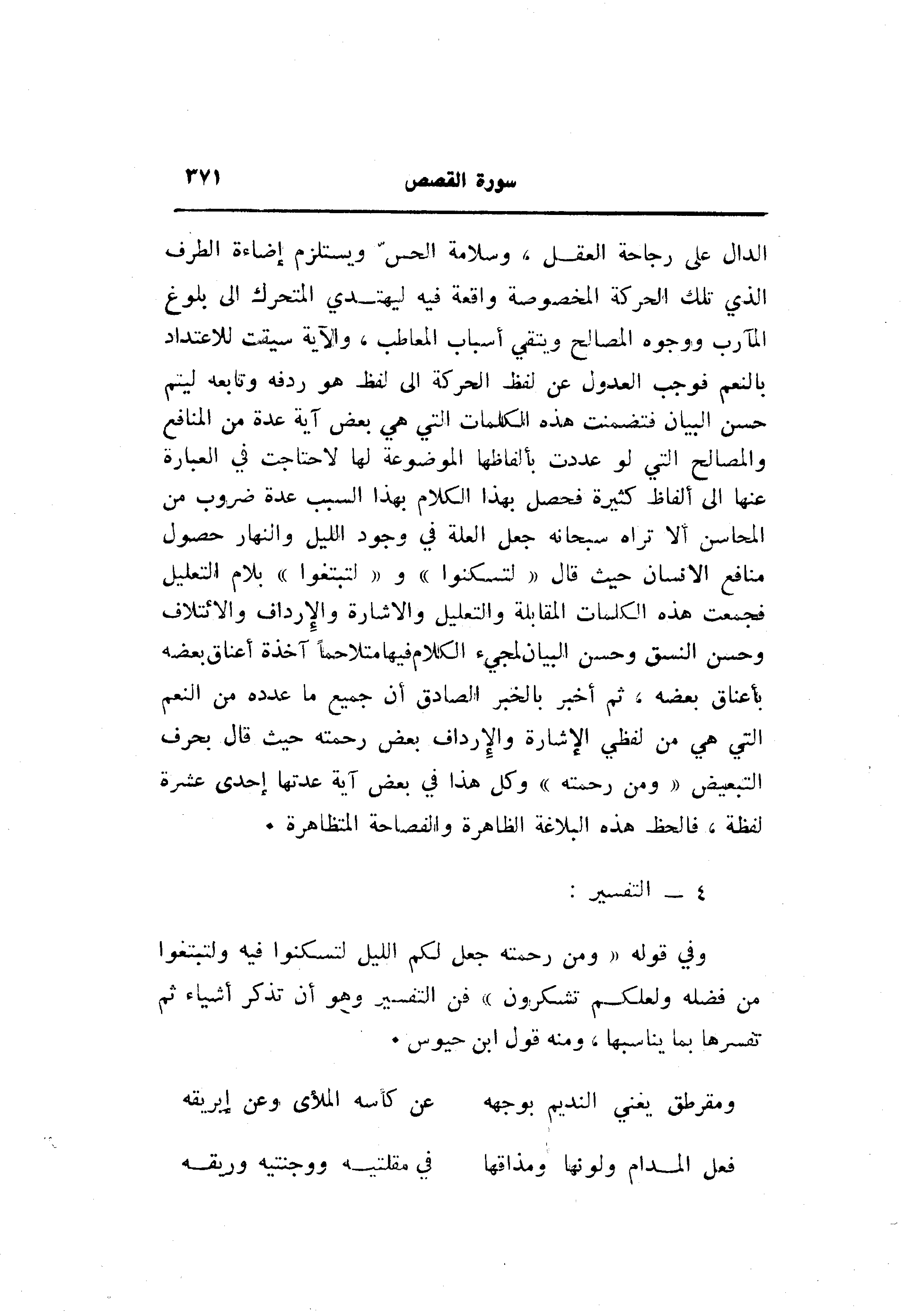 وفي قوله «ومن رحمته جعل لكم الليل لتسكنوا فيه ولتبتغوا من فضله ولعلكم تشكرون» فن التفسير وهو أن تذكر أشياء ثم تفسرها بما يناسبها، ومنه قول ابن حيوس.