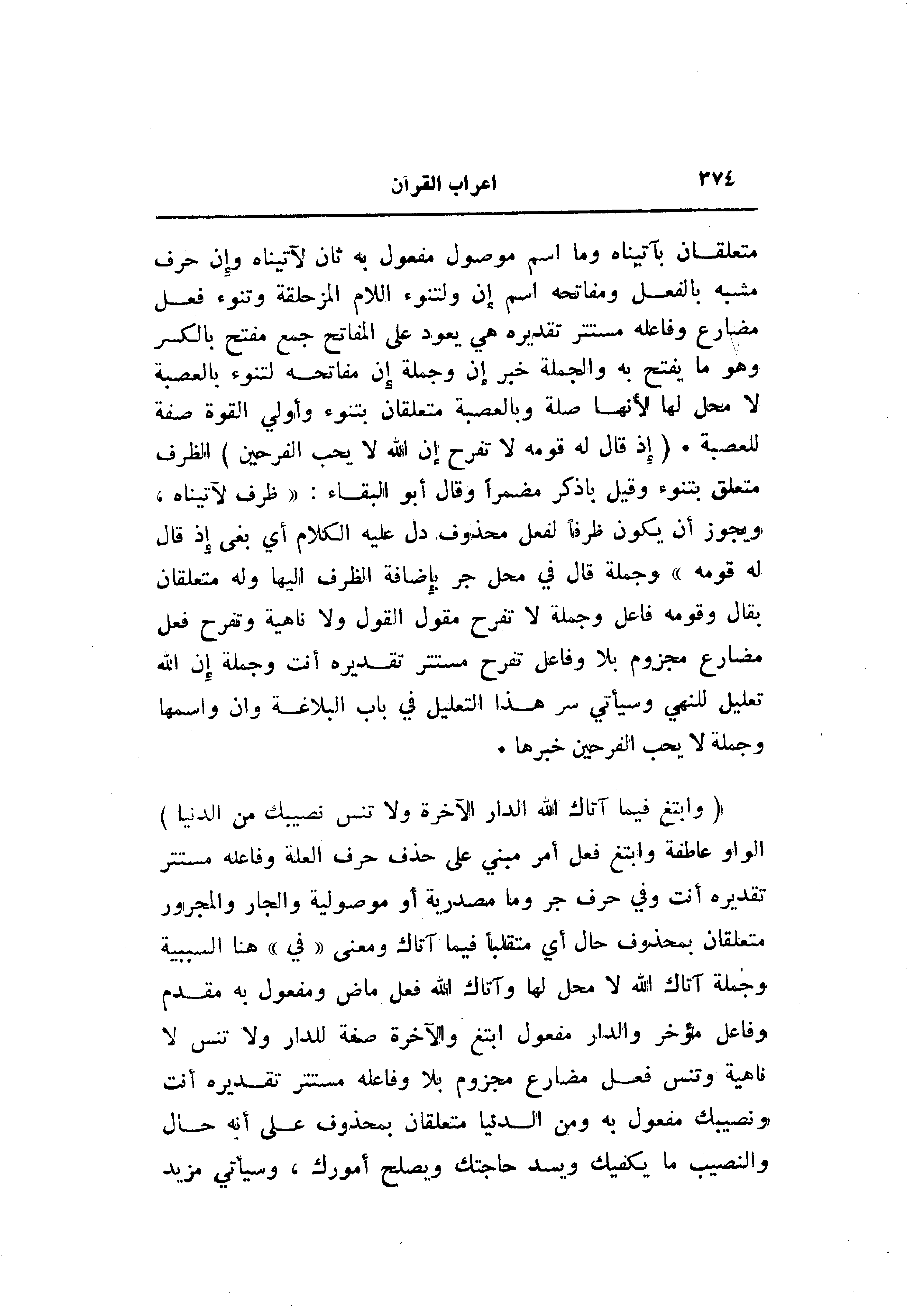 (وَابْتَغِ فِيما آتاكَ اللَّهُ الدَّارَ الْآخِرَةَ وَلا تَنْسَ نَصِيبَكَ مِنَ الدُّنْيا) الواو عاطفة وابتغ فعل أمر مبني على حذف حرف العلة وفاعله مستتر تقديره أنت وفي حرف جر وما مصدرية أو موصولية والجار والمجرور متعلقان بمحذوف حال أي متقلبا فيما آتاك ومعنى «في» هنا السببية وجملة آتاك الله لا محل لها وآتاك الله فعل ماض ومفعول به مقدم وفاعل مؤخر والدار مفعول ابتغ والآخرة صفة للدار ولا تنس لا ناهية وتنس فعل مضارع مجزوم بلا وفاعله مستتر تقديره أنت ونصيبك مفعول به ومن الدنيا متعلقان بمحذوف على أنه حال والنصيب ما يكفيك ويسد حاجتك ويصلح أمورك، وسيأتي مزيد
