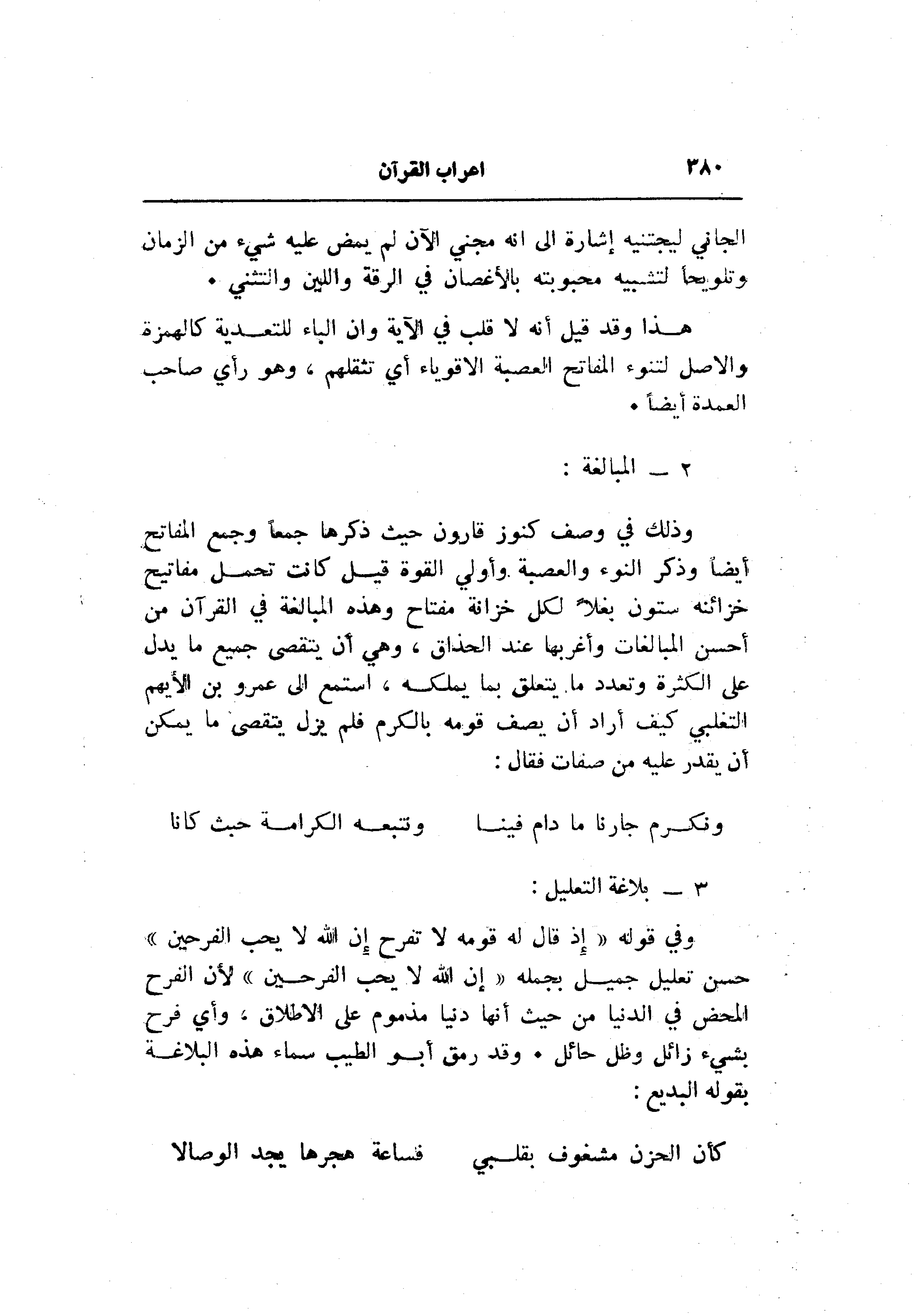 وفي قوله «إذ قال له قومه لا تفرح إن الله لا يحب الفرحين» حسن تعليل جميل بجمله «إن الله لا يحب الفرحين» لأن الفرح المحض في الدنيا من حيث أنها دنيا مذموم على الإطلاق، وأي فرح بشيء زائل وظل حائل. وقد رمق أبو الطيب سماء هذه البلاغة بقوله البديع: