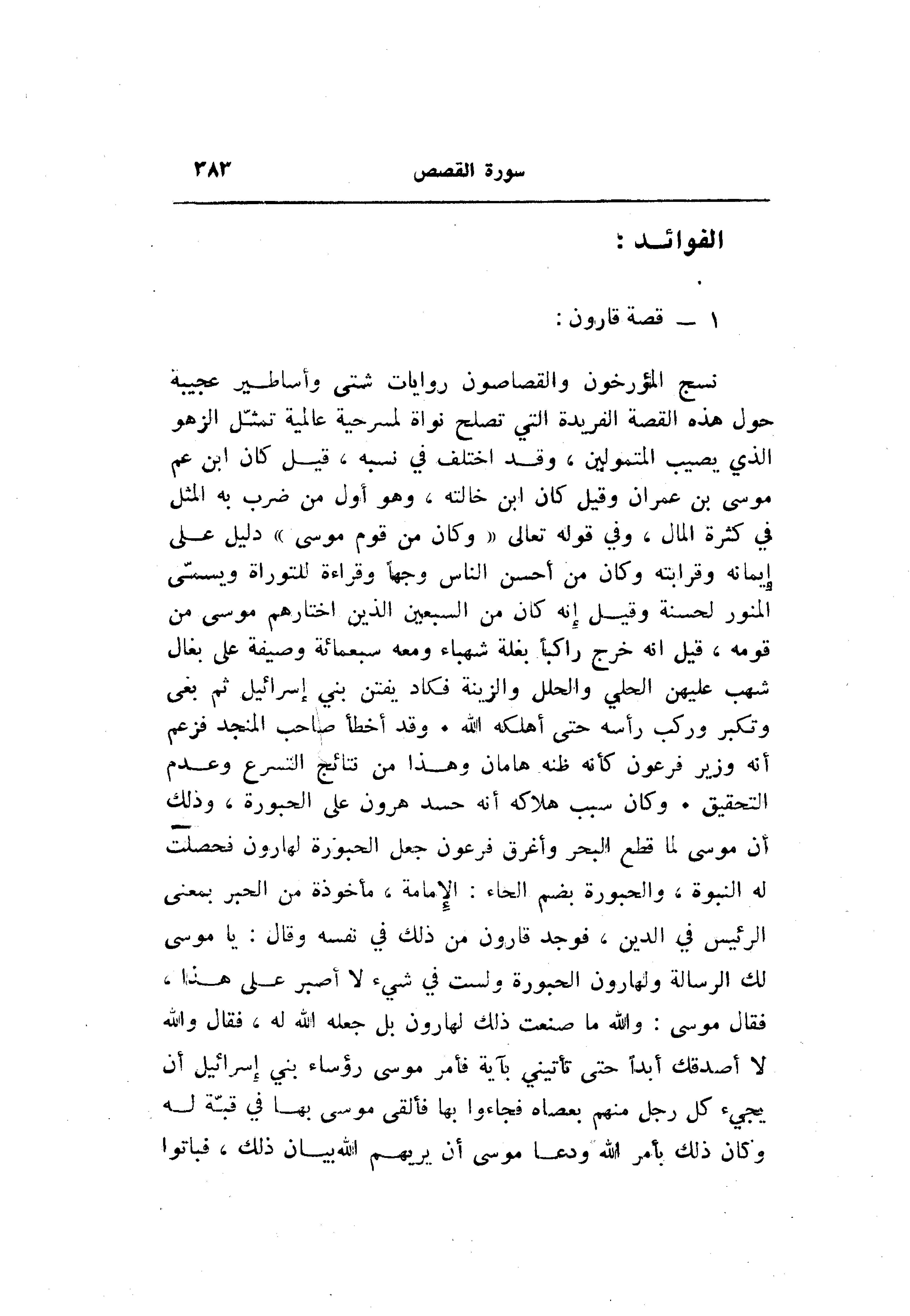 نسج المؤرخون والقصاصون روايات شتى وأساطير عجيبة حول هذه القصة الفريدة التي تصلح نواة لمسرحية عالمية تمثّل الزهو الذي يصيب المتمولين، وقد اختلف في نسبه، قيل كان ابن عم موسى بن عمران وقيل كان ابن خالته، وهو أول من ضرب به المثل في كثرة المال، وفي قوله تعالى «وكان من قوم موسى» دليل على إيمانه وقرابته وكان من أحسن الناس وجها وقراءة للتوراة ويسمّى المنور لحسنة وقيل إنه كان من السبعين الذين اختارهم موسى من قومه، قيل انه خرج راكبا بغلة شهباء ومعه سبعمائة وصيفة على بغال شهب عليهن الحلي والحلل والزينة فكاد يفتن بني إسرائيل ثم بغى وتكبر وركب رأسه حتى أهلكه الله. وقد أخطأ صاحب المنجد فزعم أنه وزير فرعون كأنه ظنه هامان وهذا من نتائج التسرع وعدم التحقيق. وكان سبب هلاكه أنه حسد هرون على الحبورة، وذلك أن موسى لما قطع البحر وأغرق فرعون جعل الحبورة لهارون فحصلت له النبوة، والحبورة بضم الحاء: الإمامة، مأخوذة من الحبر بمعنى الرئيس في الدين، فوجد قارون من ذلك في نفسه وقال: يا موسى لك الرسالة ولهارون الحبورة ولست في شيء لا أصبر على هذا، فقال موسى: والله ما صنعت ذلك لهارون بل جعله الله له، فقال والله لا أصدقك أبدا حتى تأتيني بآية فأمر موسى رؤساء بني إسرائيل أن يجيء كل رجل منهم بعصاه فجاءوا بها فألقى موسى بها في قبّة له وكان ذلك بأمر الله ودعا موسى أن يريهم الله بيان ذلك، فباتوا