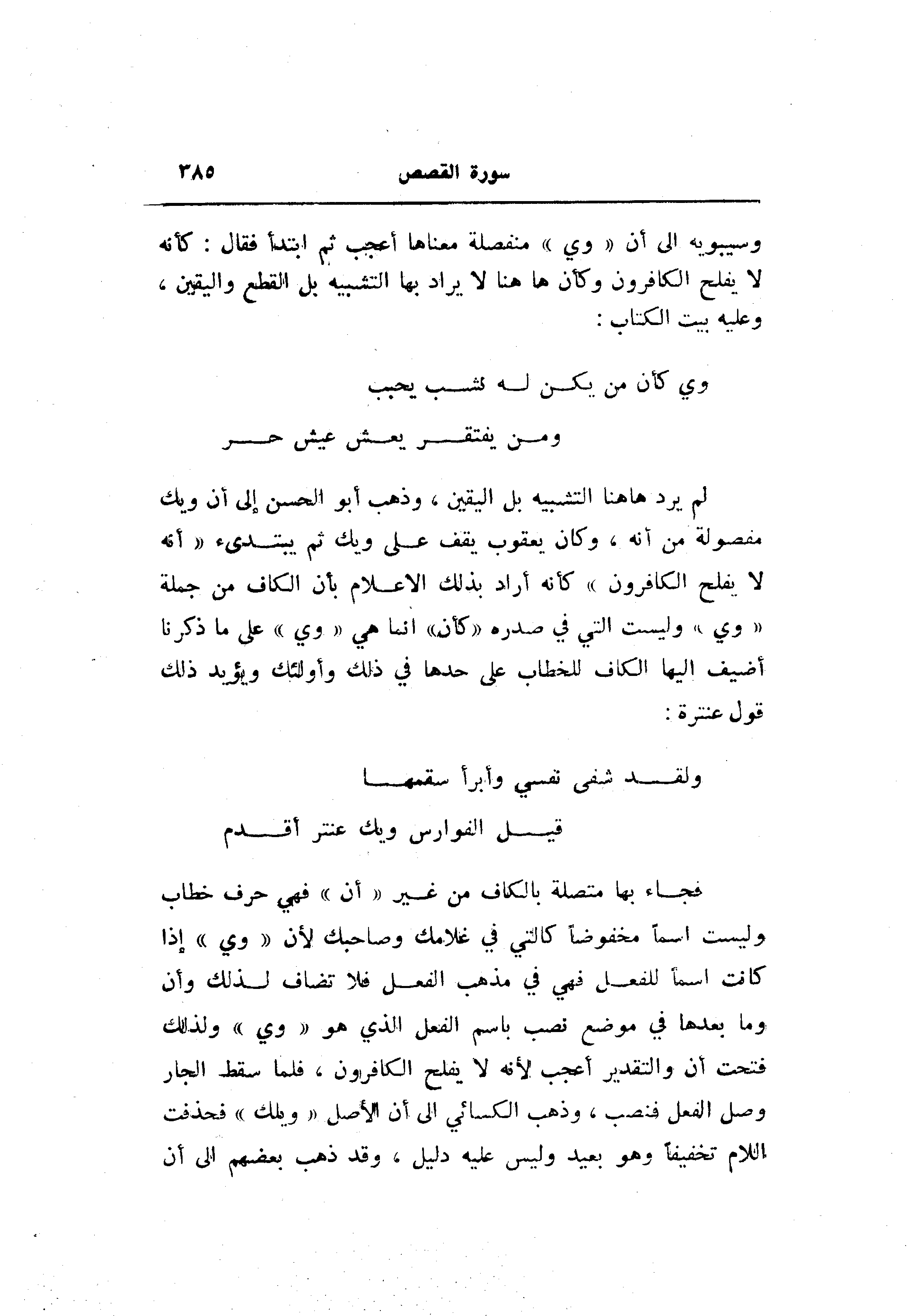 لم يرد هاهنا التشبيه بل اليقين، وذهب أبو الحسن إلى أن ويك مفصولة من أنه، وكان يعقوب يقف على ويك ثم يبتدىء «أنه لا يفلح الكافرون» كأنه أراد بذلك الاعلام بأن الكاف من جملة «وي» وليست التي في صدره «كأن» انما هي «وي» على ما ذكرنا أضيف إليها الكاف للخطاب على حدها في ذلك وأولئك ويؤيد ذلك قول عنترة: